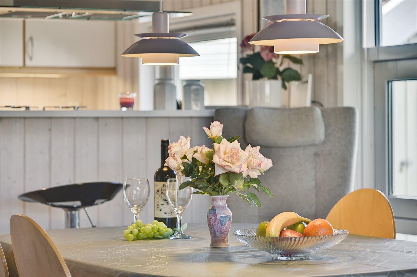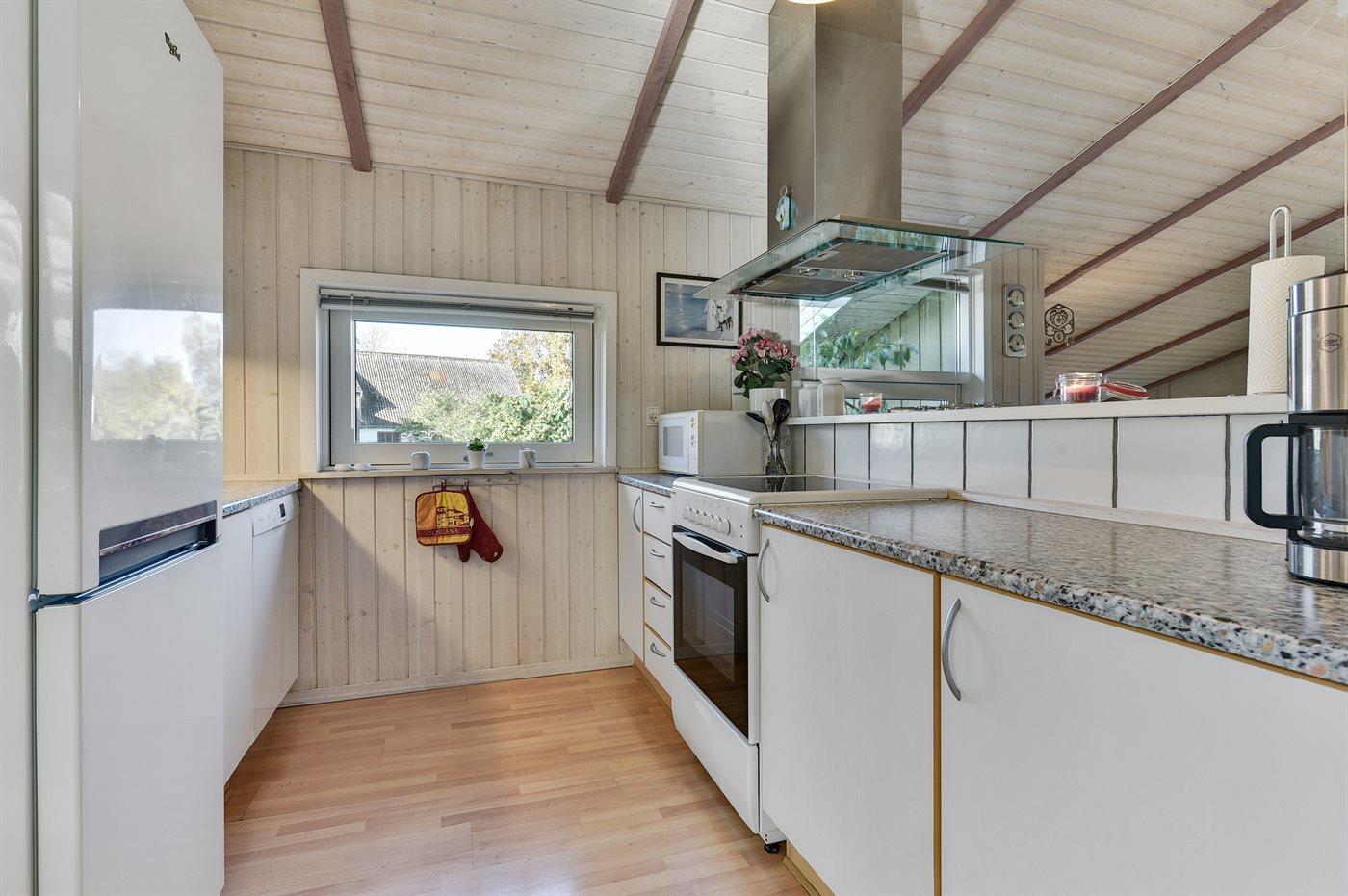Køkkenet er udstyret med 1 køleskab med 100 l frostboks. Komfur med 4 keramiske kogeplader, bageovn, mikrobølgeovn samt opvaskemaskine.