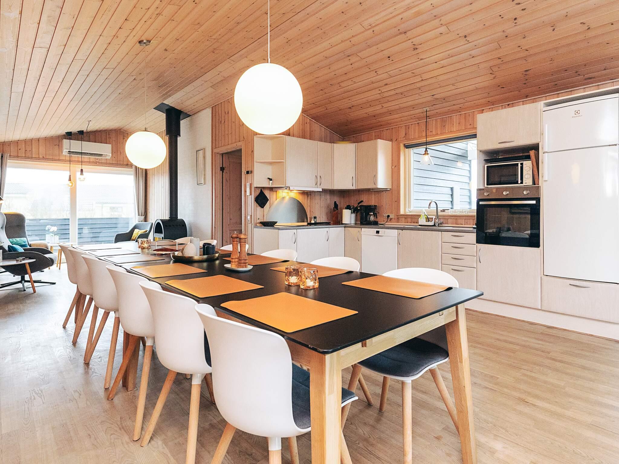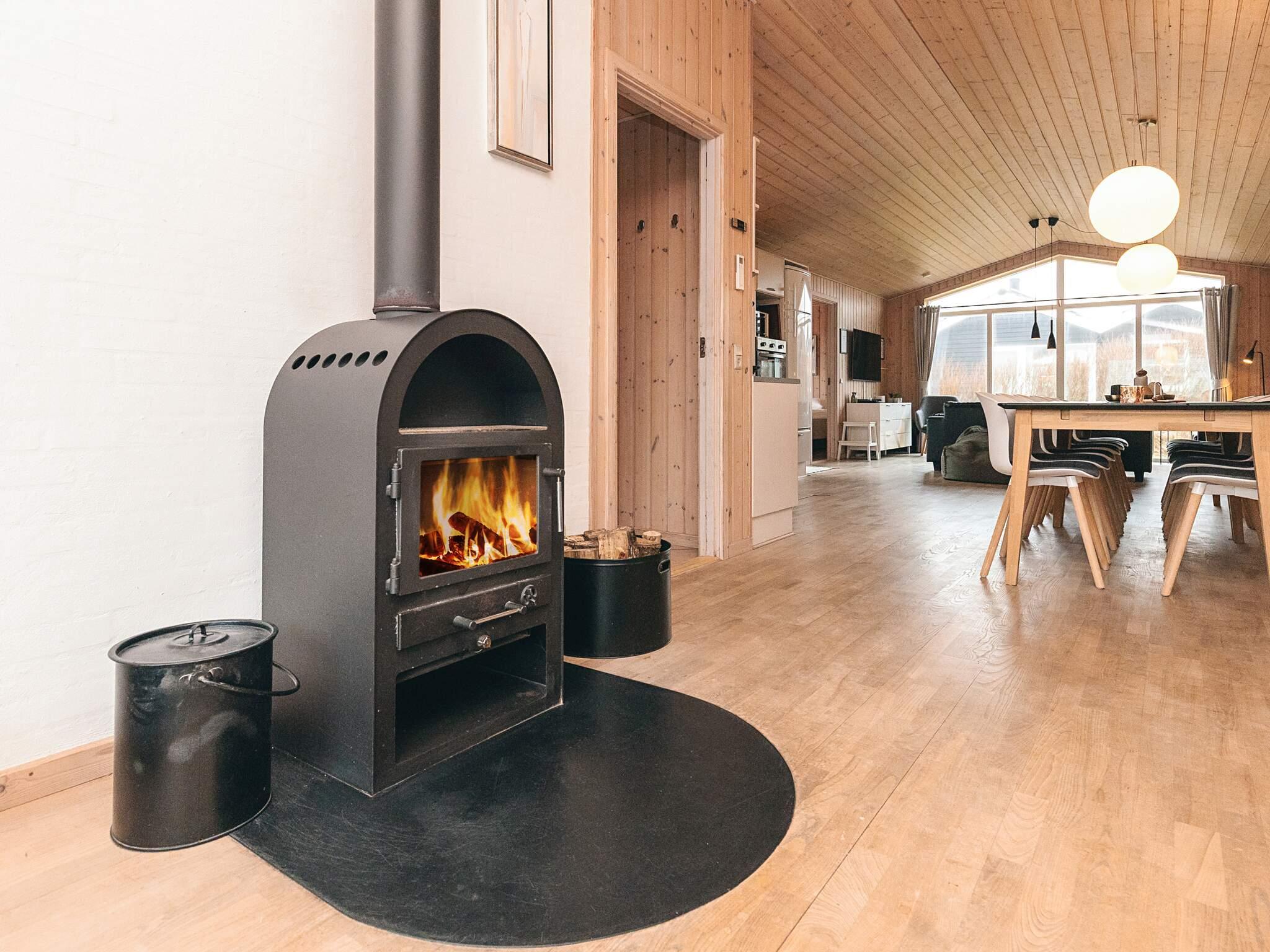 Sommerhuset er lyst og rummeligt med en god atmosfære og en dejlig indretning. Den store rum med stue, spiseafdeling samt åbent køkken gør det muligt at være fælles om alle feriens gøremål. Her er også masser af plads til hygge og afslapning. Til vinterhalvåret er der i disse rum gulvvarme. Stuen har både TV og brændeovn. Det meste af huset har trægulve. Med brændeovn samt varmepumpe er forbruget også energivenligt.