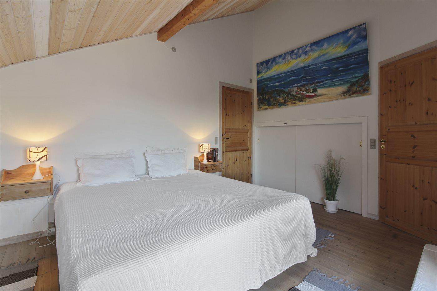 Der er i alt 3 soveværelser. Sovepladserne fordeler sig på: 4 sovepladser i dobbeltsenge. 1 soveplads i sovesofa (enkelt). Derudover er der 1 stk. barneseng.