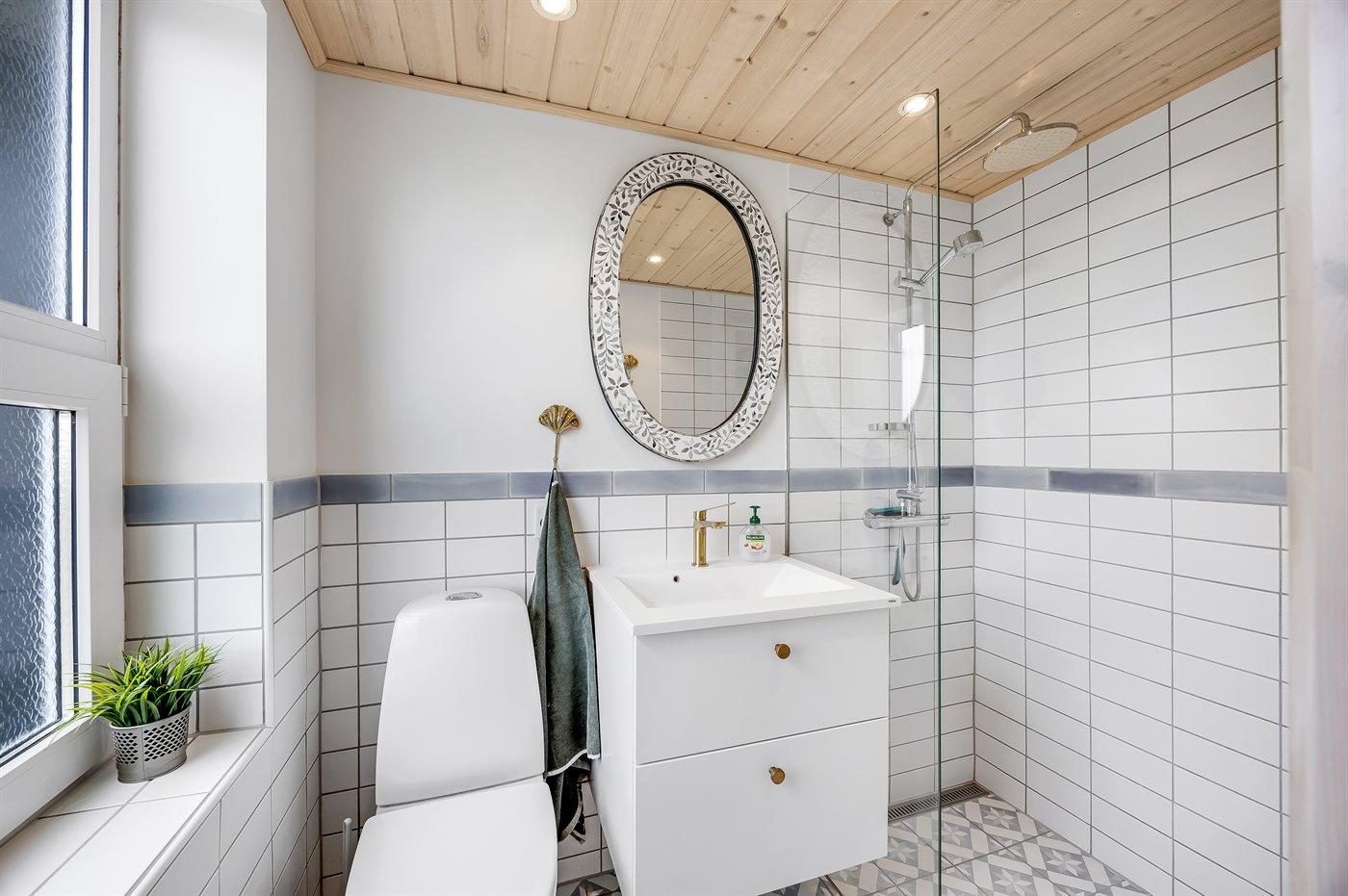 Der er 2 badeværelser med bruser og 2 toiletter. Der er gulvvarme i det meste af huset, samt radiatorer.