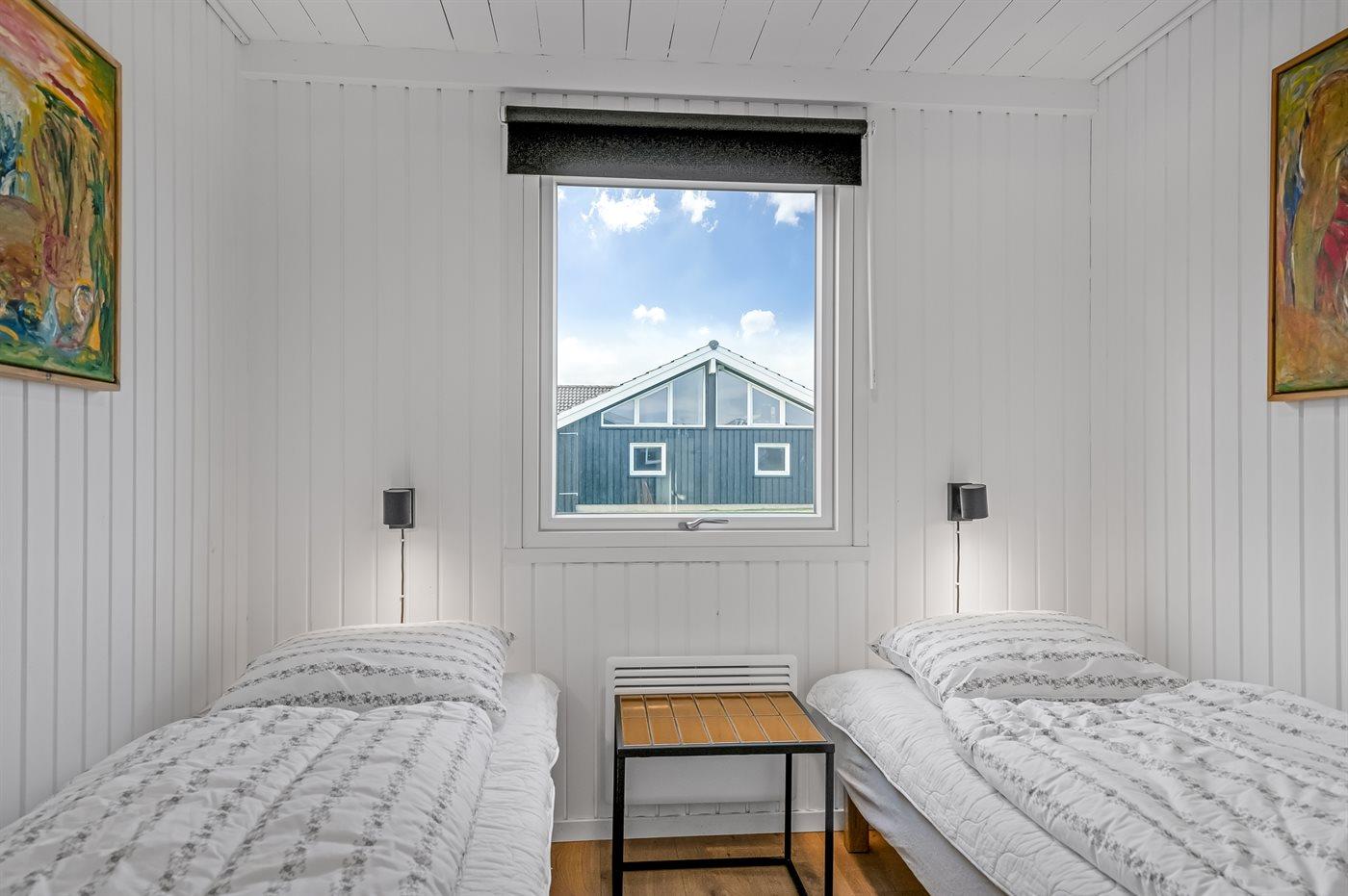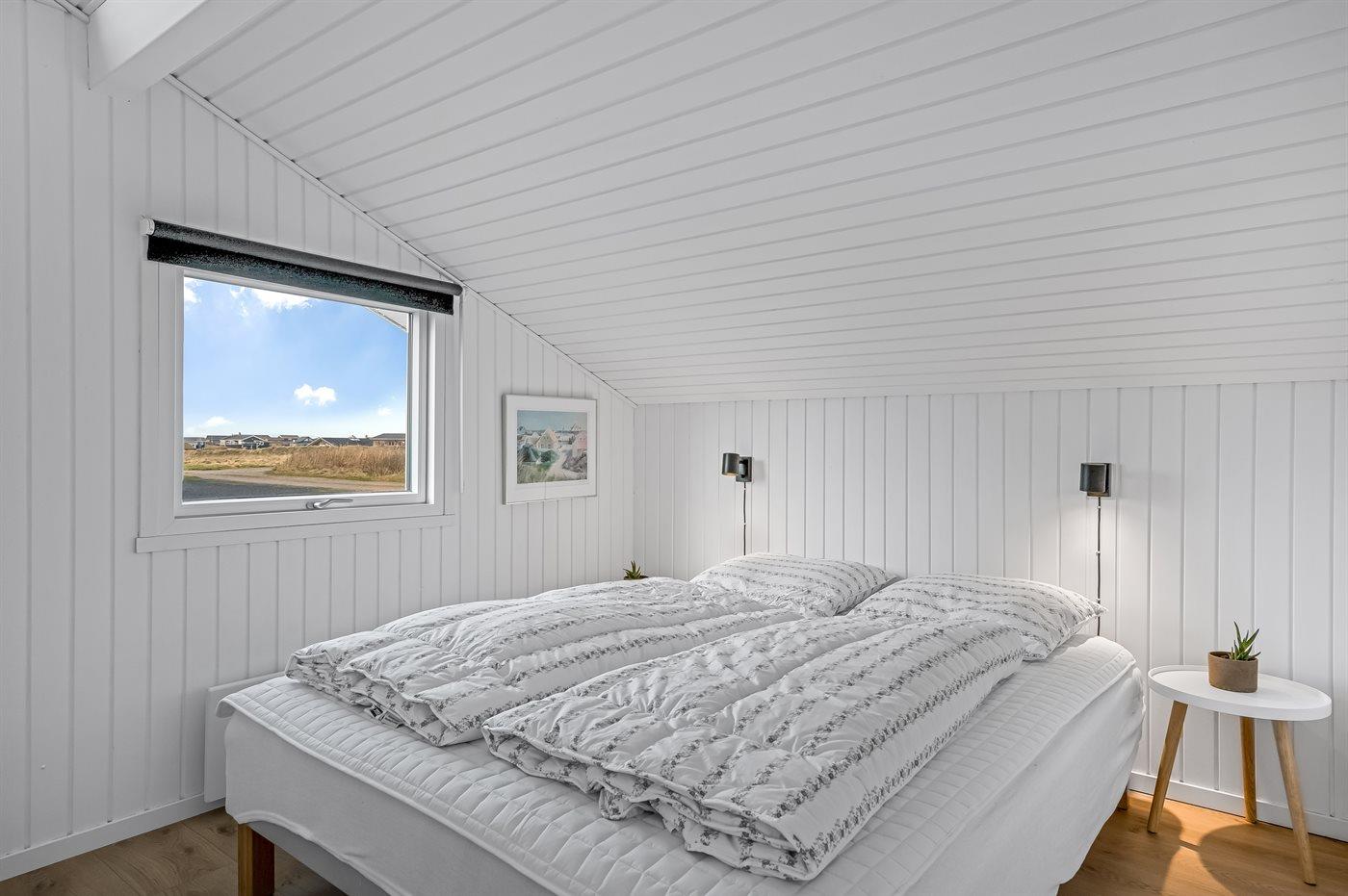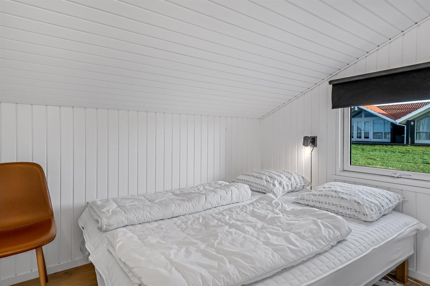 Der er i alt 3 soveværelser. Sovepladserne fordeler sig på: 4 sovepladser i dobbeltsenge. 2 sovepladser i enkeltsenge. 2 sovepladser på madrasser. 2 af disse sovepladser befinder sig på husets hems. Derudover er der 1 stk. barneseng.