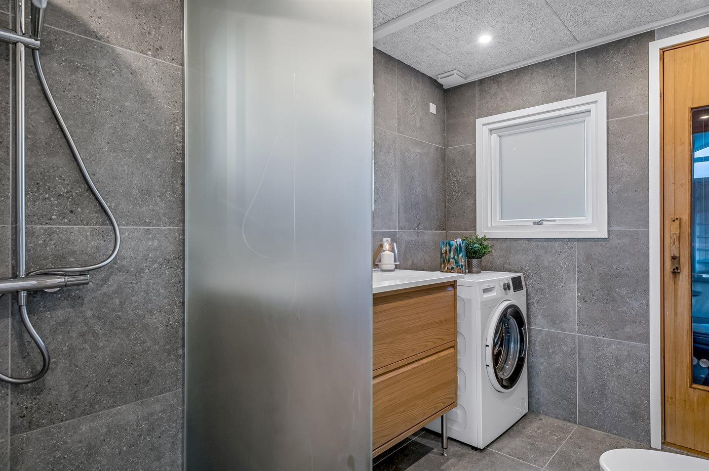 Der er 1 badeværelse med bruseniche og 1 toilet.. Der er gulvvarme på 1 badeværelse. I saunaen er der mulighed for afslapning.