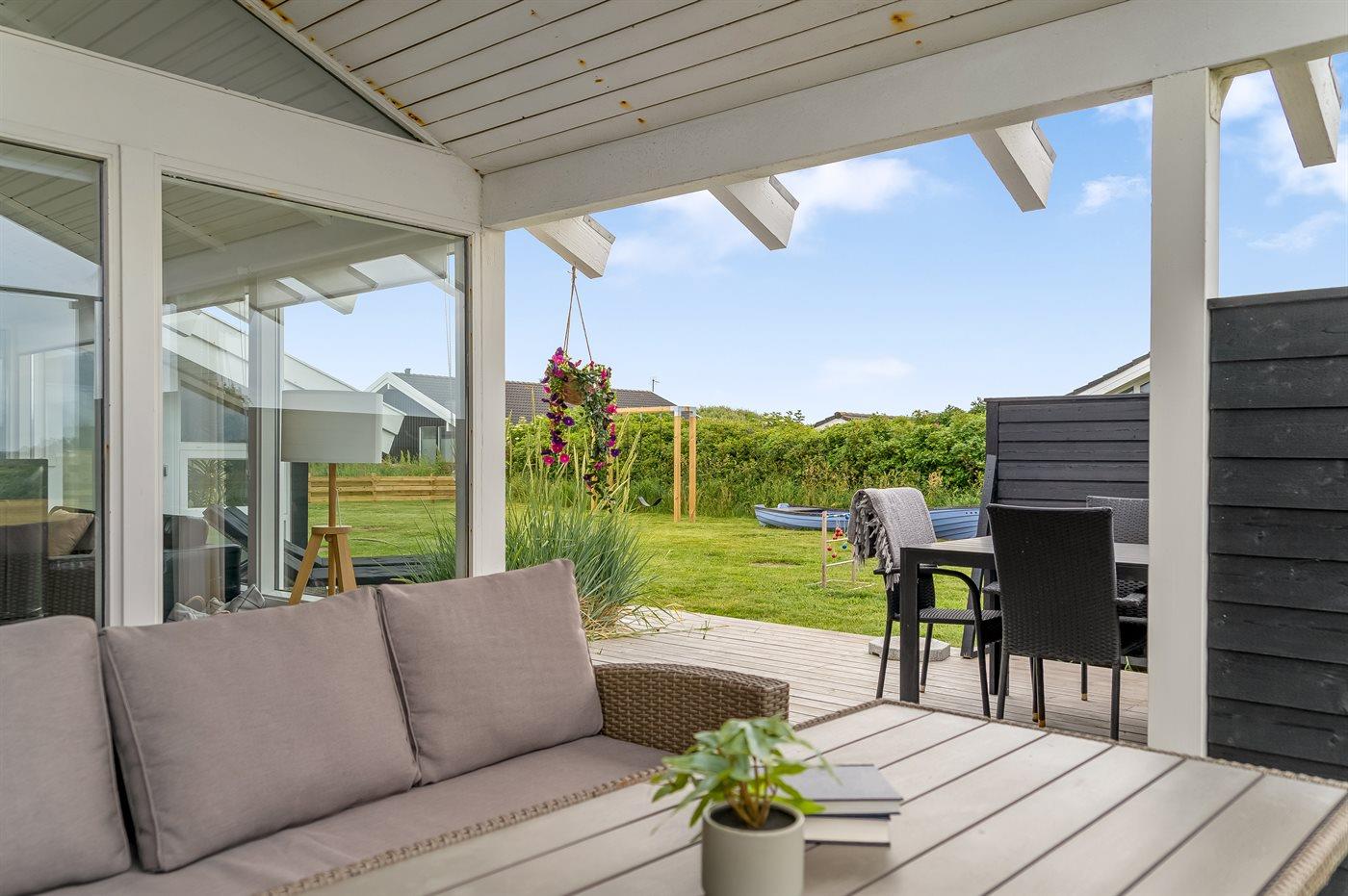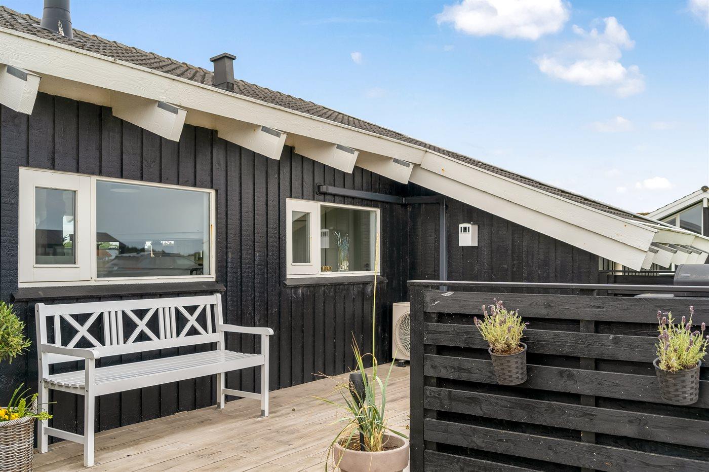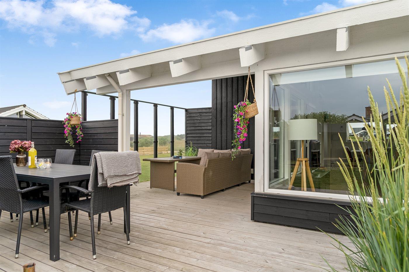 Rundt om huset er der skønne terrasser med fine havemøbler, hvor man rigtig kan nyde den friske havluft og solen.