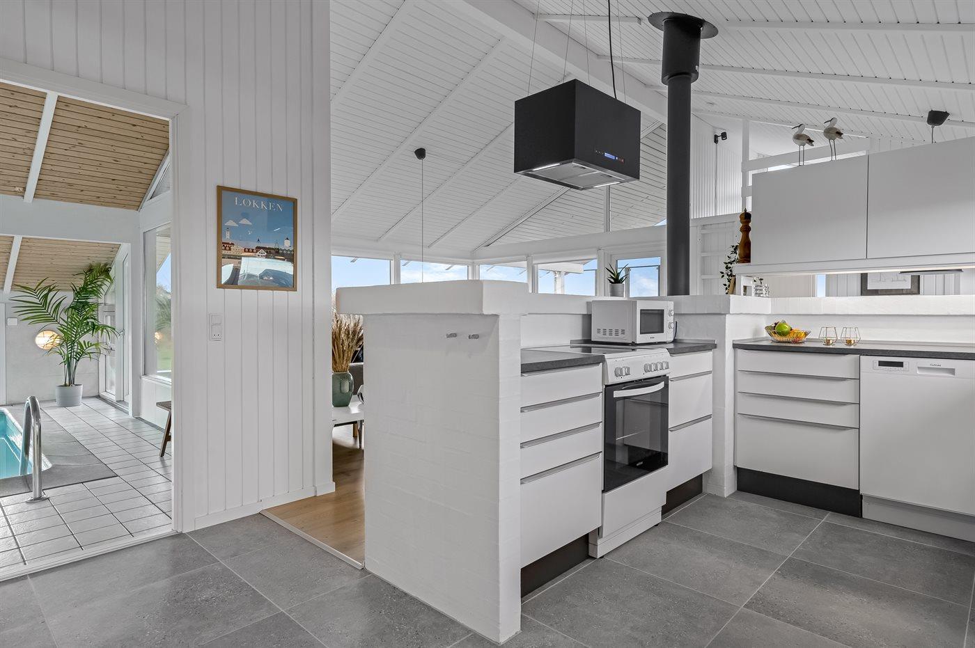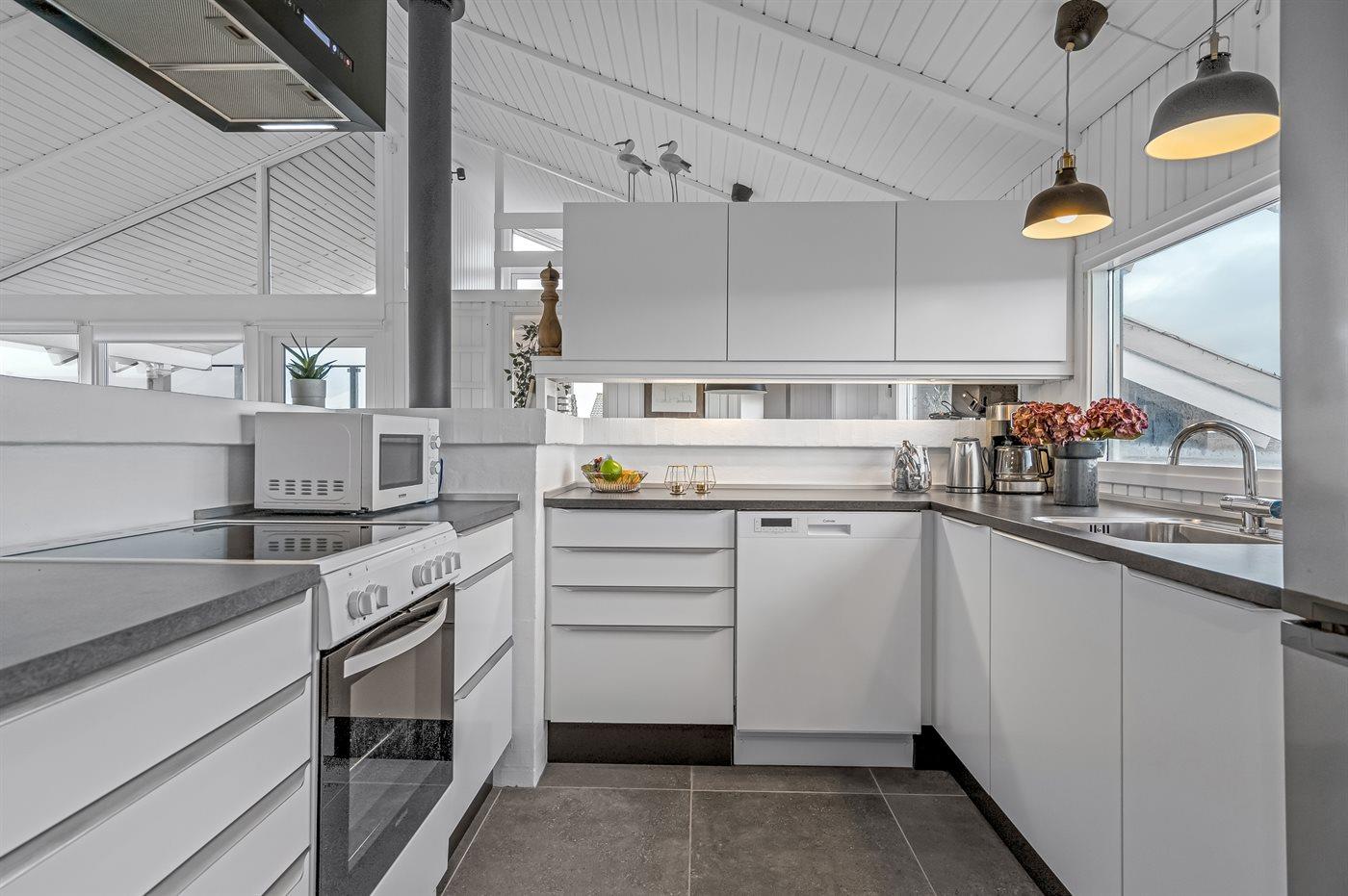 Køkkenet er udstyret med 1 køleskab. Der er 4 keramiske kogeplader, varmluftovn, mikrobølgeovn samt opvaskemaskine.