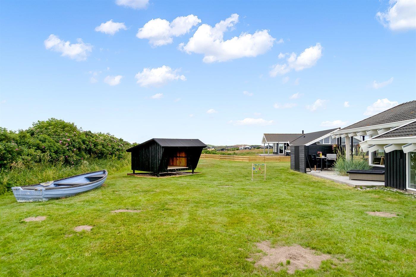 Ferieboligen er beliggende på en 1230 m² stor naturgrund. Der er 500 m til havet. Nærmeste forretning er beliggende i en afstand af 1500 m. Til ferieboligen hører 18 m² terrasseareal. Desuden er der 8 m² overdækket terrasse. Gynge. Sandkasse. Shelter. Gasgrill står til rådighed. Parkering ved ferieboligen.
