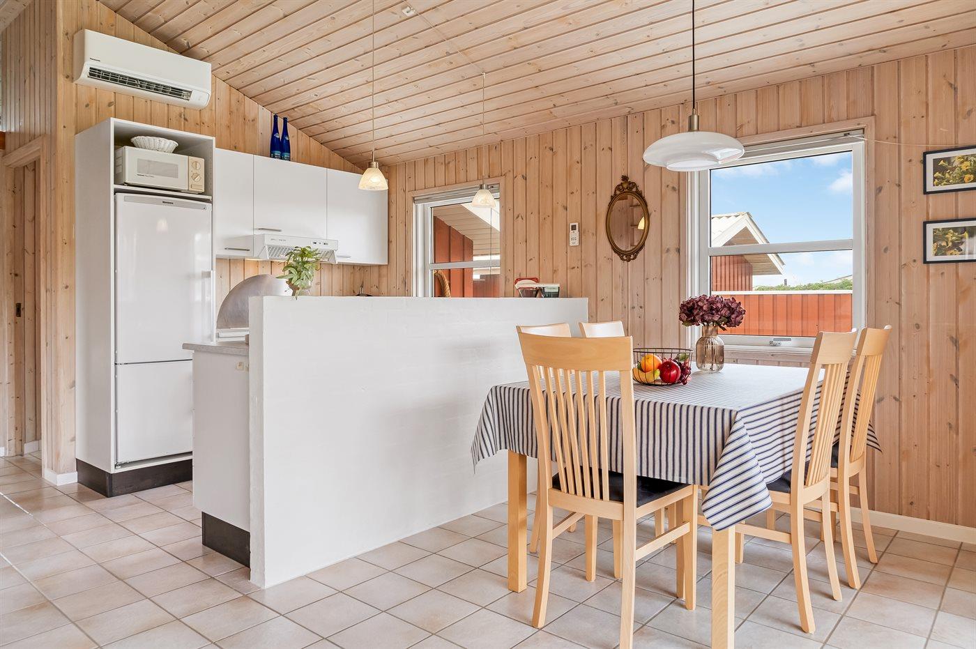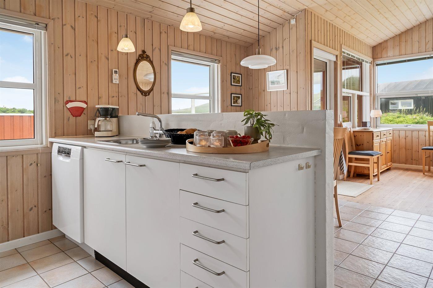 Køkkenet er udstyret med 1 køleskab. Der er 4 keramiske kogeplader, bageovn, mikrobølgeovn samt opvaskemaskine.