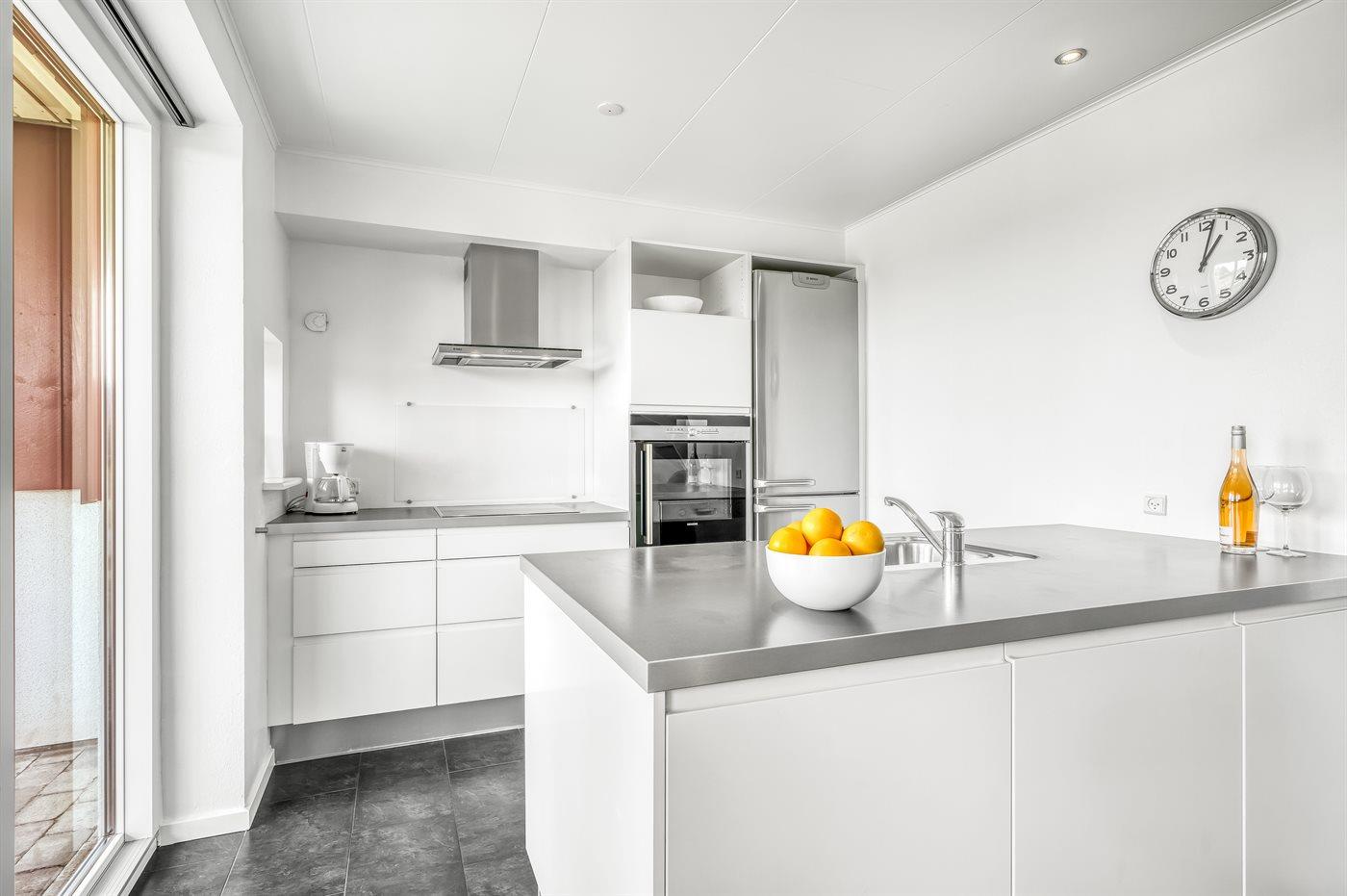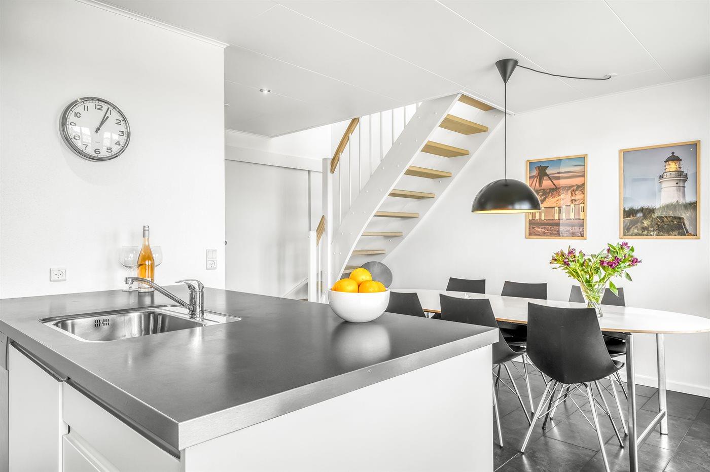 Køkkenet er udstyret med 1 køleskab. Der er 4 keramiske kogeplader, varmluftovn, mikrobølgeovn samt opvaskemaskine Der er gulvvarme i køkkenet.