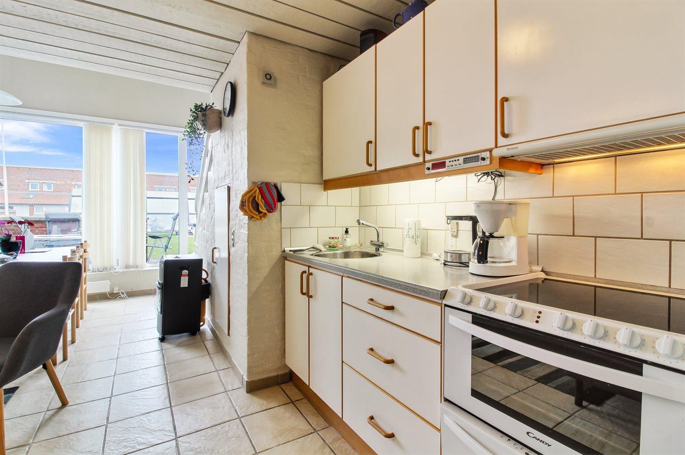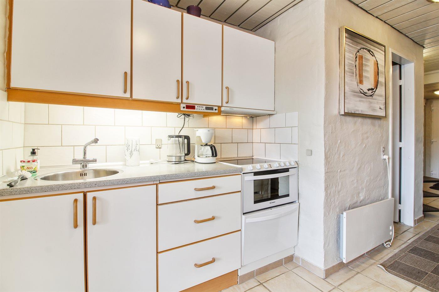 Køkkenet er udstyret med 1 køleskab. Der er 4 keramiske kogeplader. Der findes komfur med opvaskemaskine, bageovn, mikrobølgeovn samt opvaskemaskine.