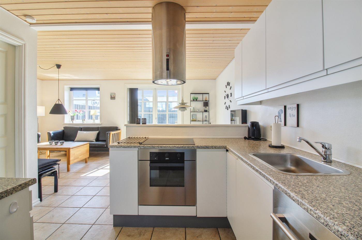 Køkkenet er udstyret med 1 køleskab. Der er 4 keramiske kogeplader, varmluftovn, mikrobølgeovn samt opvaskemaskine Der er gulvvarme i køkkenet.