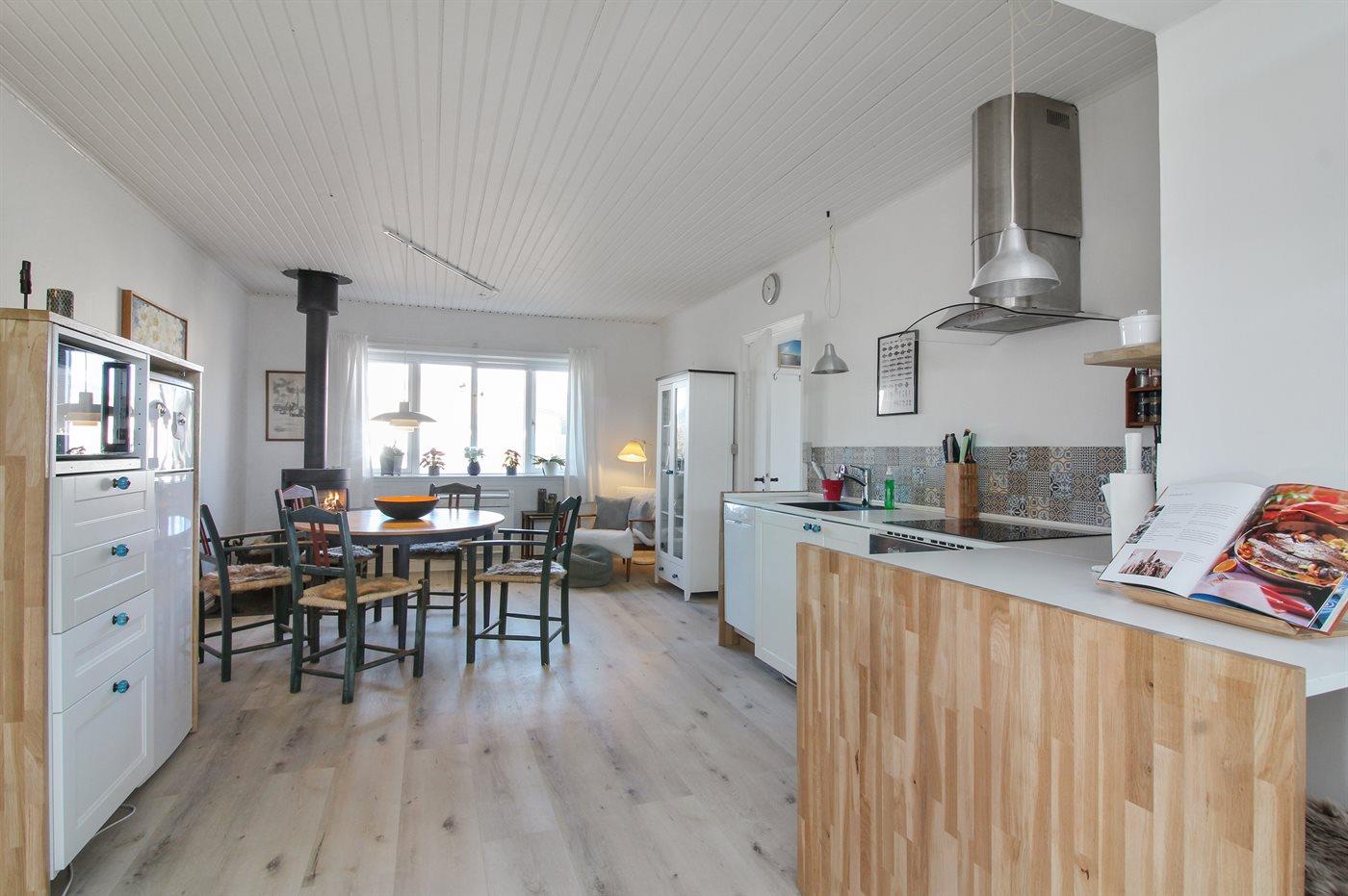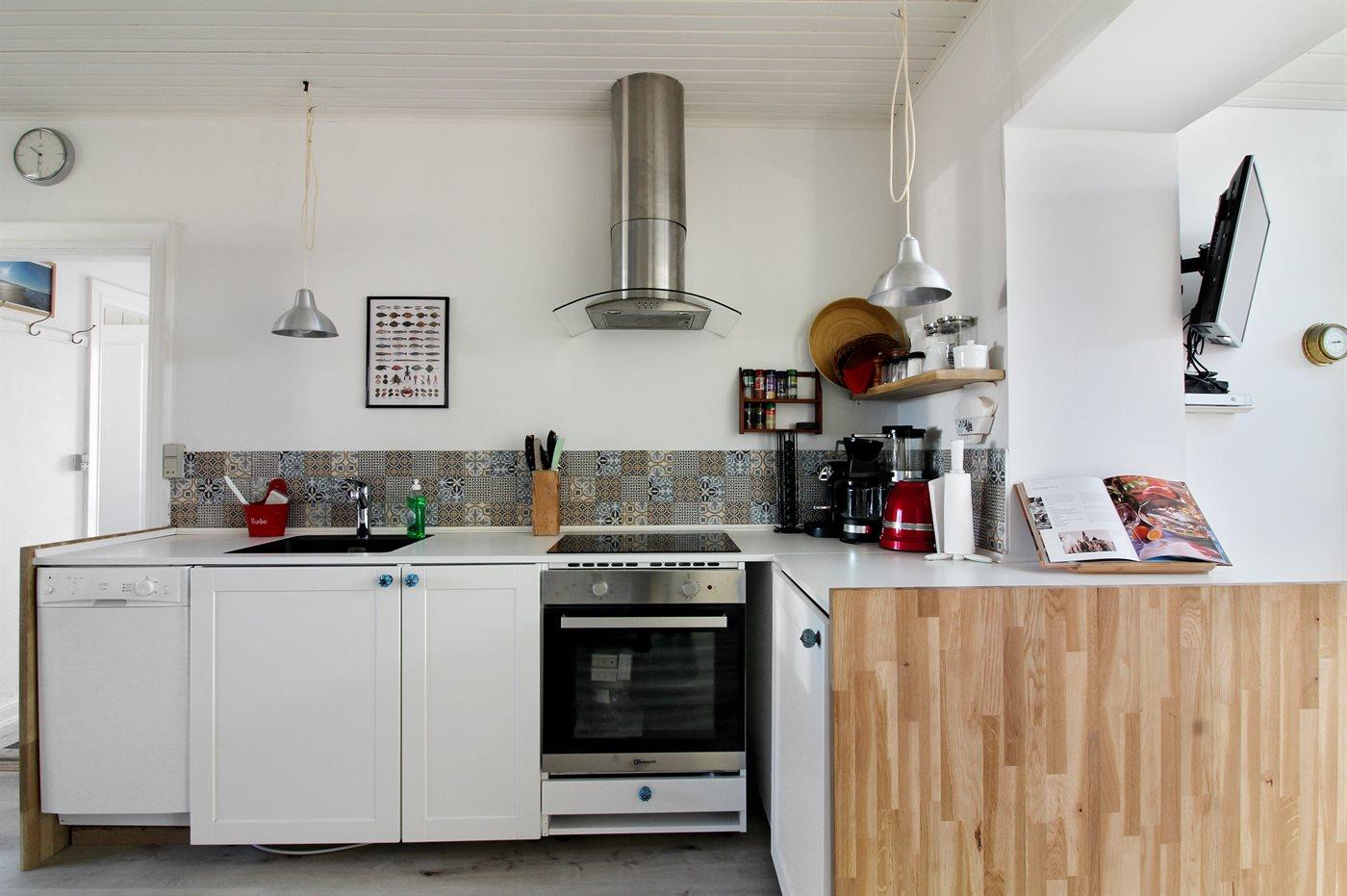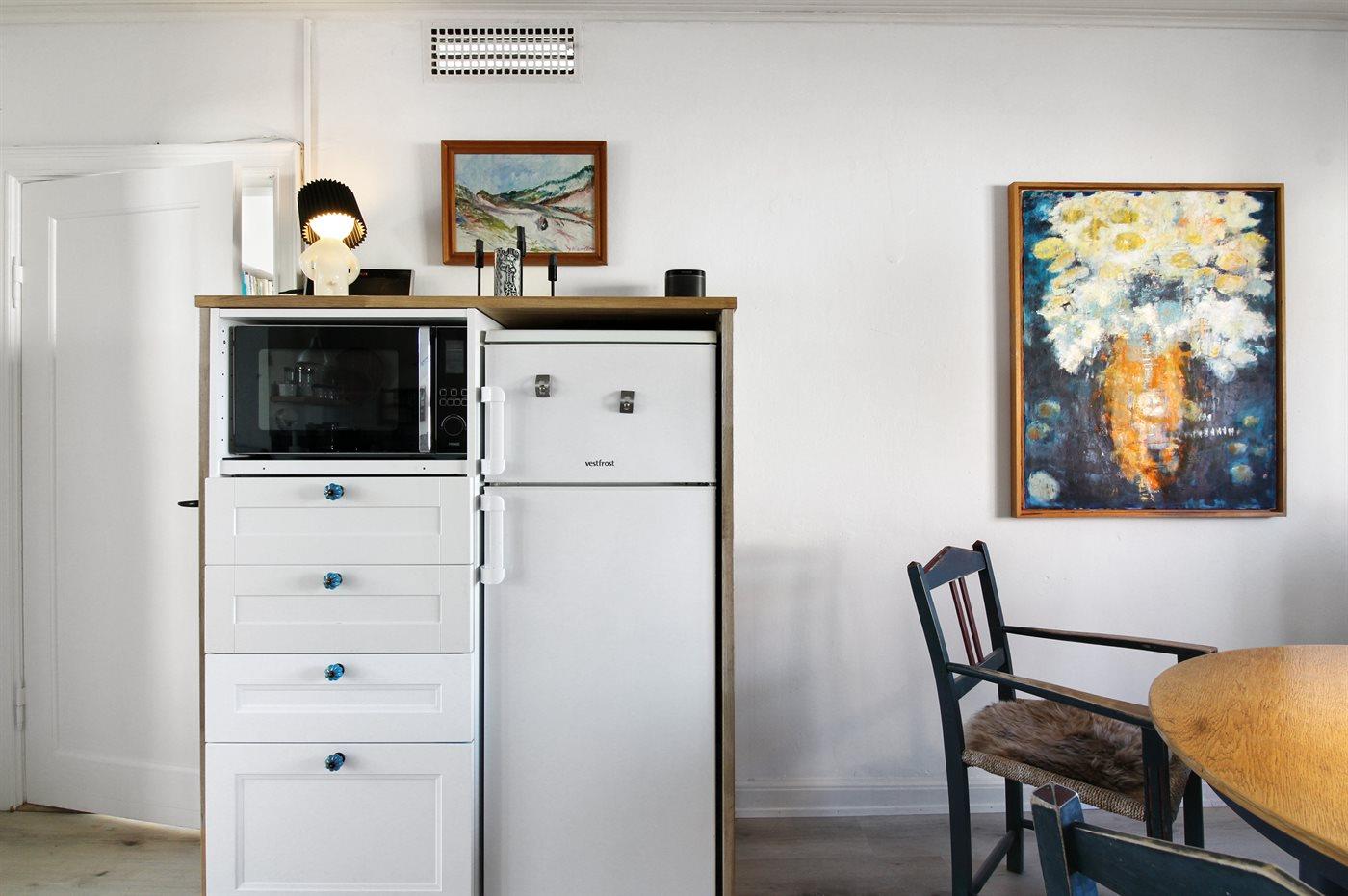 Køkkenet er udstyret med 1 køleskab. Der er 4 induktionskogeplader, varmluftovn, mikrobølgeovn samt opvaskemaskine.
