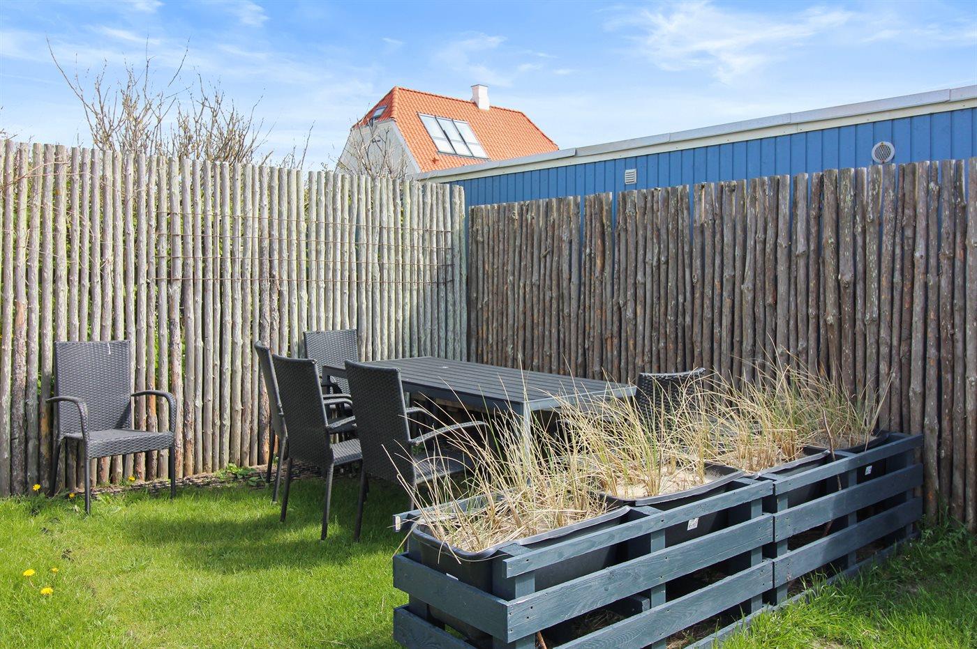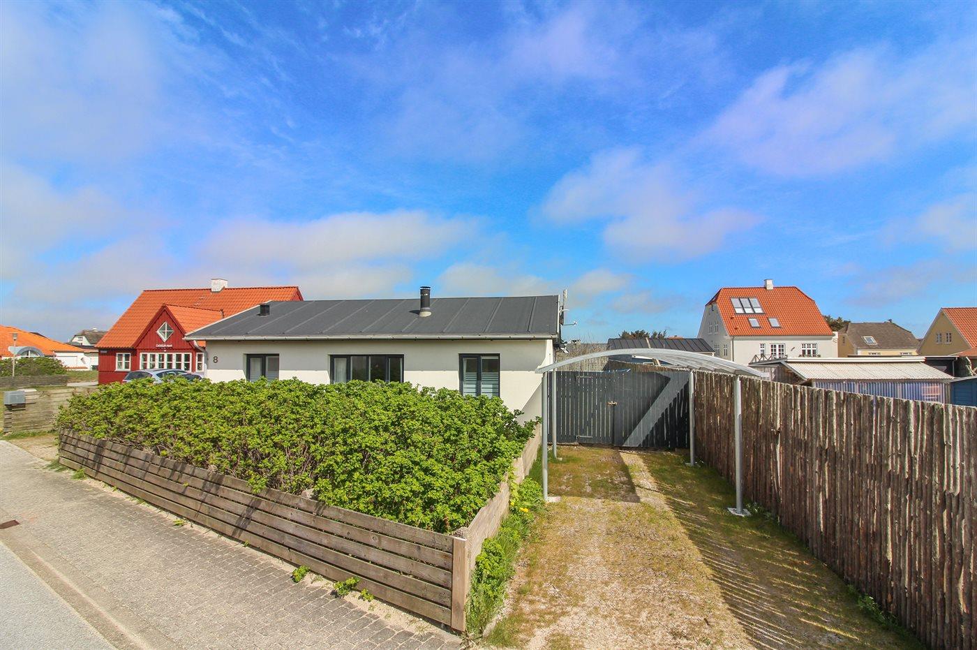 Ferieboligen er beliggende på en 453 m² stor naturgrund. Grunden er indhegnet. Der er 125 m til havet. Nærmeste forretning er beliggende i en afstand af 475 m. Til ferieboligen hører 30 m² terrasseareal. Der er redskabsrum. Udendørs bruser. Der er carport til rådighed. Parkering ved ferieboligen.