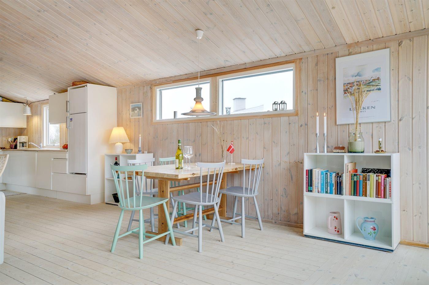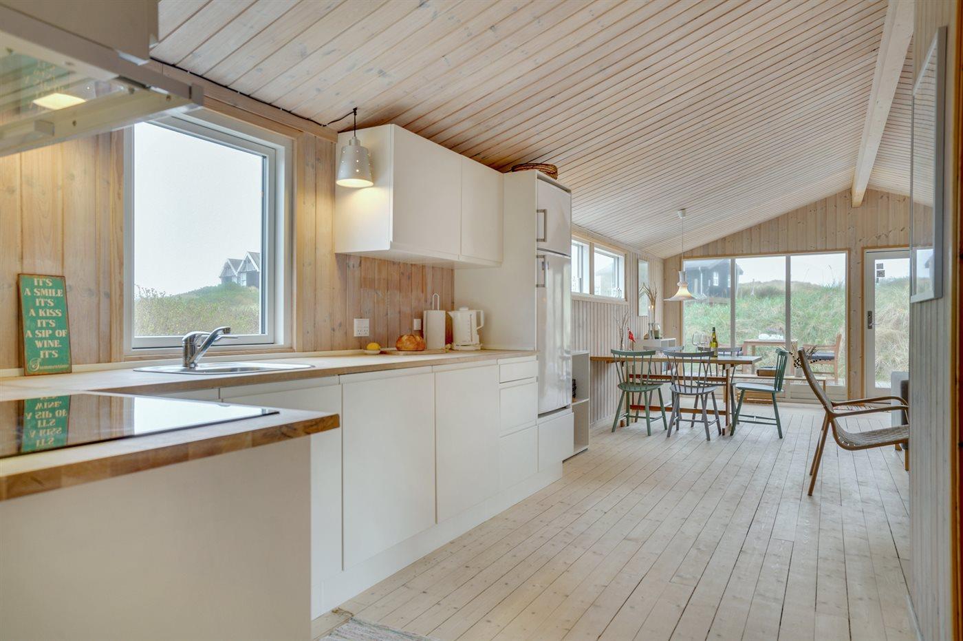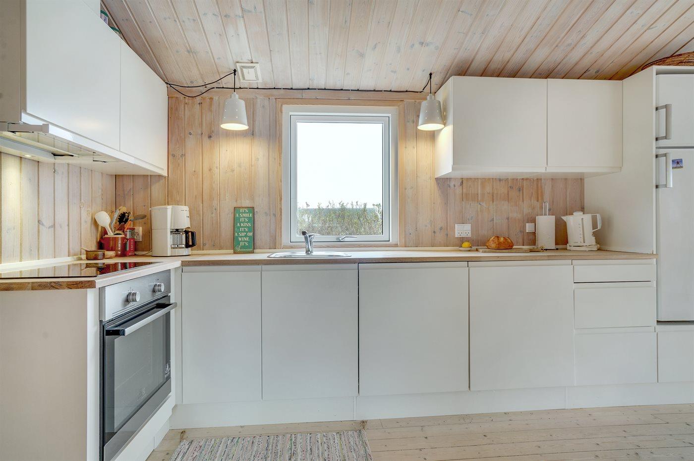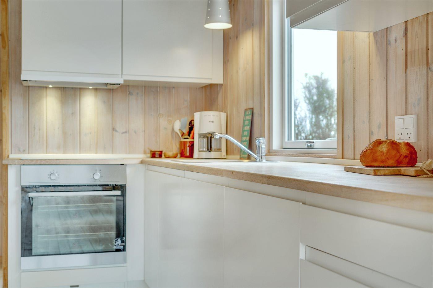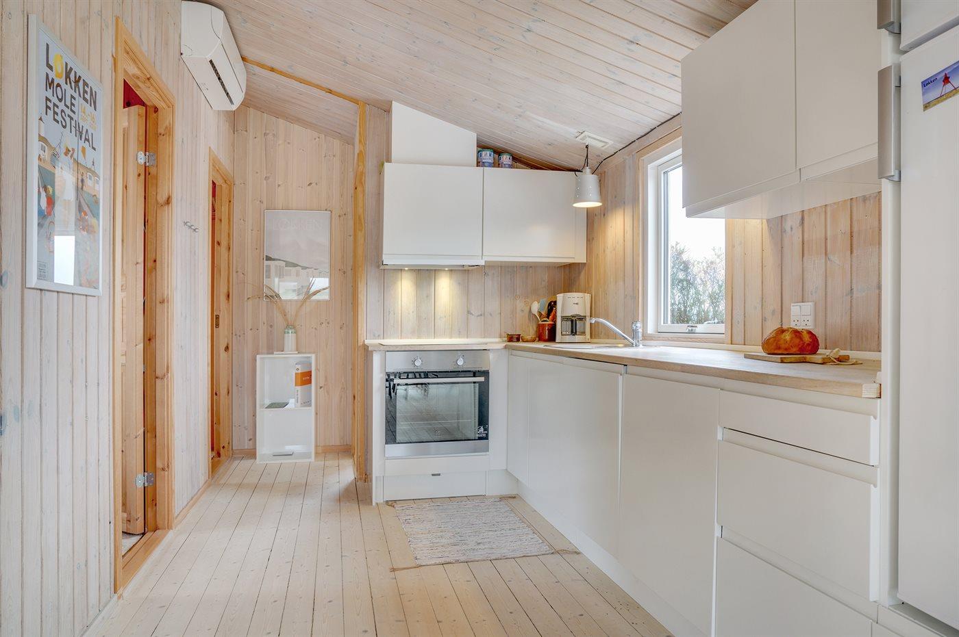 Køkkenet er udstyret med 1 køleskab. Der er 4 keramiske kogeplader, varmluftovn samt opvaskemaskine.