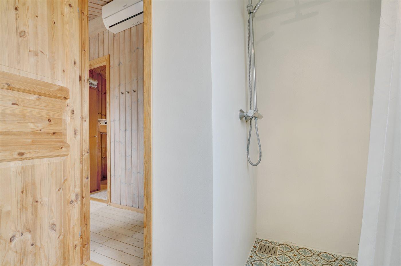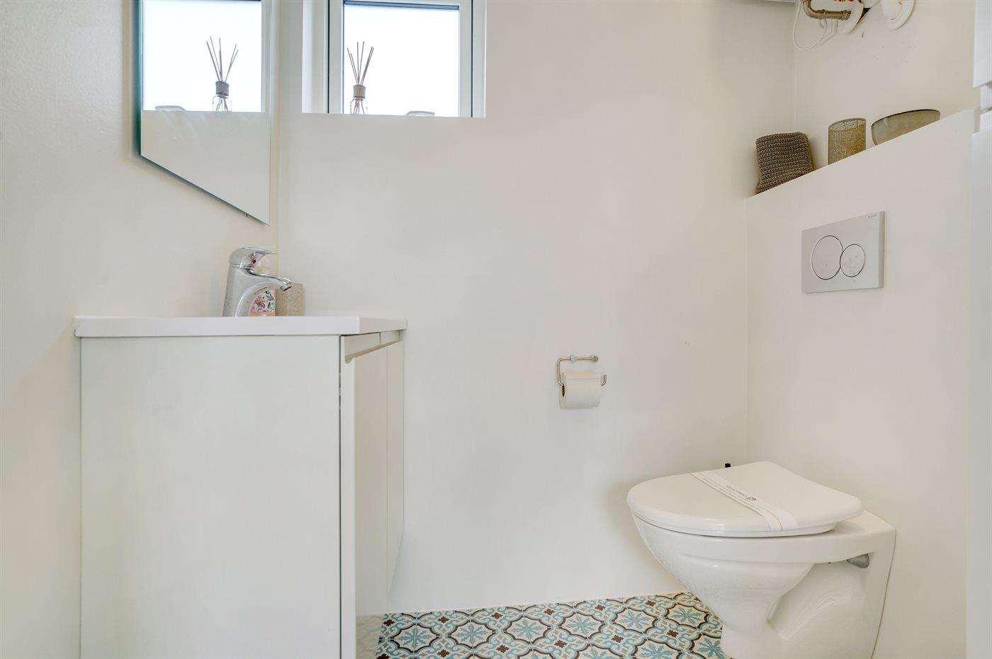 Der er 1 badeværelse med bruseniche og 2 toiletter, heraf 1 gæstetoilet. Der er gulvvarme på 1 badeværelse. Der er gulvvarme på gæstetoilettet.