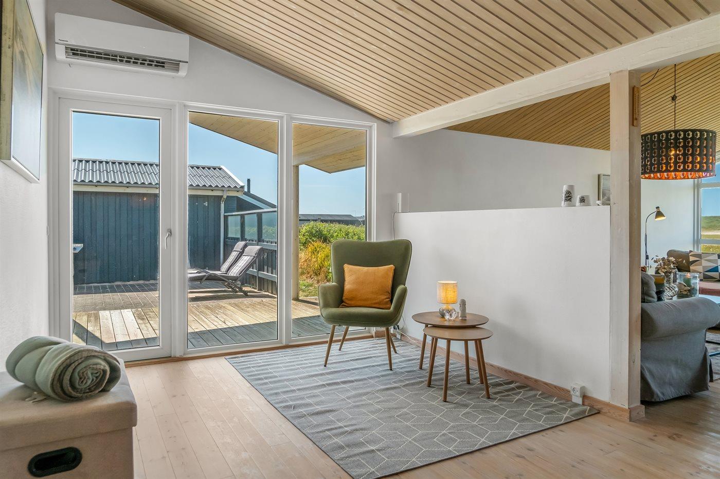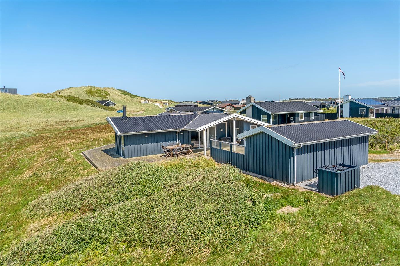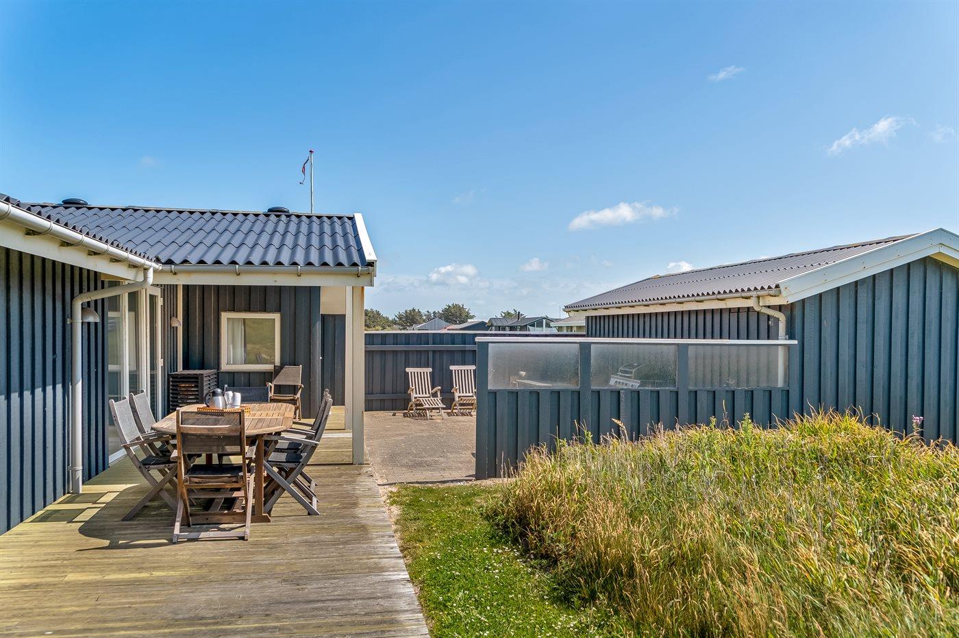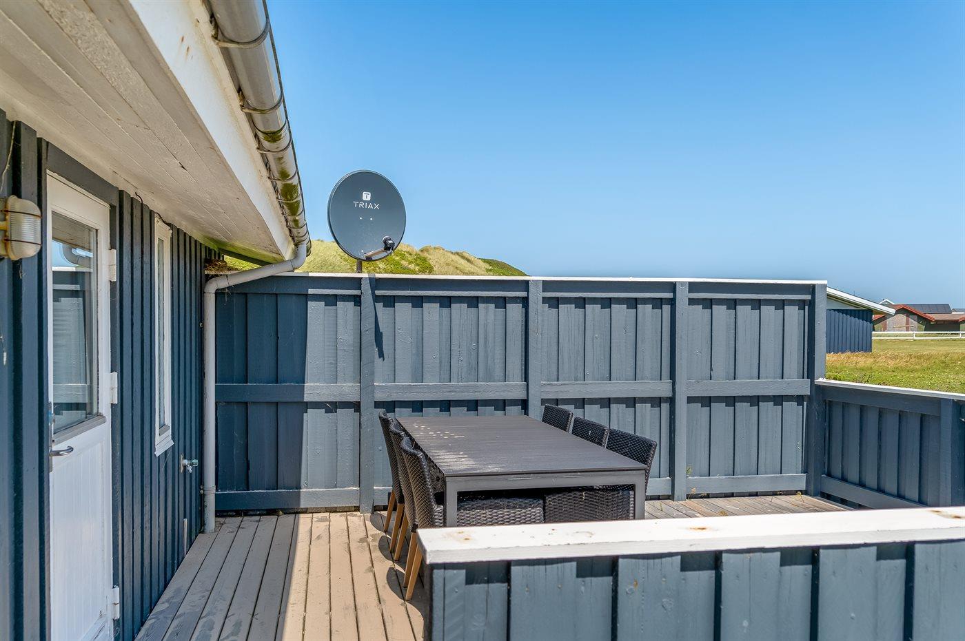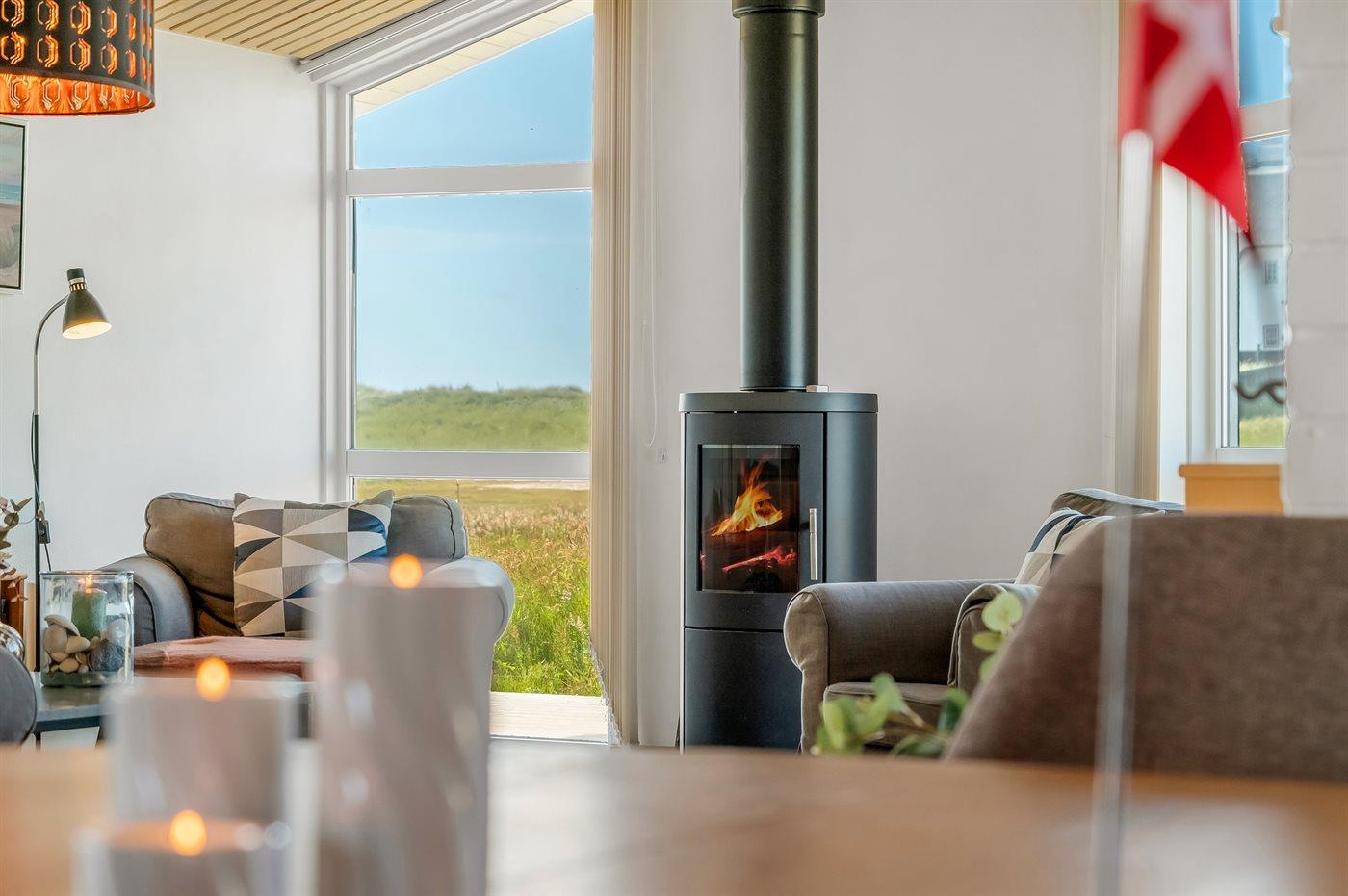 Her er både terrasser mod øst, hvor du kan nyde morgenkaffen og se solen kravle op og kæmpe sig vej om til vest, hvor du så kan se den sænke sig bag klitterne. Du kan også gå en tur op på klitterne og følge solen i seng, inden du selv skynder dig hjem i sofaen og varmer dig ved brændeovnen.
