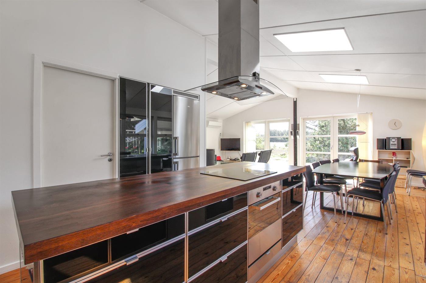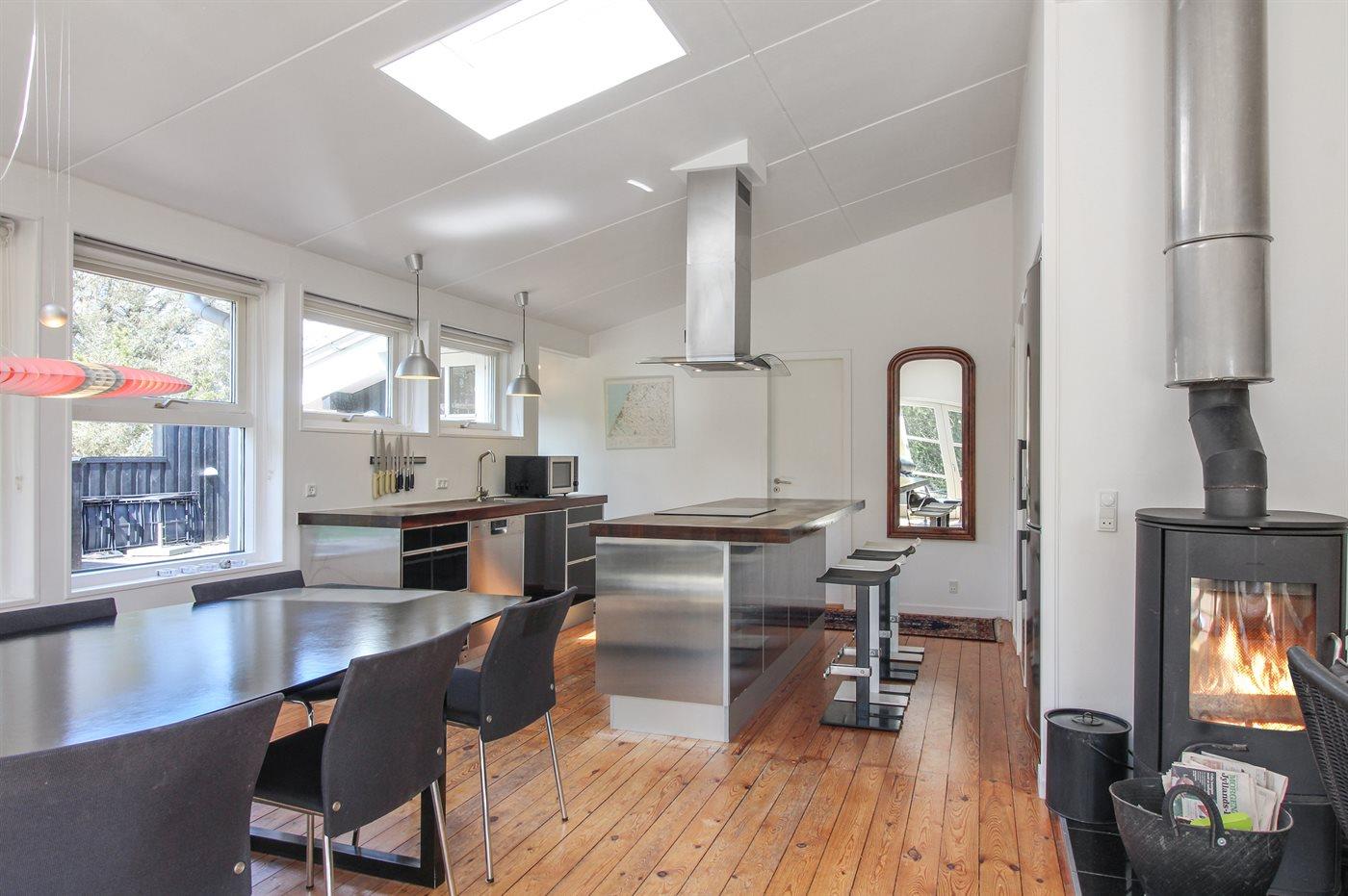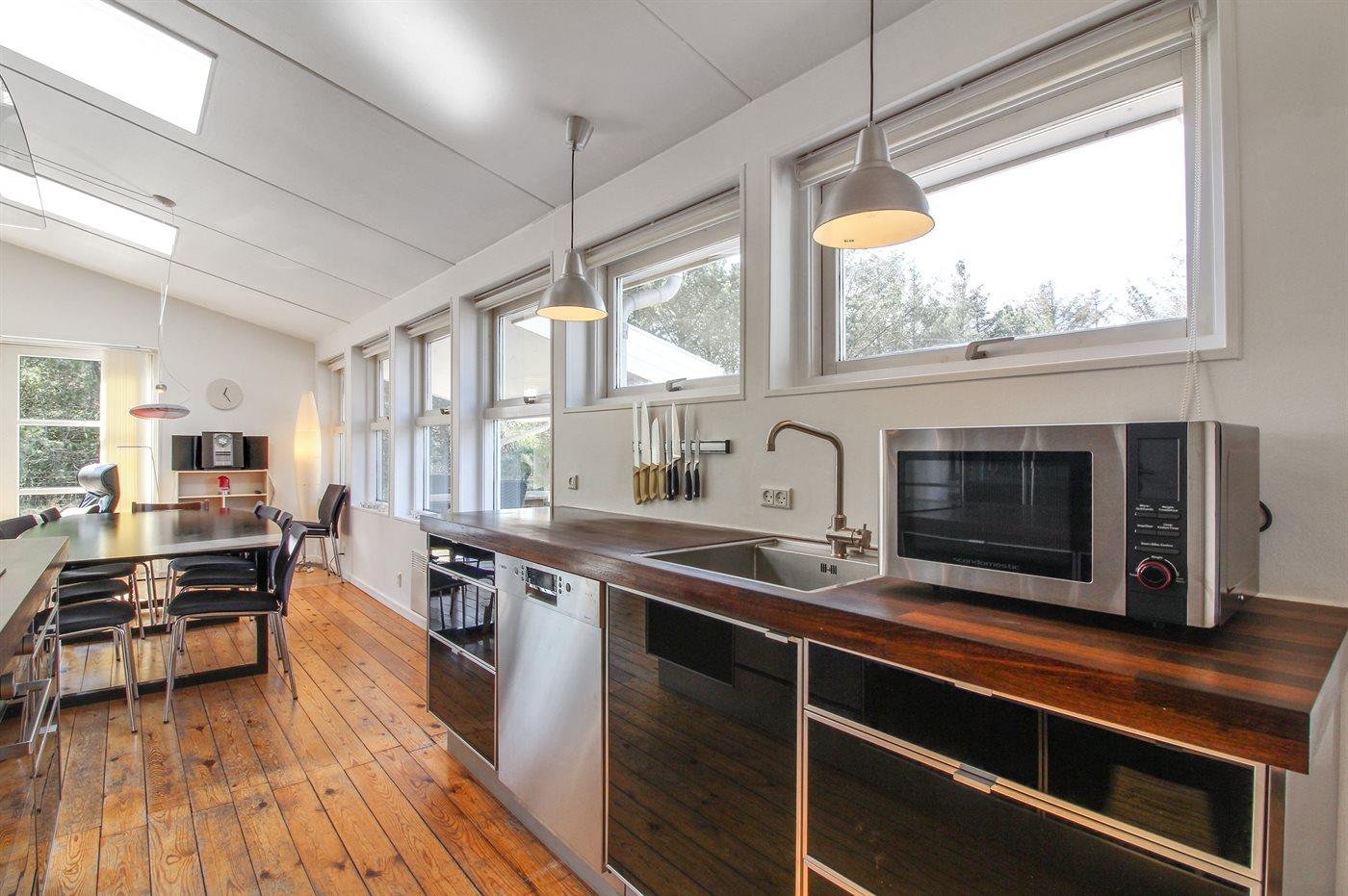 Køkkenet er udstyret med 1 køleskab. Der er 4 keramiske kogeplader, varmluftovn, mikrobølgeovn samt opvaskemaskine.