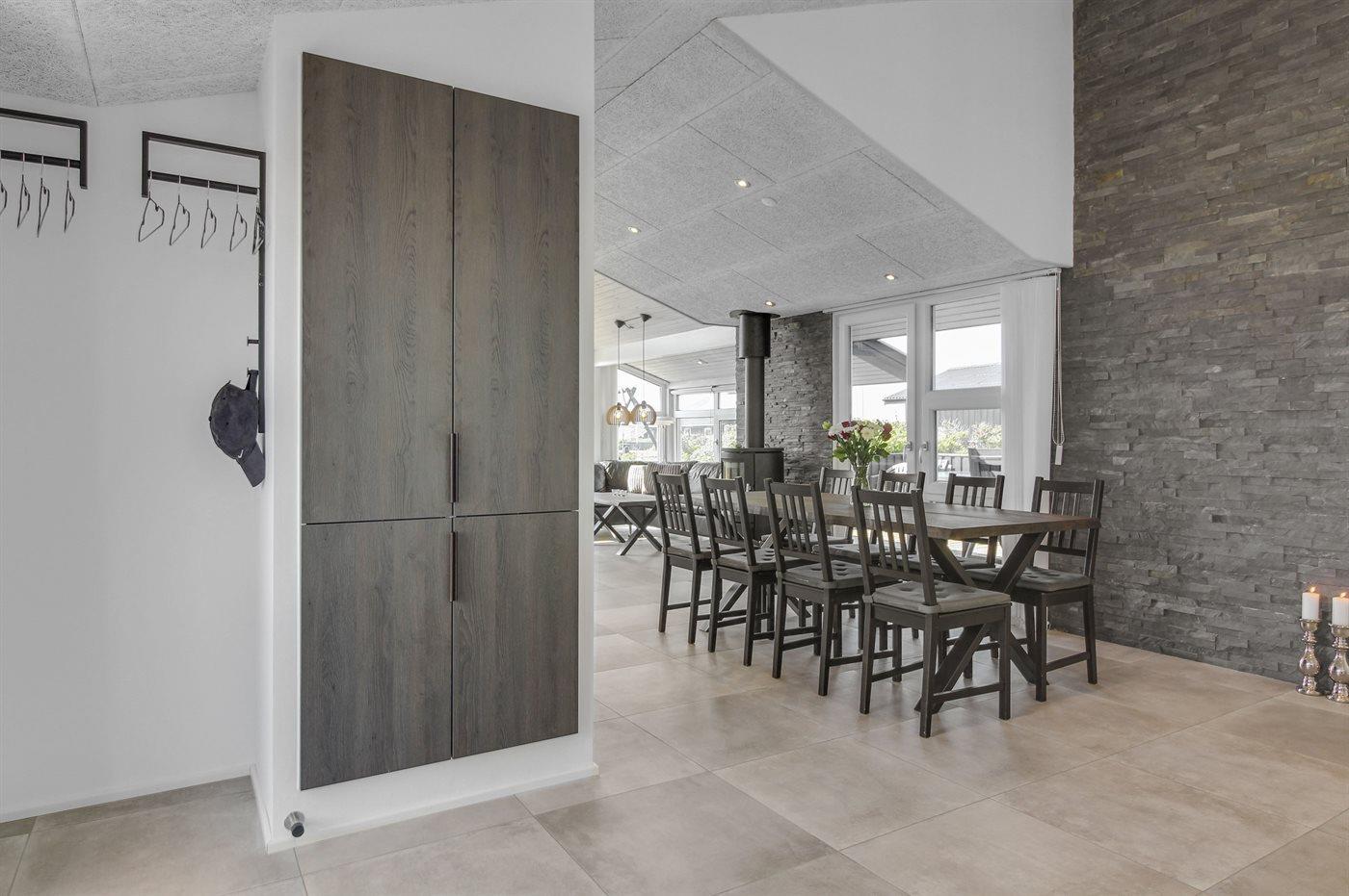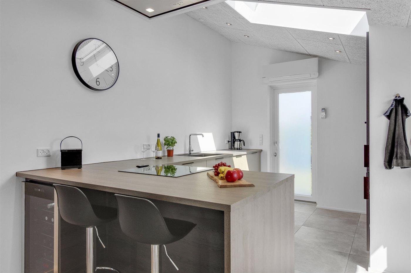 Køkkenet er udstyret med 1 køleskab. Der er 4 induktionskogeplader, varmluftovn, mikrobølgeovn samt opvaskemaskine Der er gulvvarme i køkkenet.