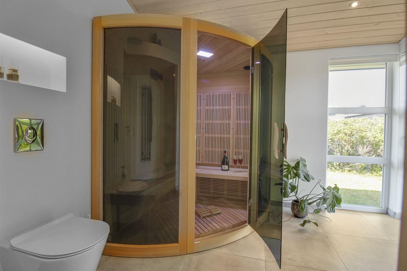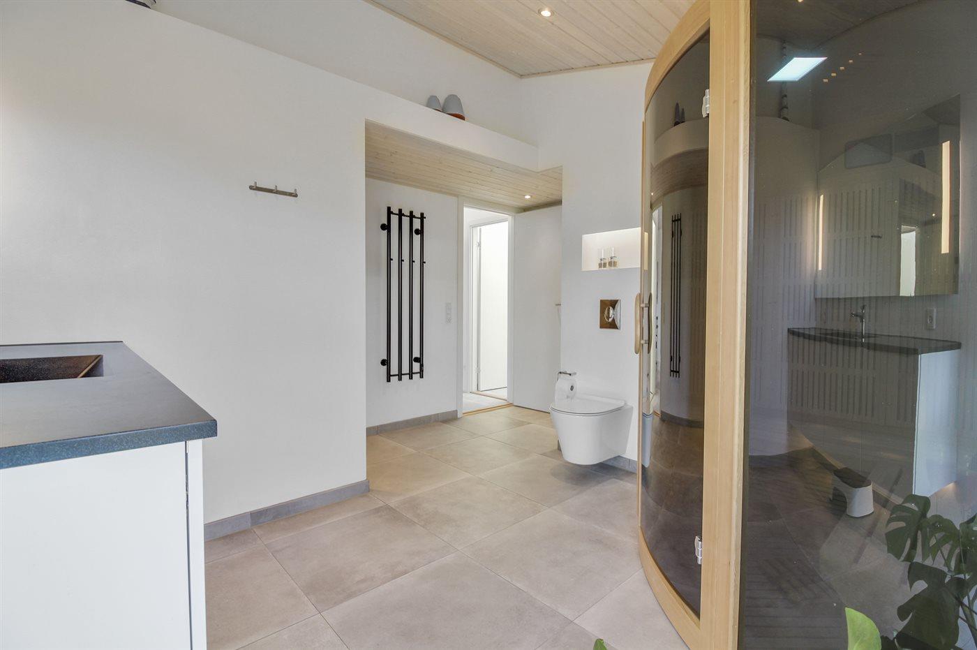 Der er 2 badeværelser med bruseniche og 2 toiletter. Der er gulvvarme på 2 badeværelser. I den infrarøde sauna er der mulighed for afslapning.
