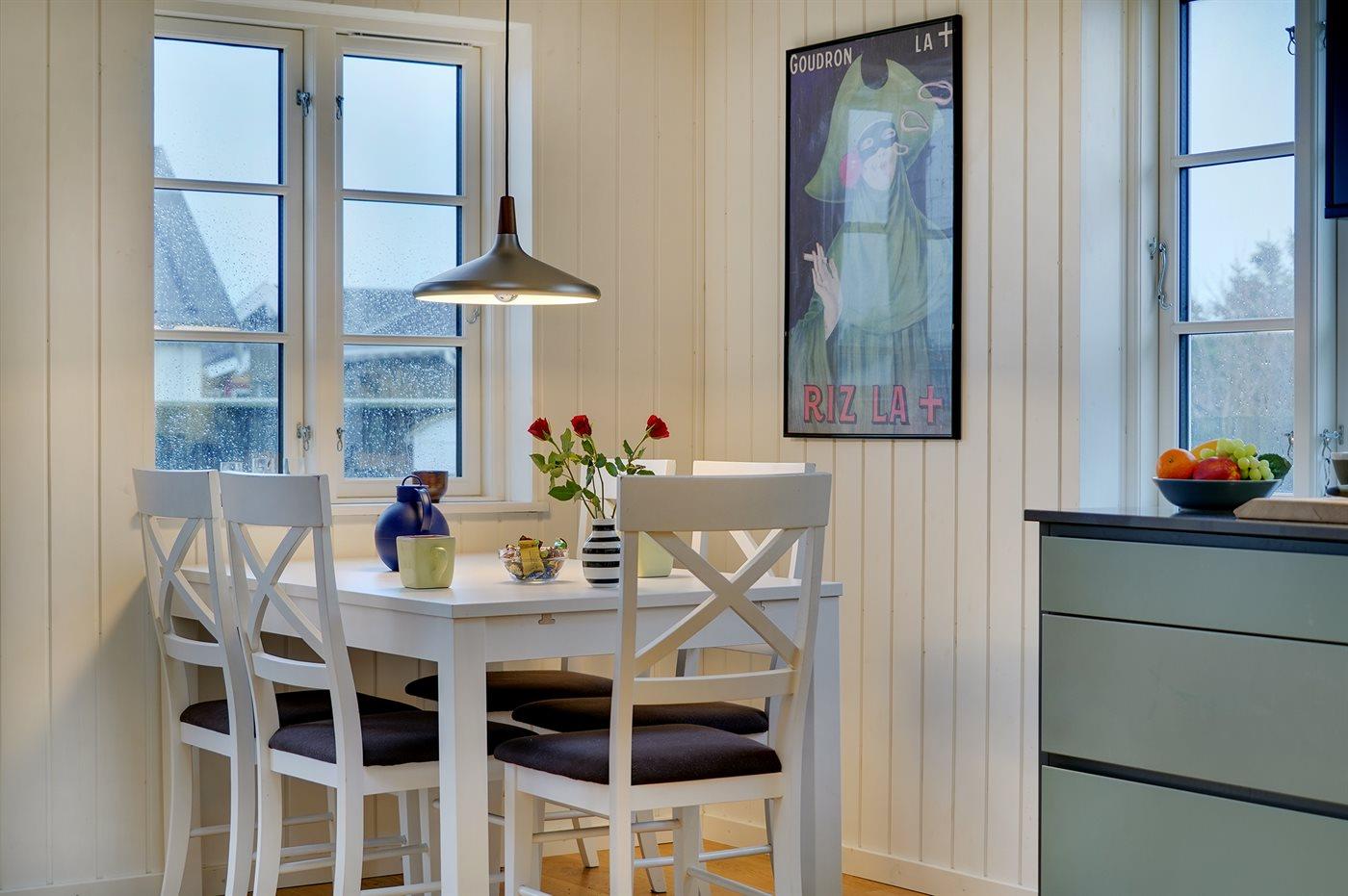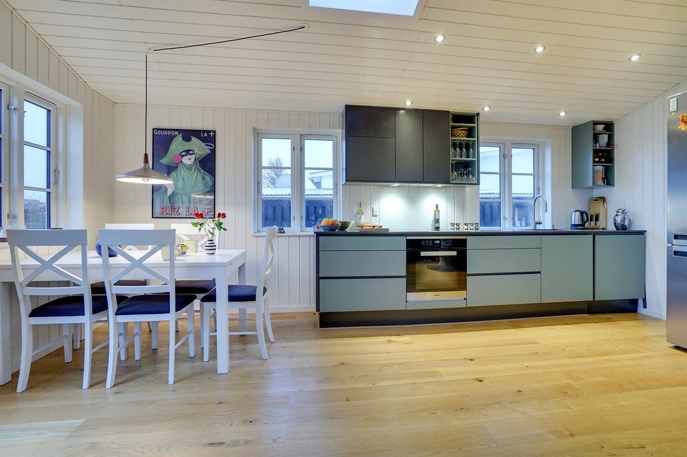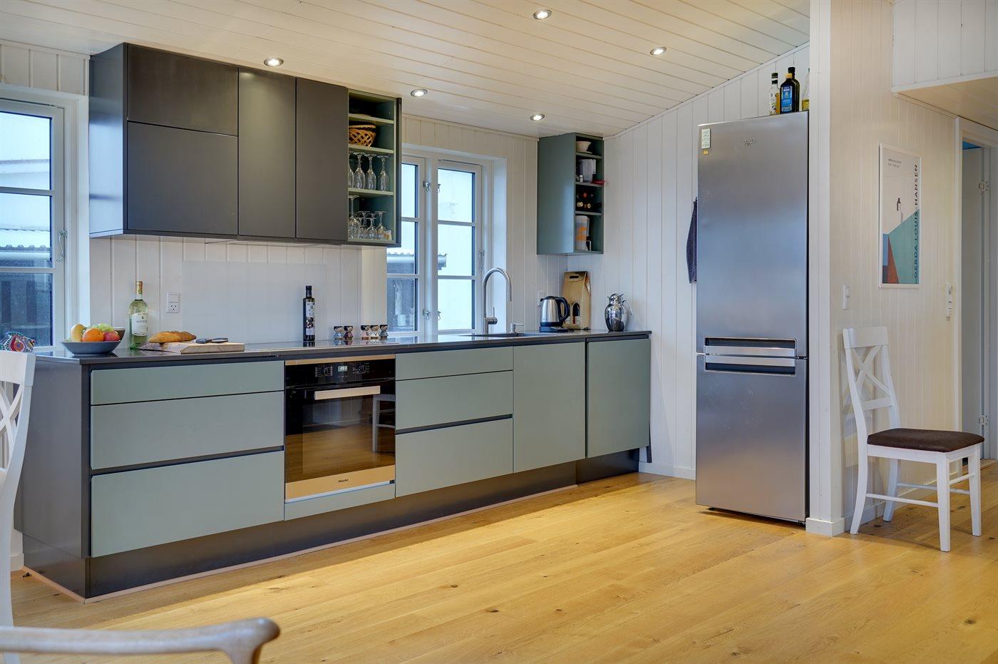 Køkkenet er udstyret med 1 køleskab. Der er 4 induktionskogeplader, varmluftovn samt opvaskemaskine.