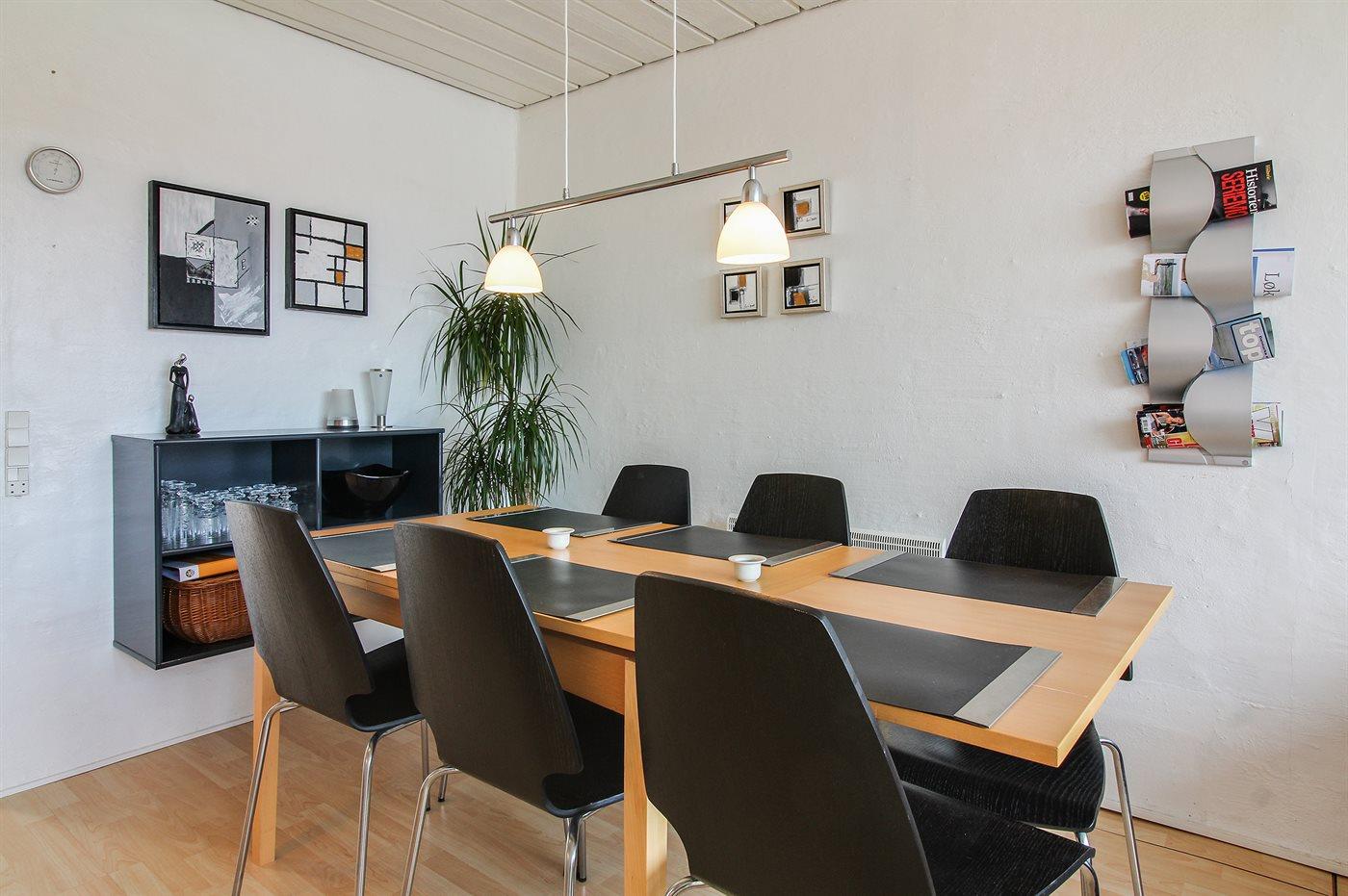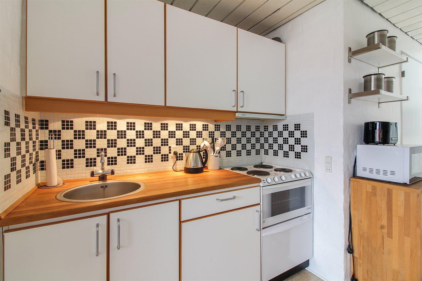 Køkkenet er udstyret med 1 køleskab. Der er 4 elkogeplader, bageovn, mikrobølgeovn samt opvaskemaskine.