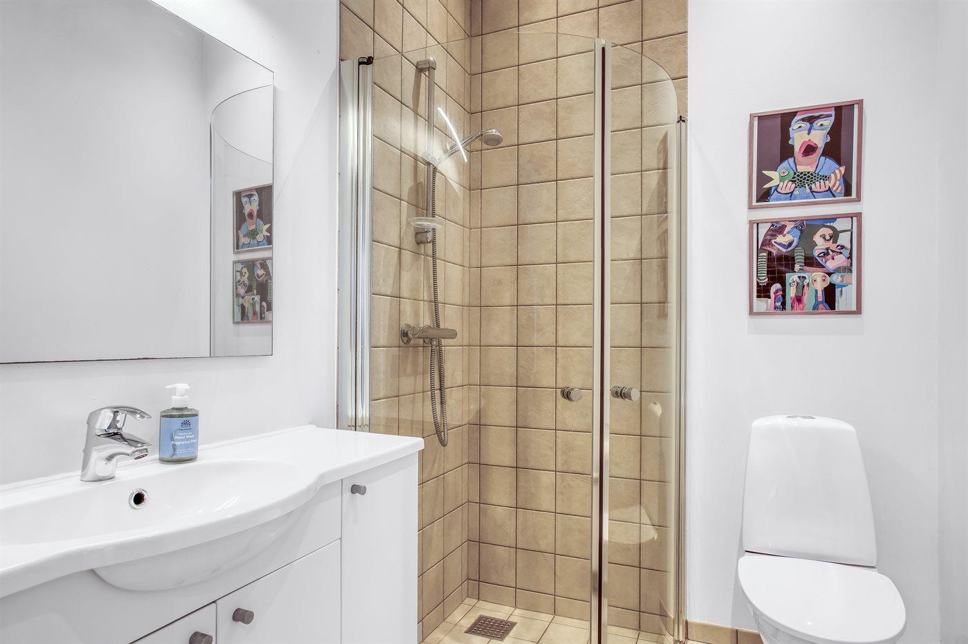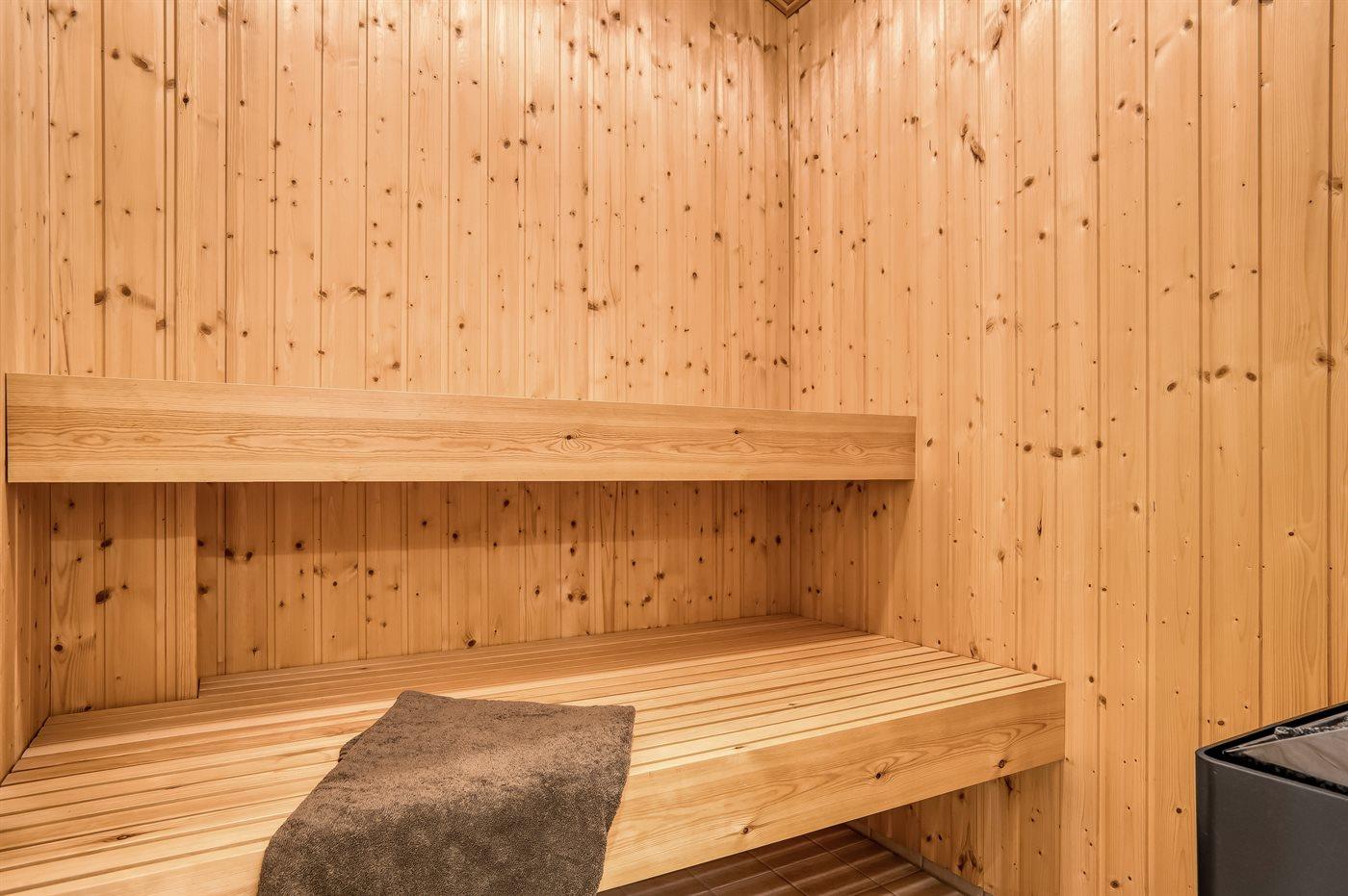 Der er 2 badeværelser med bruseniche og 2 toiletter. Der er gulvvarme på 2 badeværelser. I saunaen er der mulighed for afslapning.