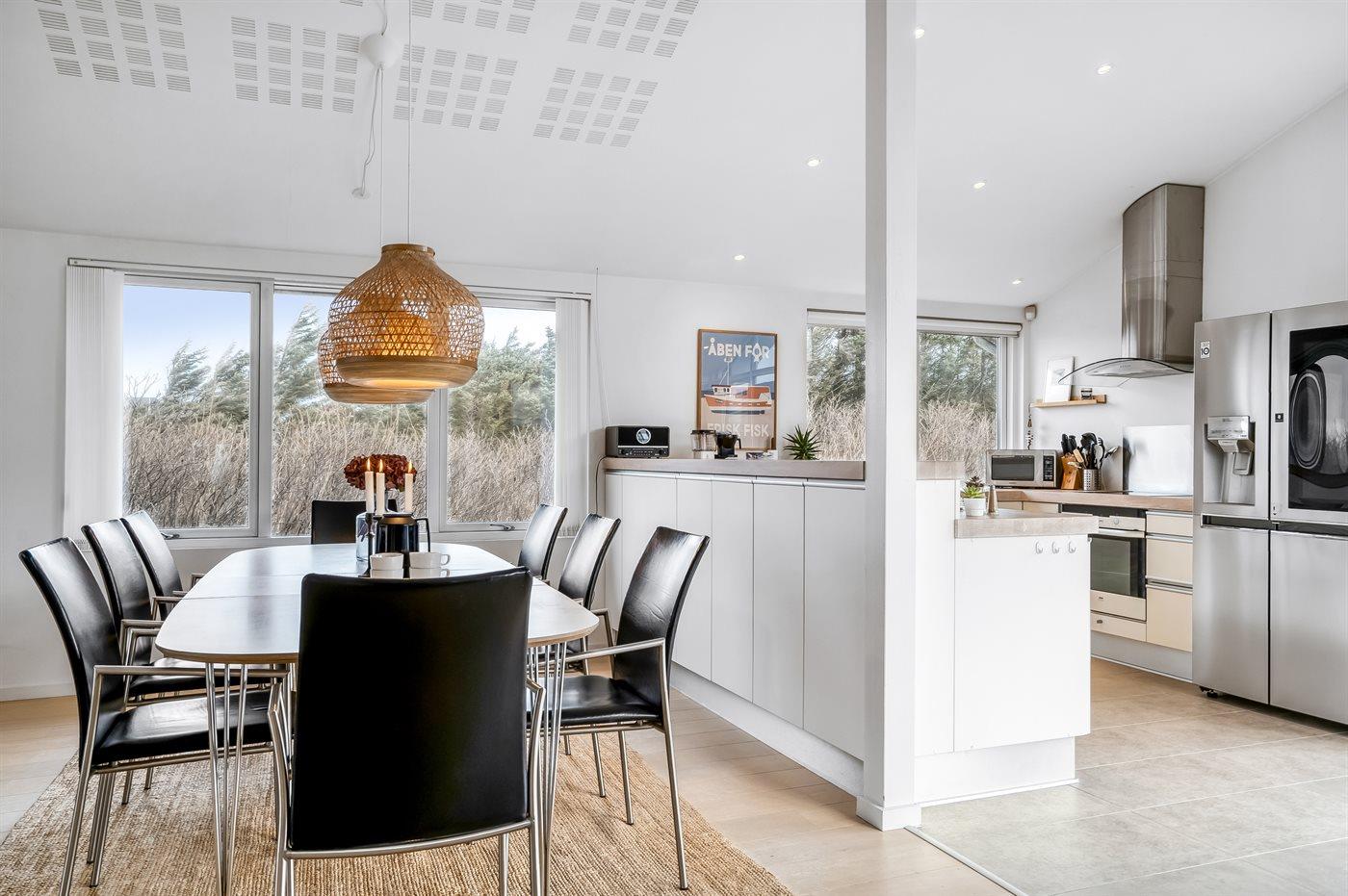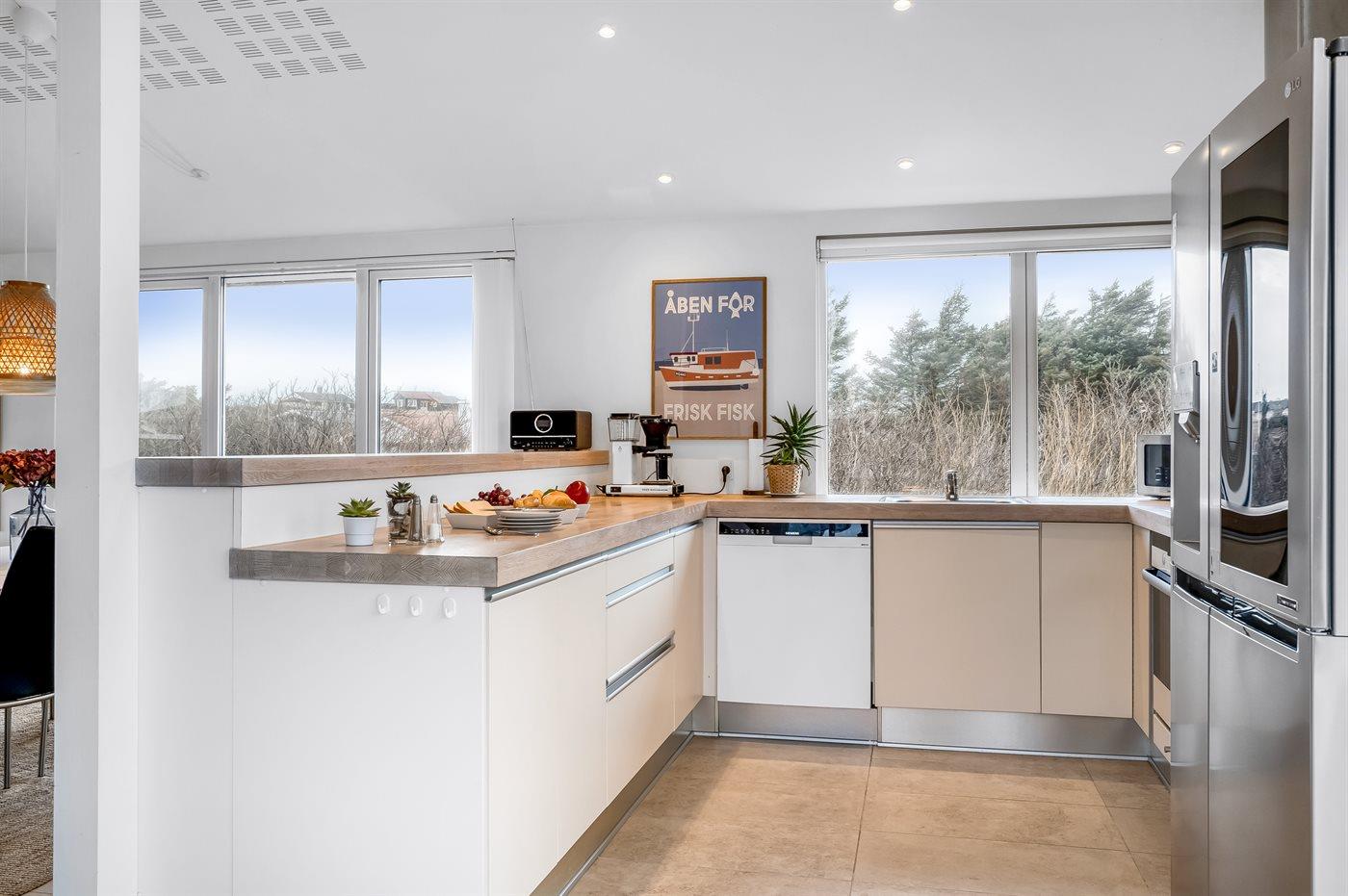 Køkkenet er udstyret med 1 amerikansk køleskab. Der er 4 keramiske kogeplader, varmluftovn, mikrobølgeovn samt opvaskemaskine.