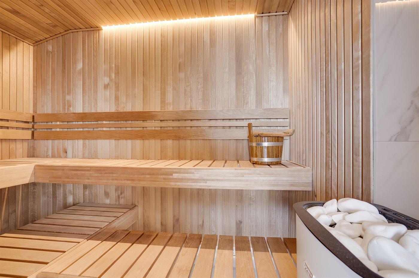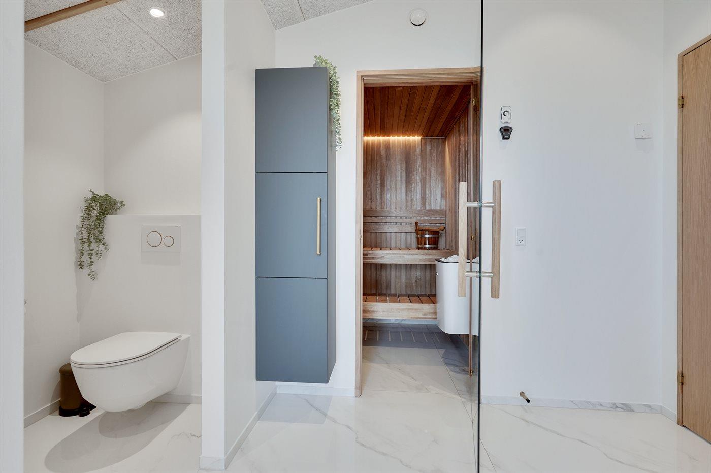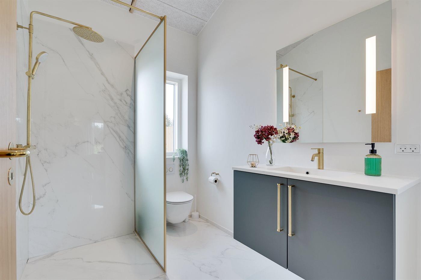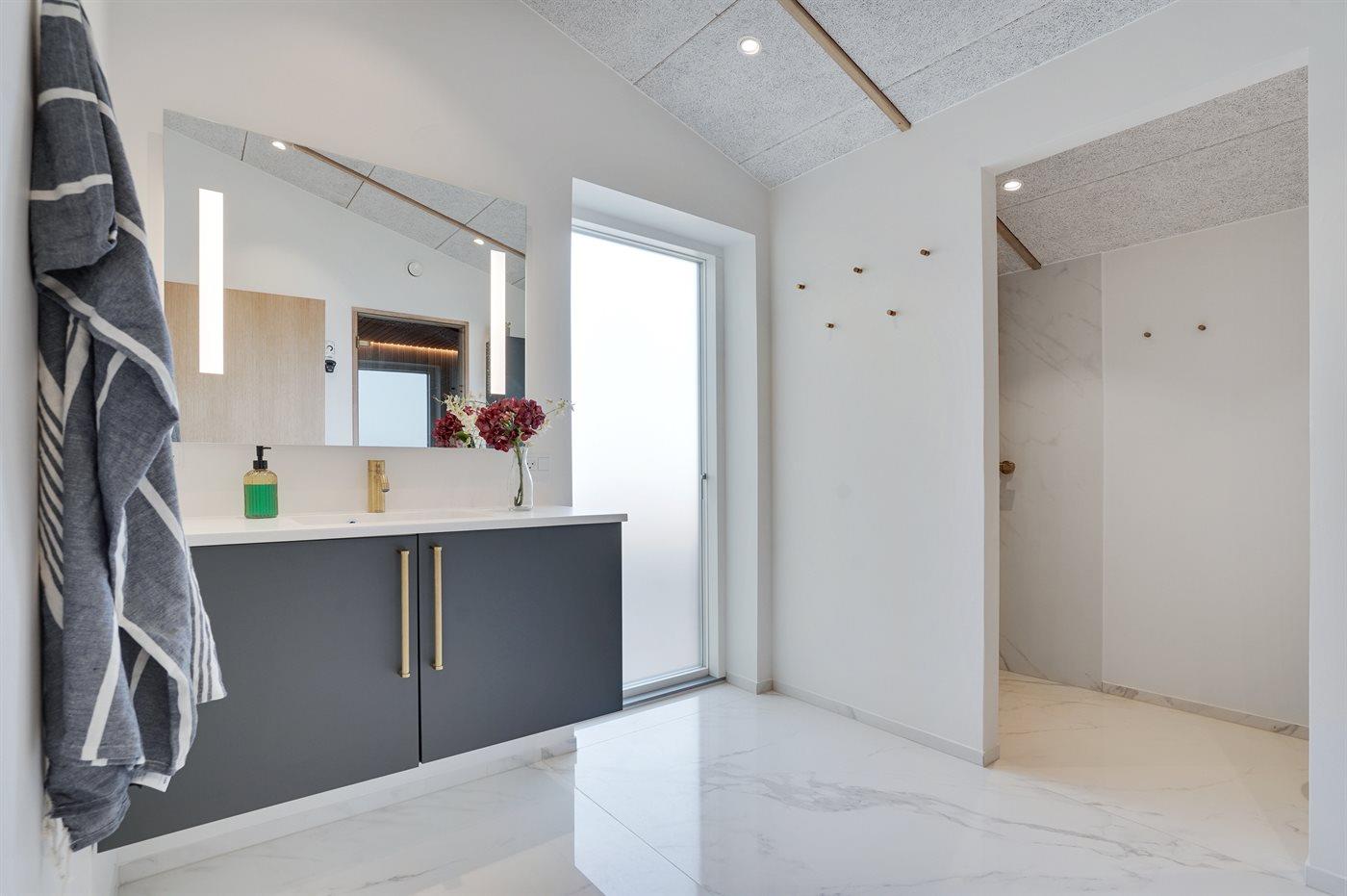 Der er 2 badeværelser med bruseniche og 2 toiletter. Der er gulvvarme på 2 badeværelser. I saunaen er der mulighed for afslapning.
