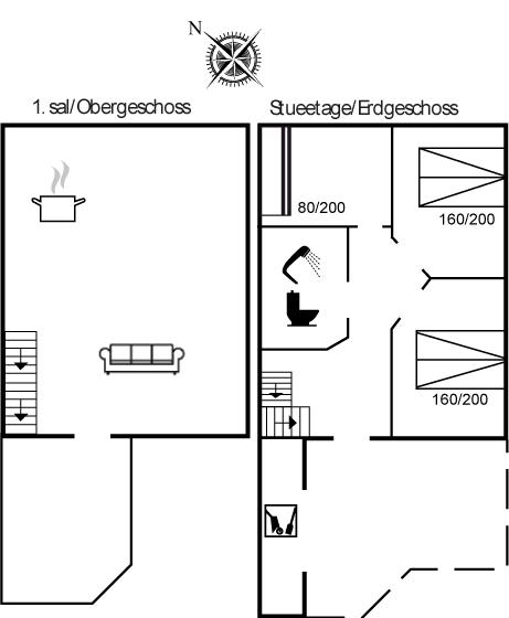 Der er i alt 3 soveværelser og 1 hems. Sovepladserne fordeler sig på 6 sovepladser i dobbeltsenge, hvoraf 2 af disse befinder sig på hems, og desuden 2 sovepladser i køjeseng. Derudover er der 1 stk. barneseng.