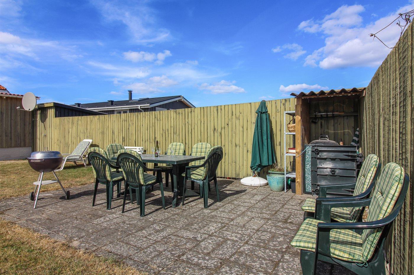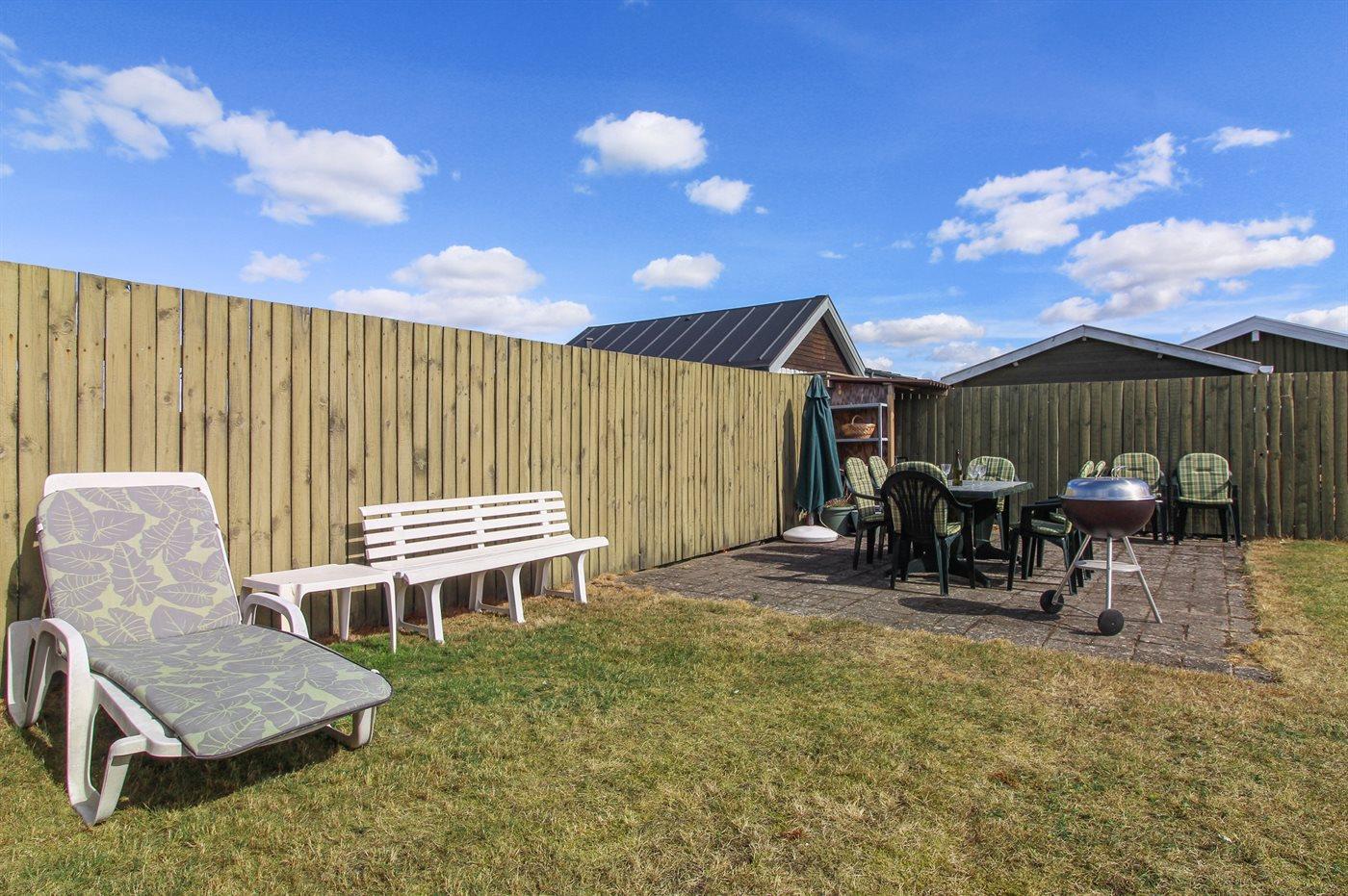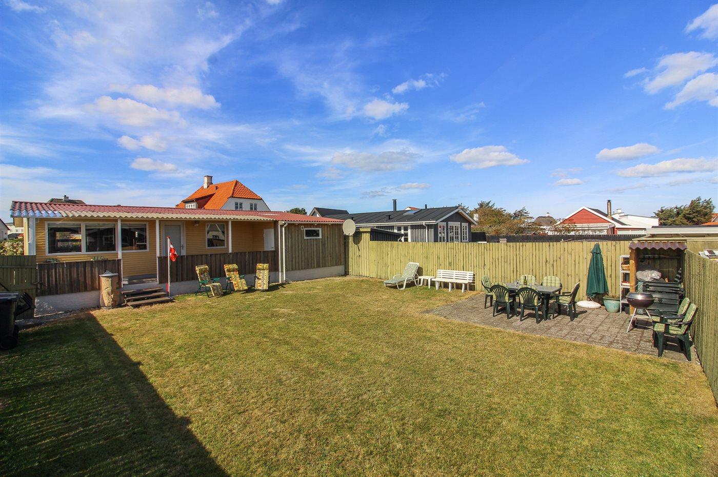 Ferieboligen er beliggende på en 433 m² stor naturgrund. Grunden er indhegnet. Der er 200 m til havet. Nærmeste forretning er beliggende i en afstand af 400 m. Til ferieboligen hører åbent terrasseareal. Desuden er der overdækket terrasse. Grill til rådighed. Parkering ved ferieboligen.