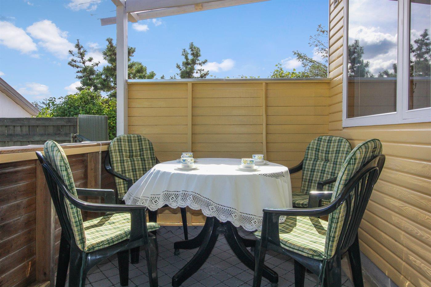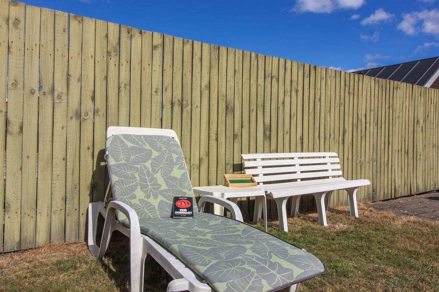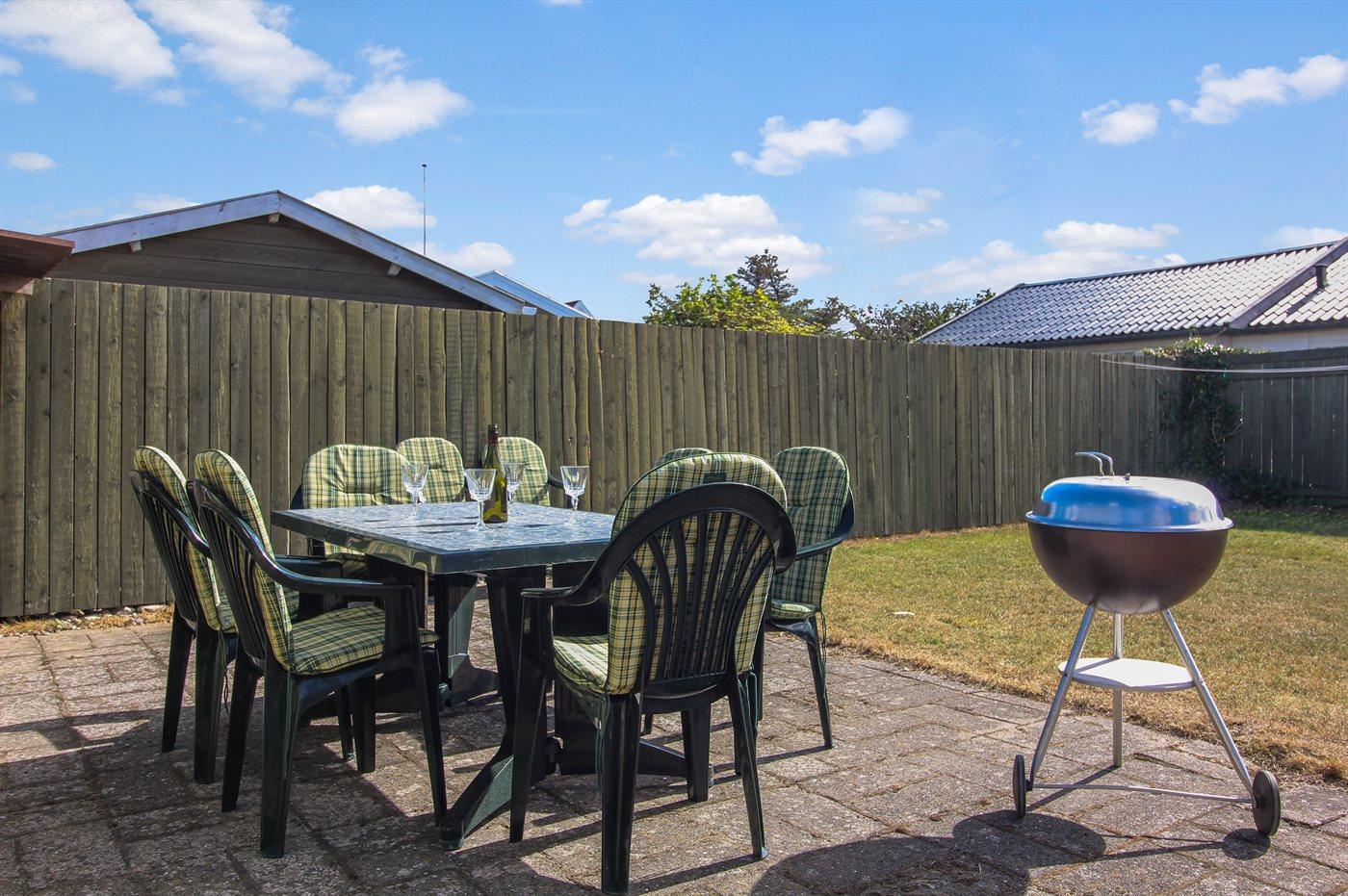 Ferieboligen er beliggende på en 433 m² stor naturgrund. Grunden er indhegnet. Der er 200 m til havet. Nærmeste forretning er beliggende i en afstand af 400 m. Til ferieboligen hører åbent terrasseareal. Desuden er der overdækket terrasse. Grill til rådighed. Parkering ved ferieboligen.