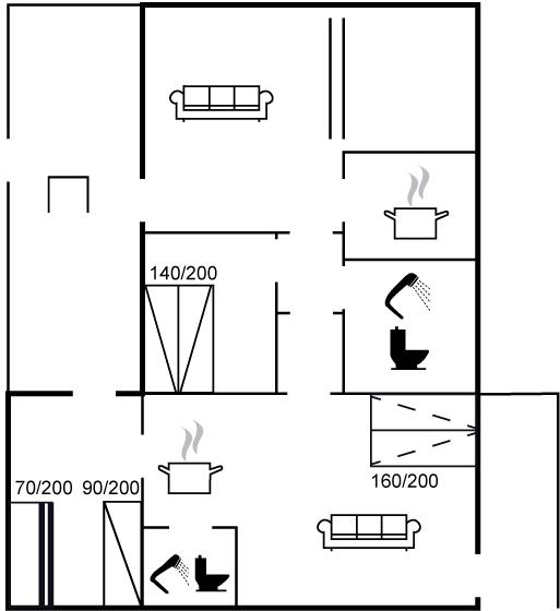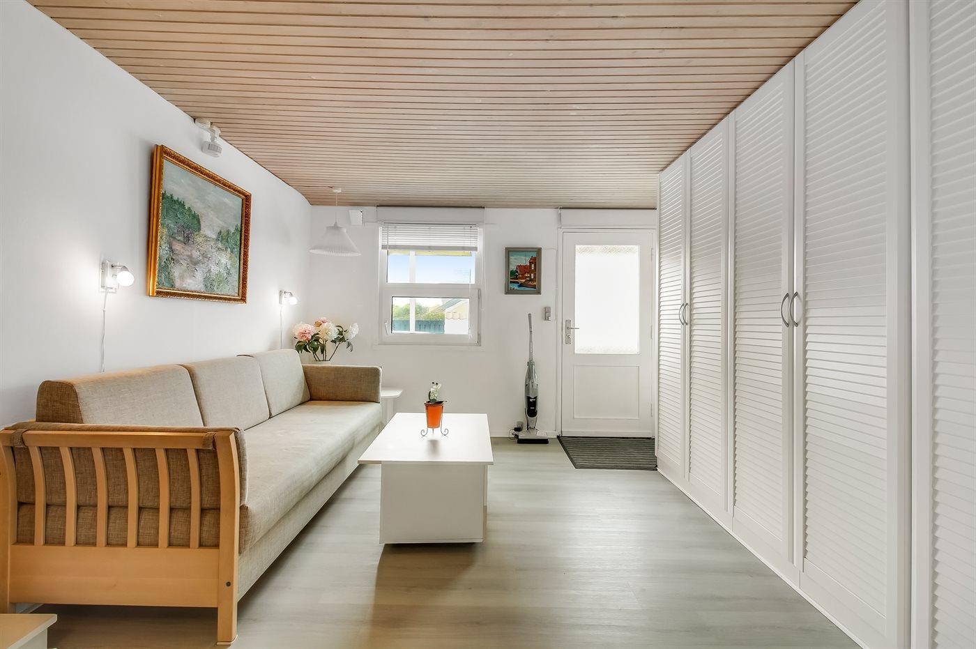 Der er i alt 2 soveværelser. Sovepladserne fordeler sig på: 2 sovepladser i dobbeltseng. 1 soveplads i enkeltseng. 2 sovepladser i køjeseng. 2 sovepladser i sovesofa (dobbelt). 2 af disse sovepladser befinder sig i stuen.