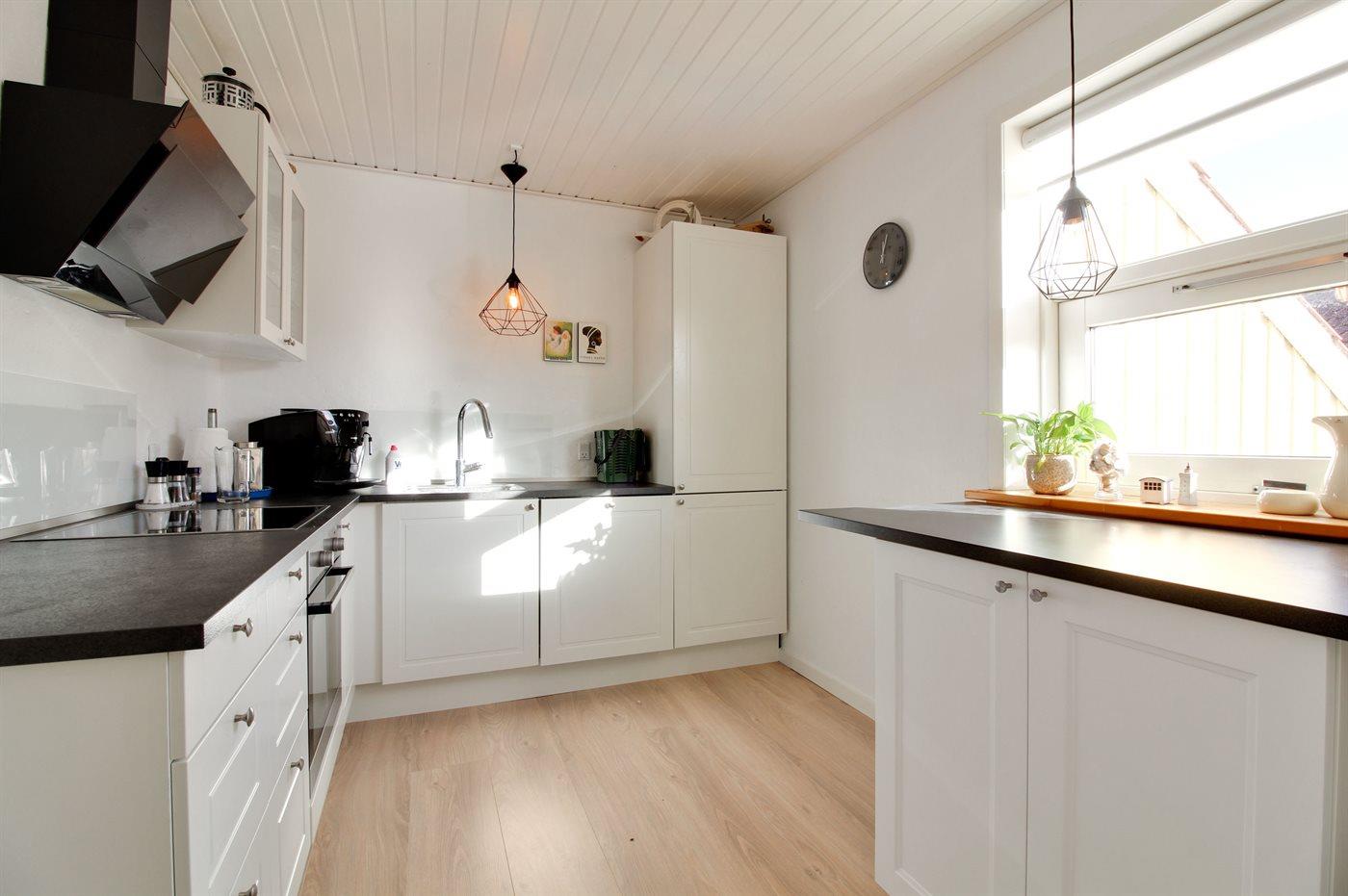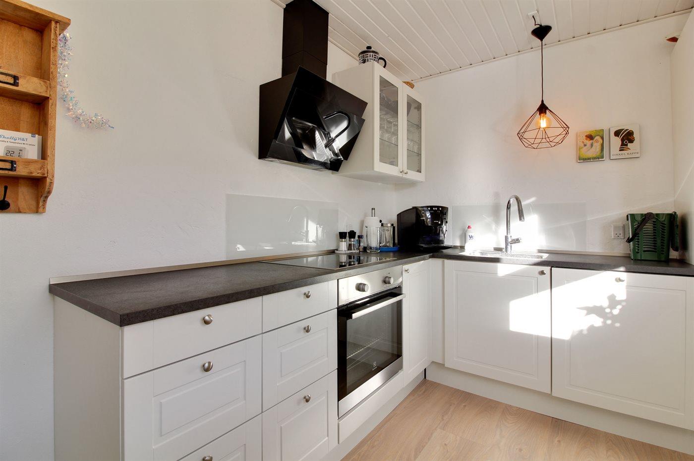 Køkkenet er udstyret med 1 køleskab. Der er 4 keramiske kogeplader, varmluftovn.