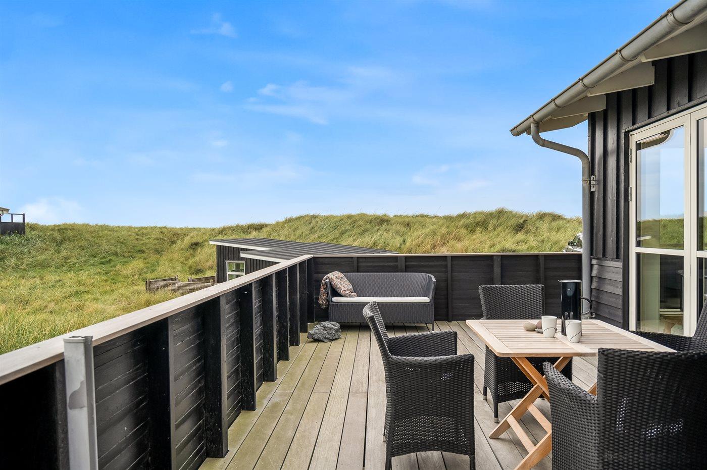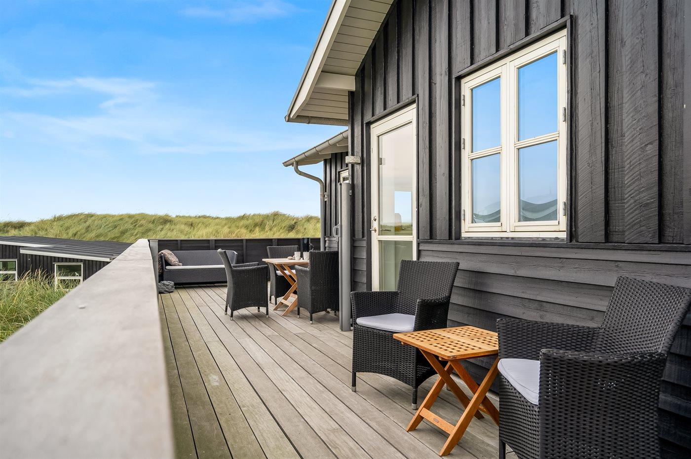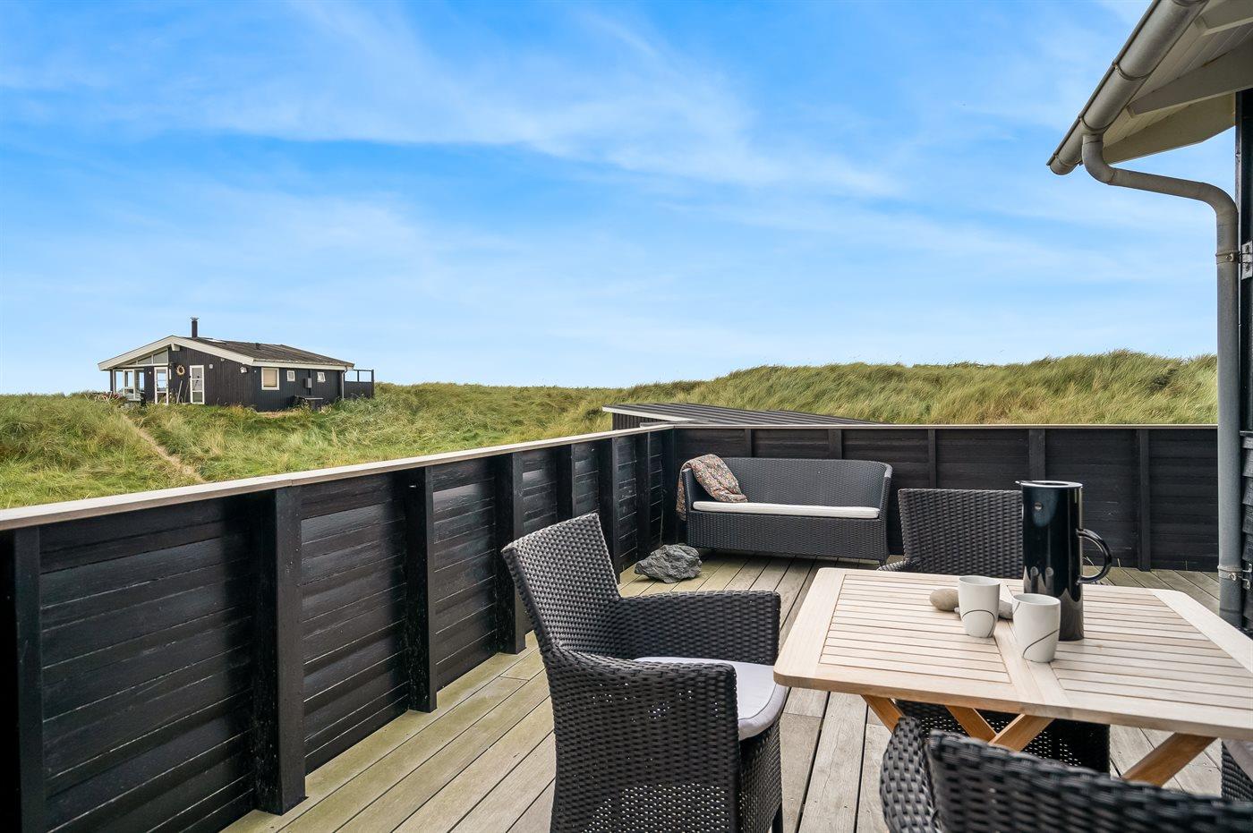 Huset omfavner naturen med store vinduer mod syd og vest, hvilket giver et dejligt aftenlys. Der er træterrasse omkring huset, og dette giver mulighed for at udnytte mange af døgnets timer udendørs - fra terrassen får du en følelse af, at du befinder dig i klitten. På østsiden af huset finder du en hyggelige, lille terrasse, hvor det er oplagt at nyde solopgangen med en kop kaffe. Her kan du ligeledes benytte udebruseren efter en lang dag på stranden.
