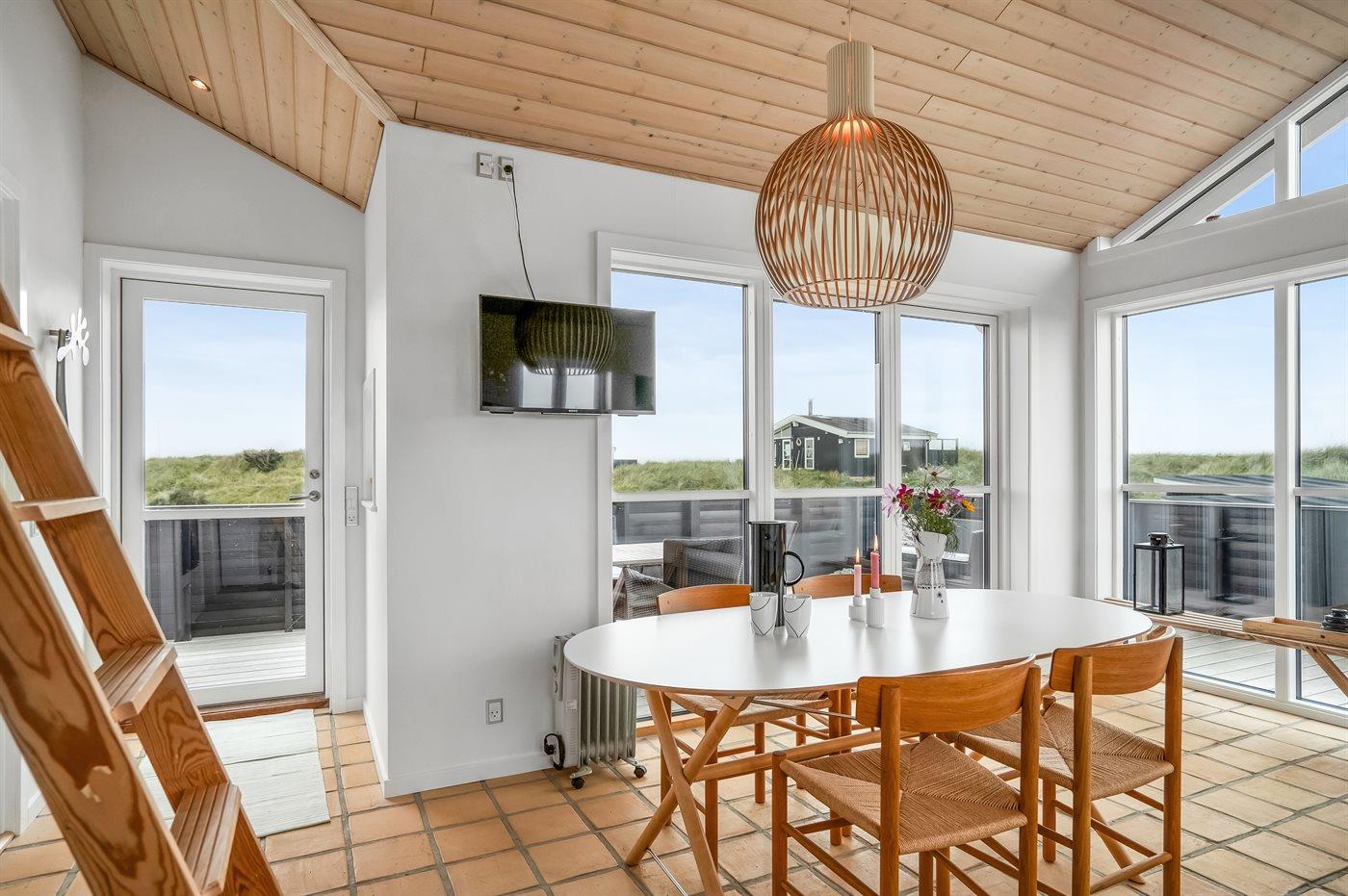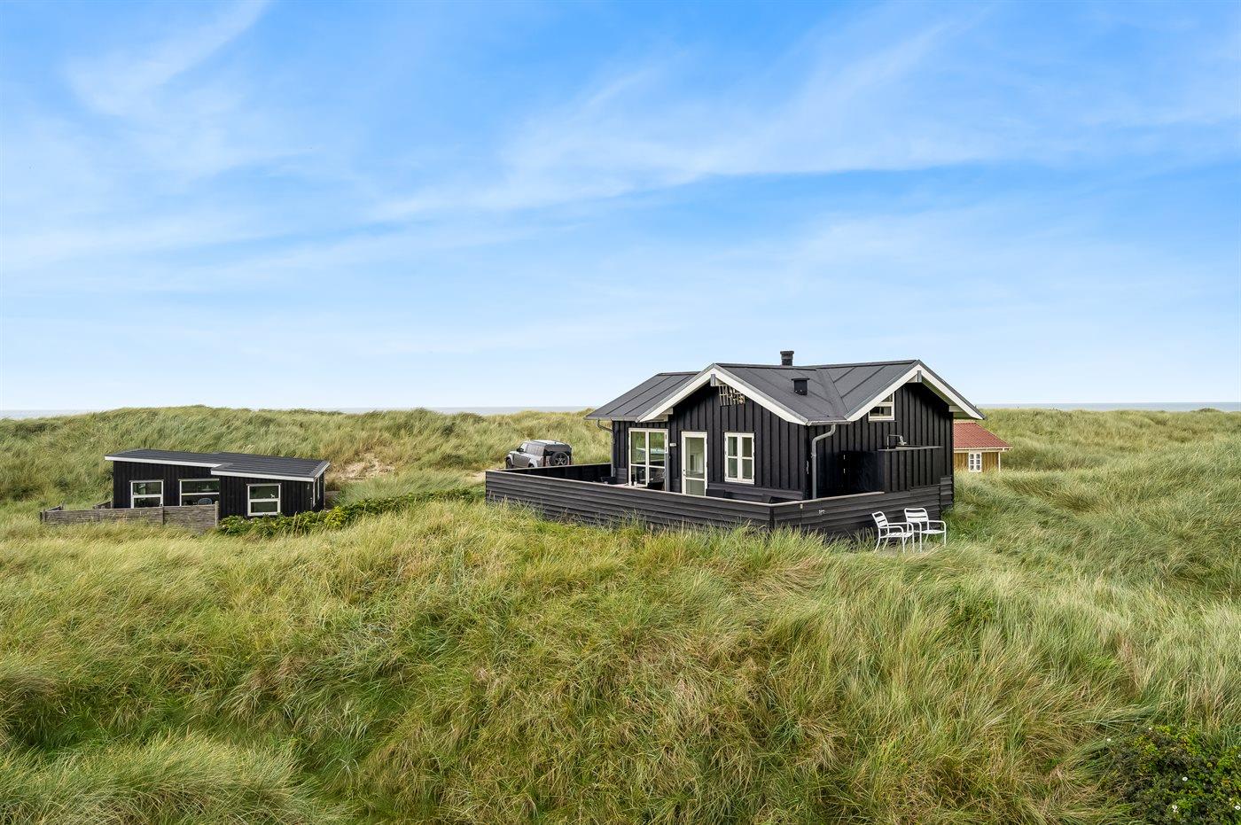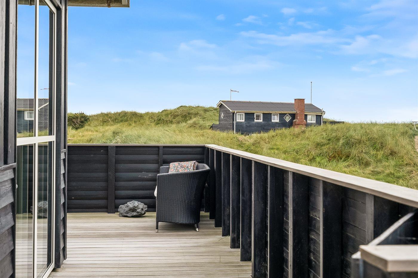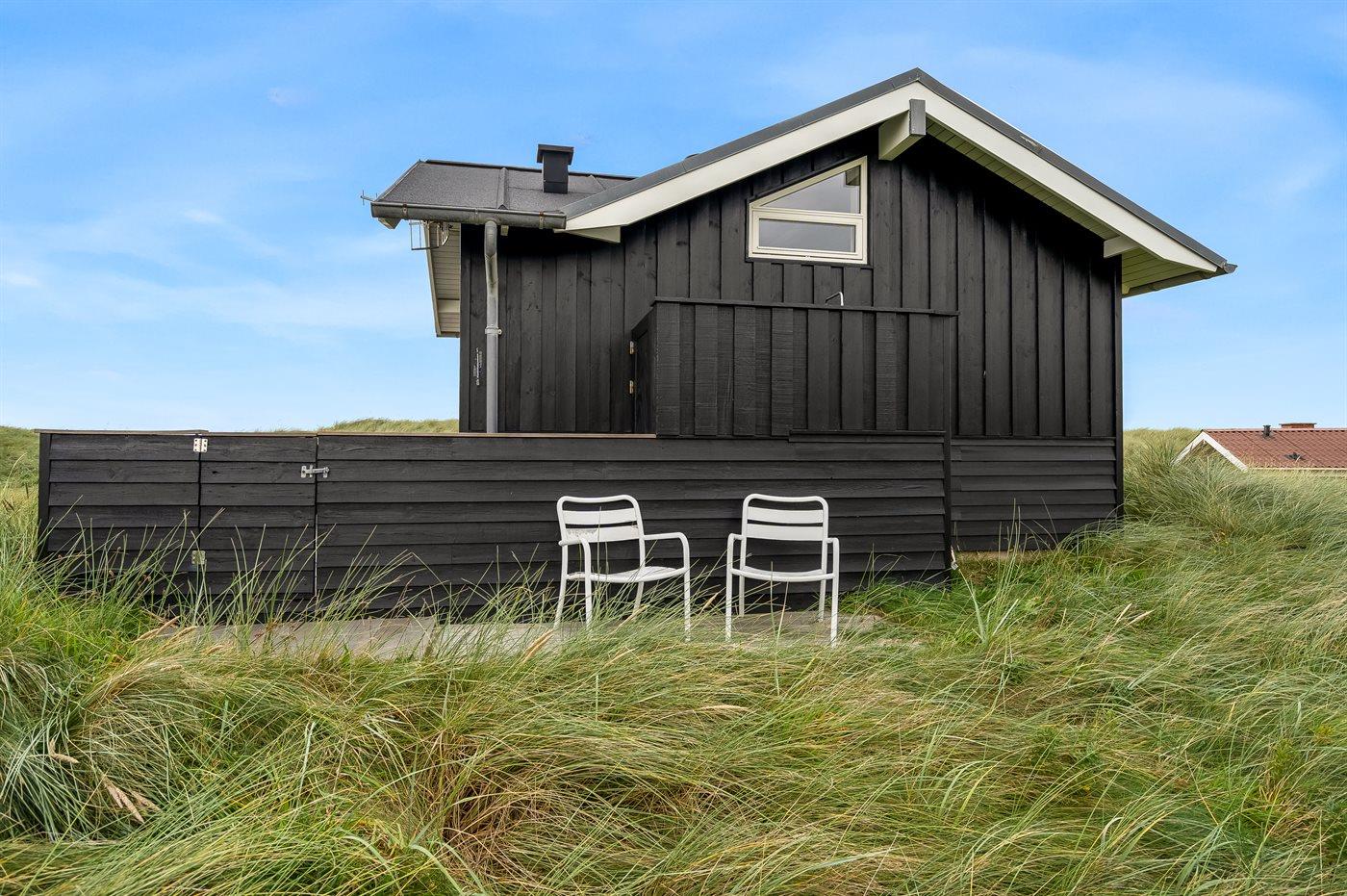 Huset omfavner naturen med store vinduer mod syd og vest, hvilket giver et dejligt aftenlys. Der er træterrasse omkring huset, og dette giver mulighed for at udnytte mange af døgnets timer udendørs - fra terrassen får du en følelse af, at du befinder dig i klitten. På østsiden af huset finder du en hyggelige, lille terrasse, hvor det er oplagt at nyde solopgangen med en kop kaffe. Her kan du ligeledes benytte udebruseren efter en lang dag på stranden.