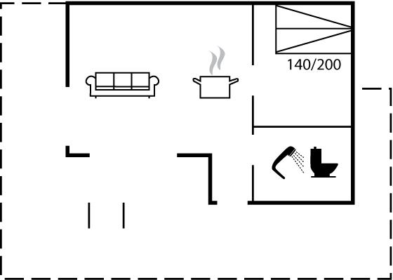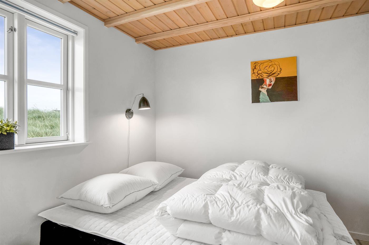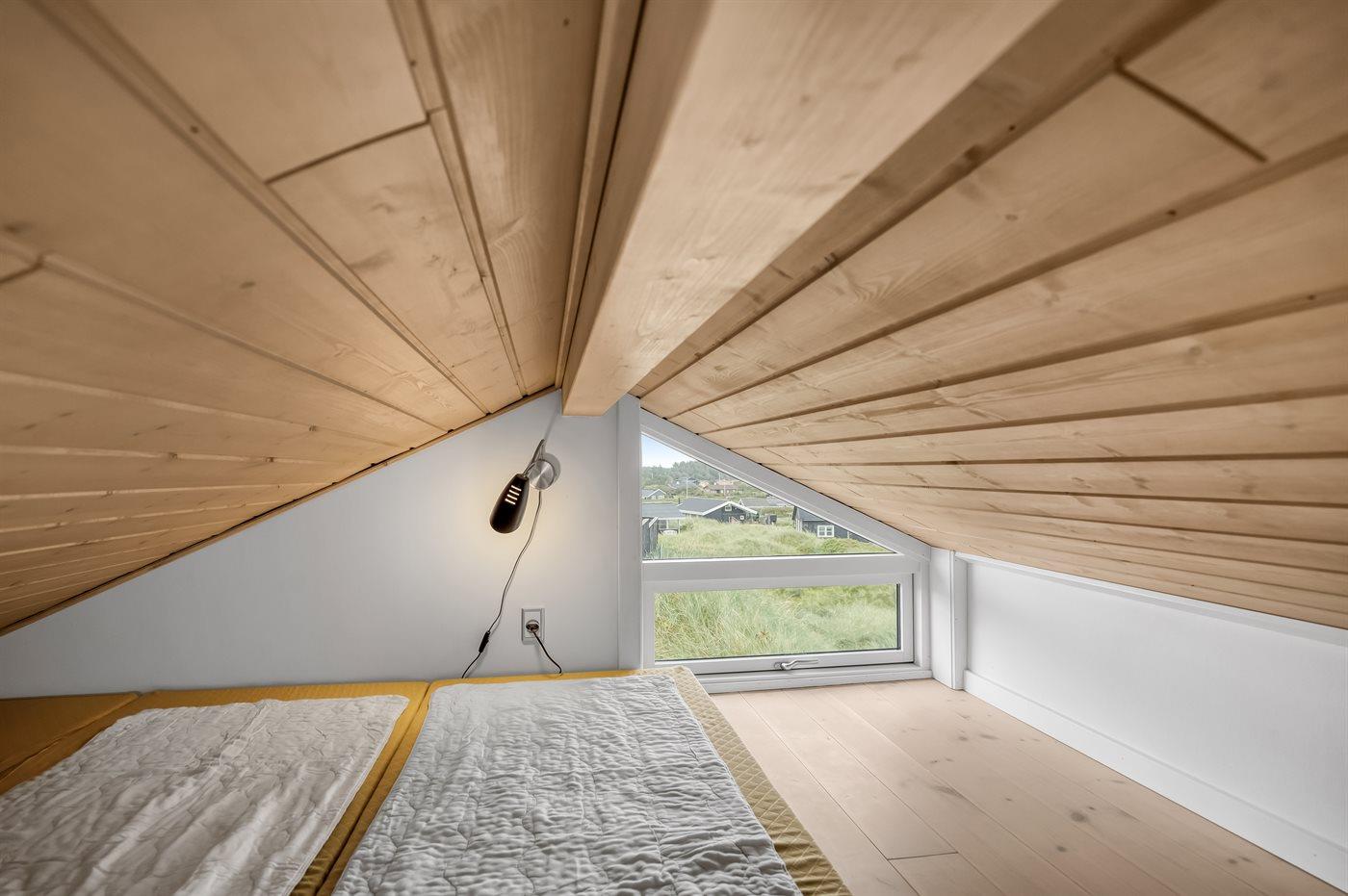 Der er i alt 1 soveværelse. Sovepladserne fordeler sig på: 2 sovepladser i dobbeltseng. 2 sovepladser på madrasser. 2 af disse sovepladser befinder sig på husets hems.