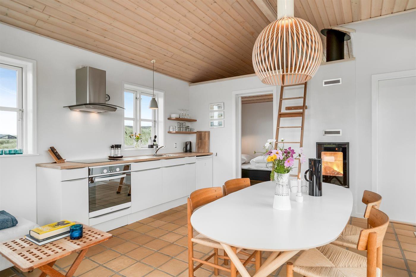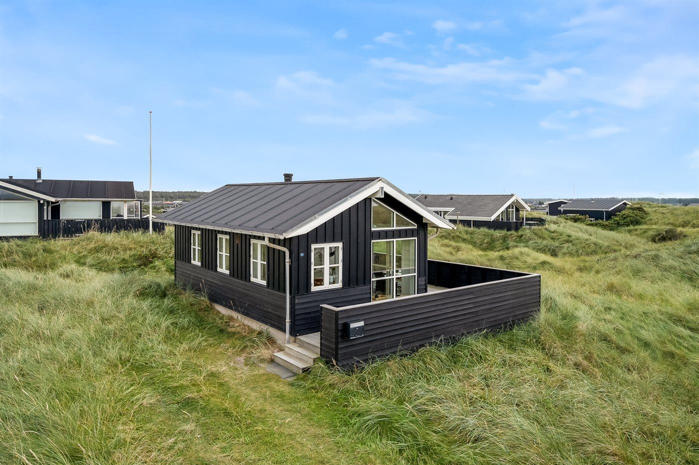 Hyggeligt sommerhus i første klitrække tæt på Vestkystens strand og natur med terrasse og brændeovn.