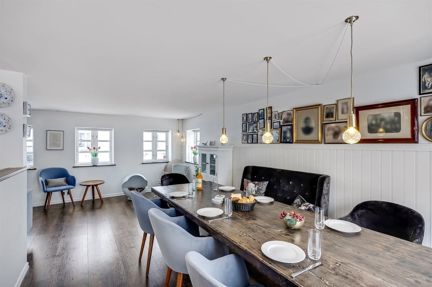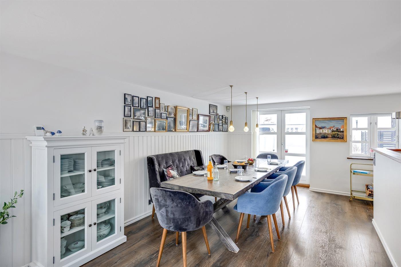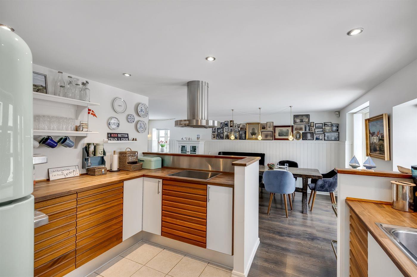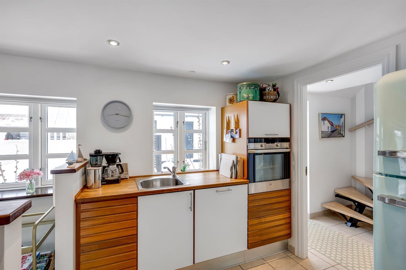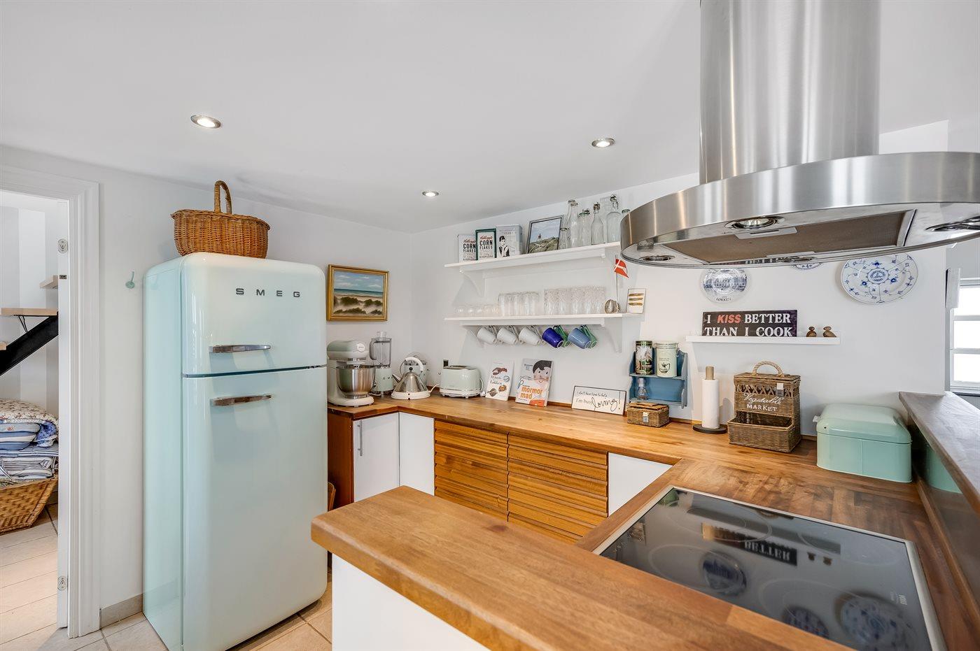 Køkkenet er udstyret med 1 køleskab. Der er 4 keramiske kogeplader, varmluftovn, mikrobølgeovn samt opvaskemaskine Der er gulvvarme i køkkenet.