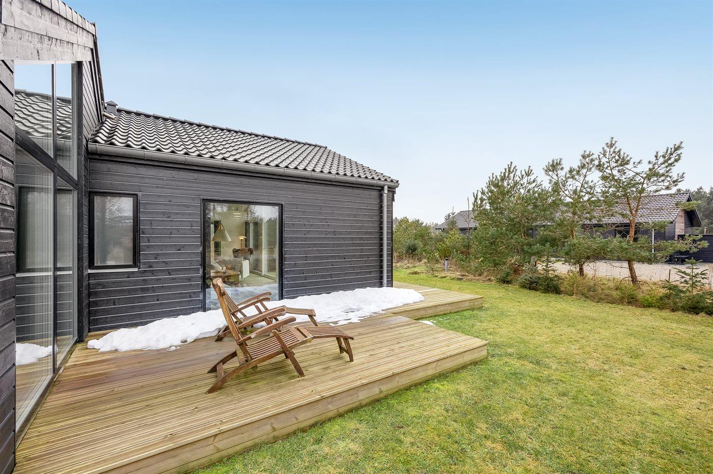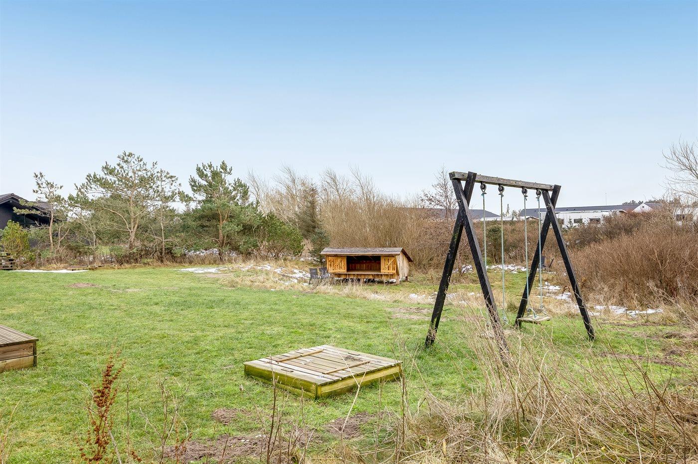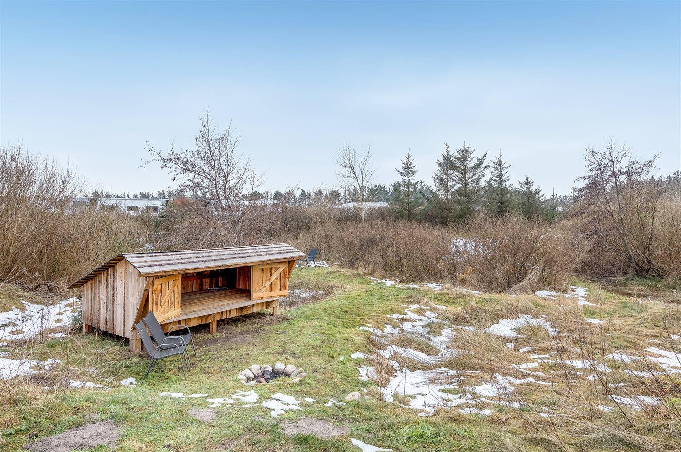 Ferieboligen er beliggende på en 2548 m² stor naturgrund. Der er 900 m til havet. Nærmeste forretning er beliggende i en afstand af 1200 m. Til ferieboligen hører åbent terrasseareal. Desuden er der overdækket terrasse. Gynge. Sandkasse. Bålsted. Shelter. Udendørs bruser. Grill til rådighed. Parkering ved ferieboligen.