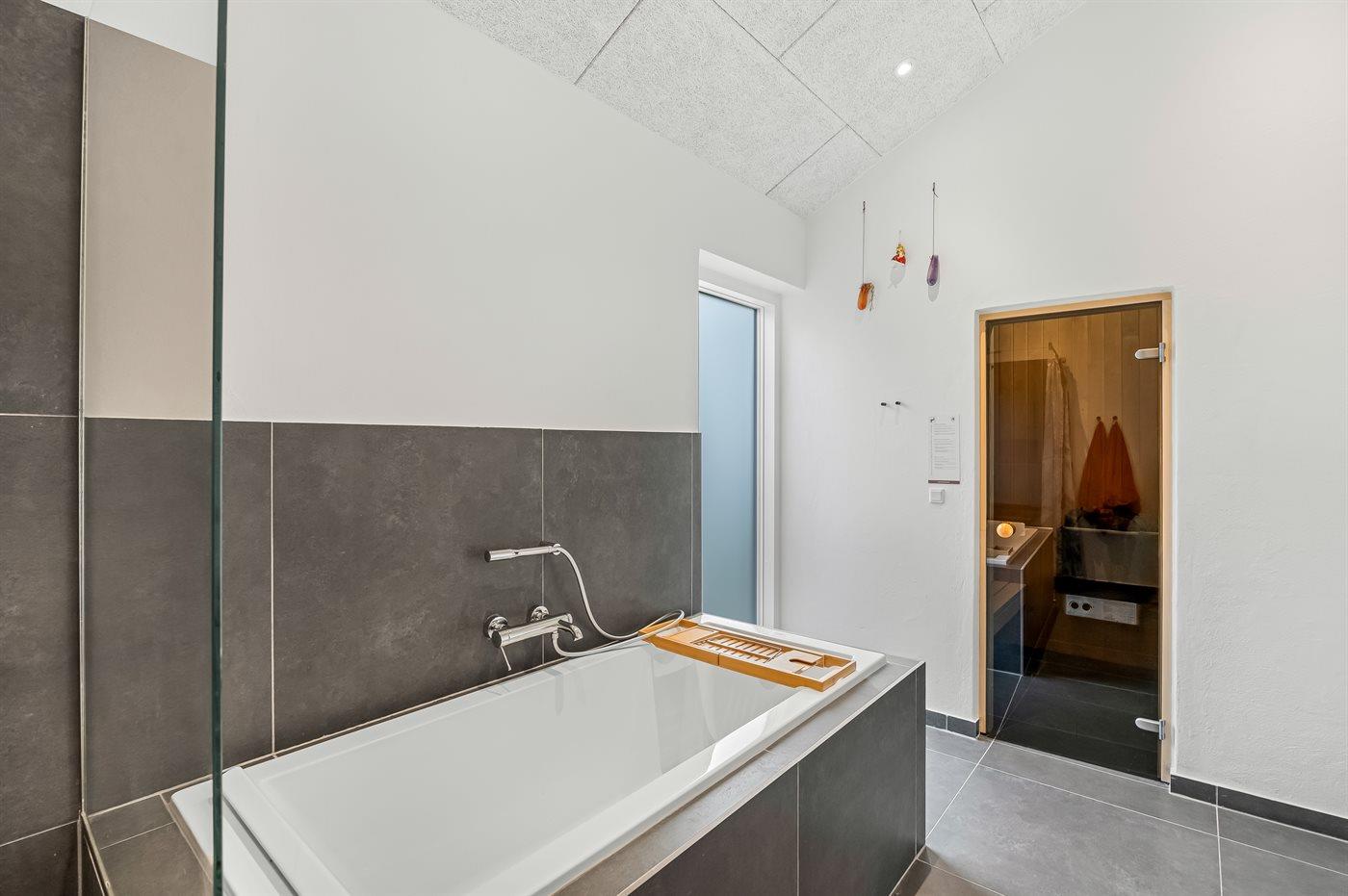Der er 2 badeværelser med bruseniche og 2 toiletter. Der er gulvvarme på 2 badeværelser. I saunaen er der mulighed for afslapning.