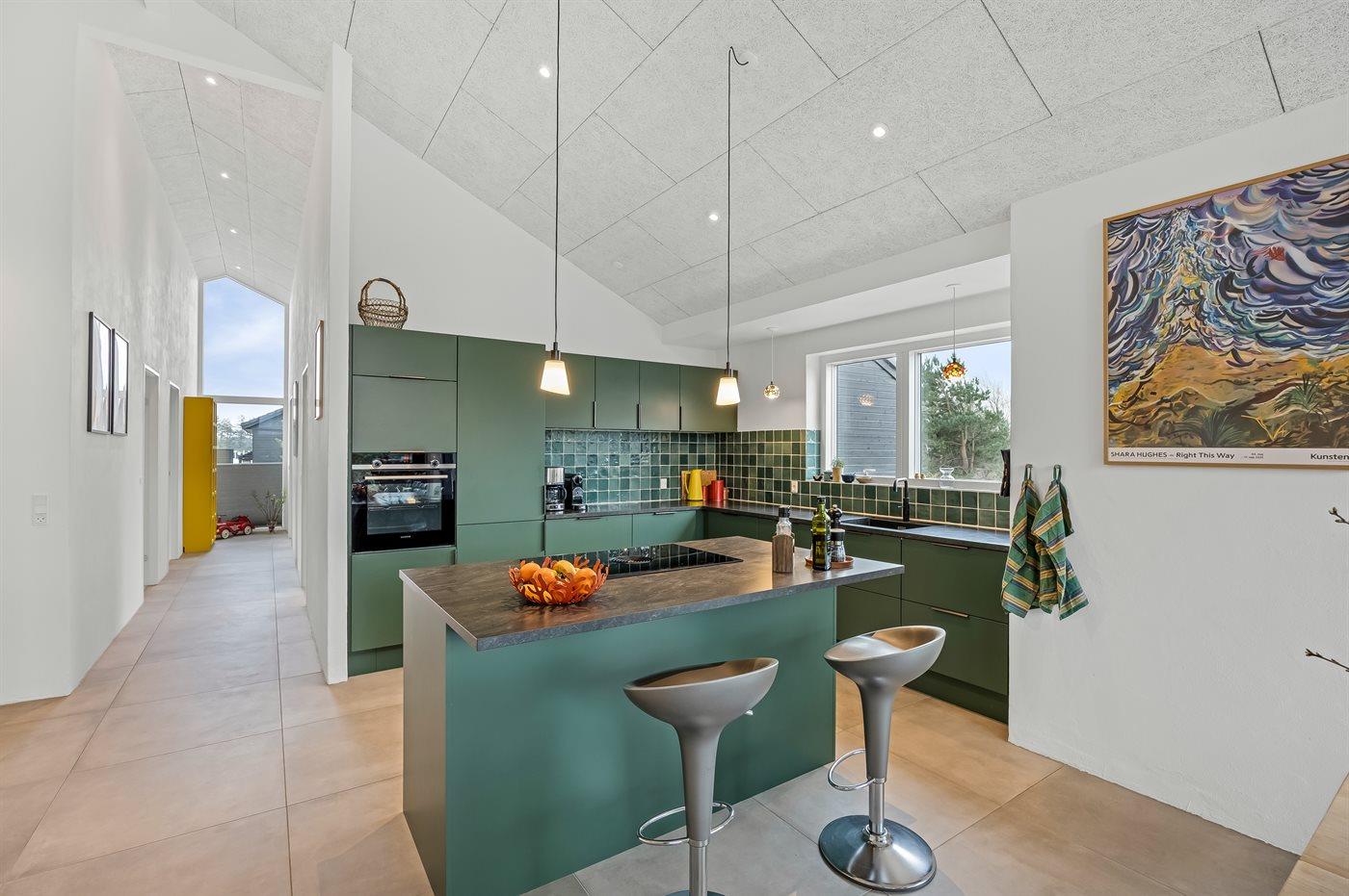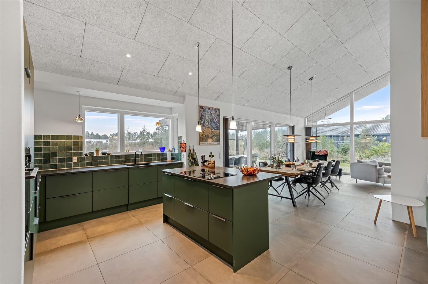 Køkkenet er udstyret med 1 køleskab. Der er 4 induktionskogeplader, varmluftovn, mikrobølgeovn samt opvaskemaskine.