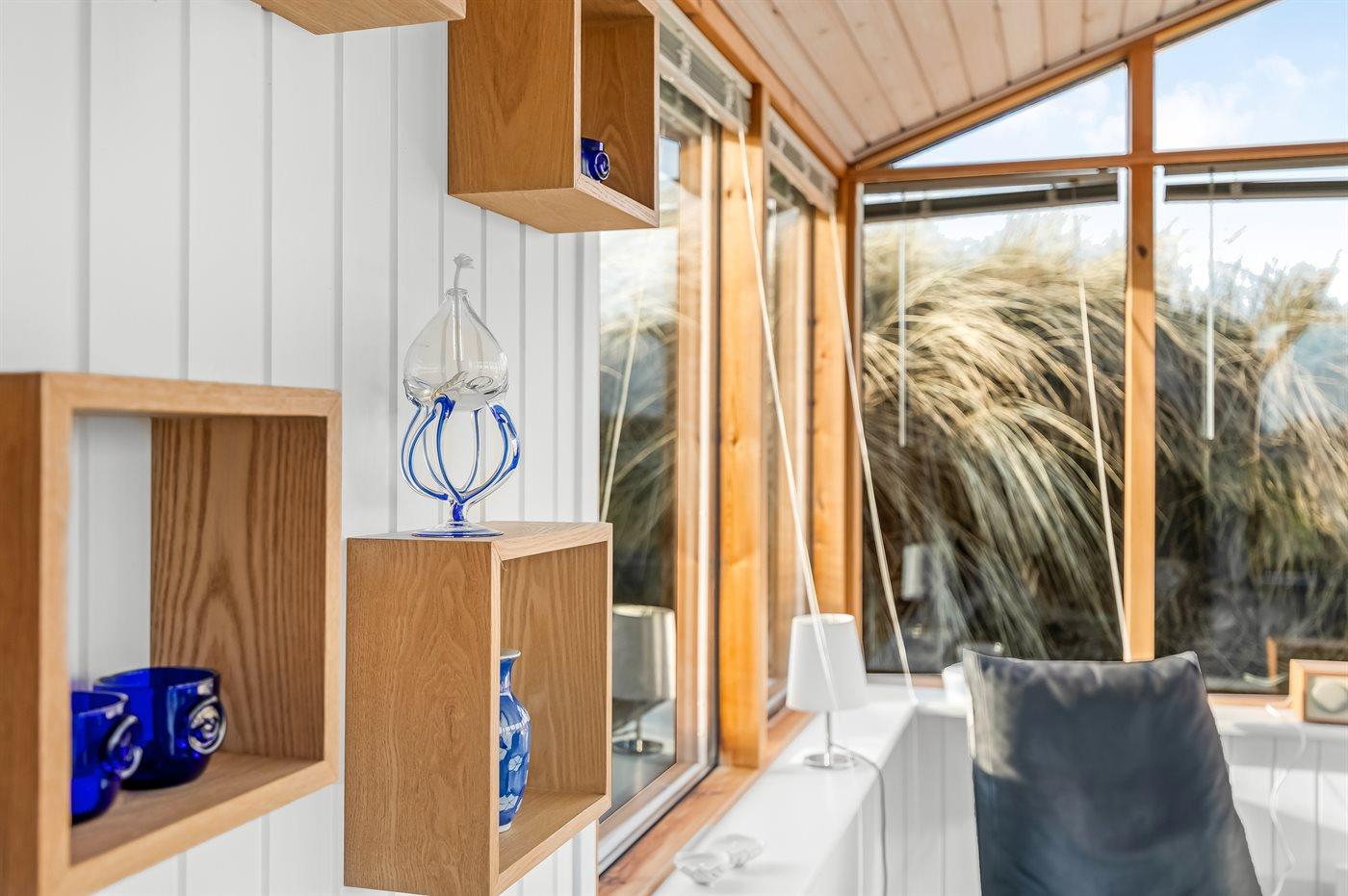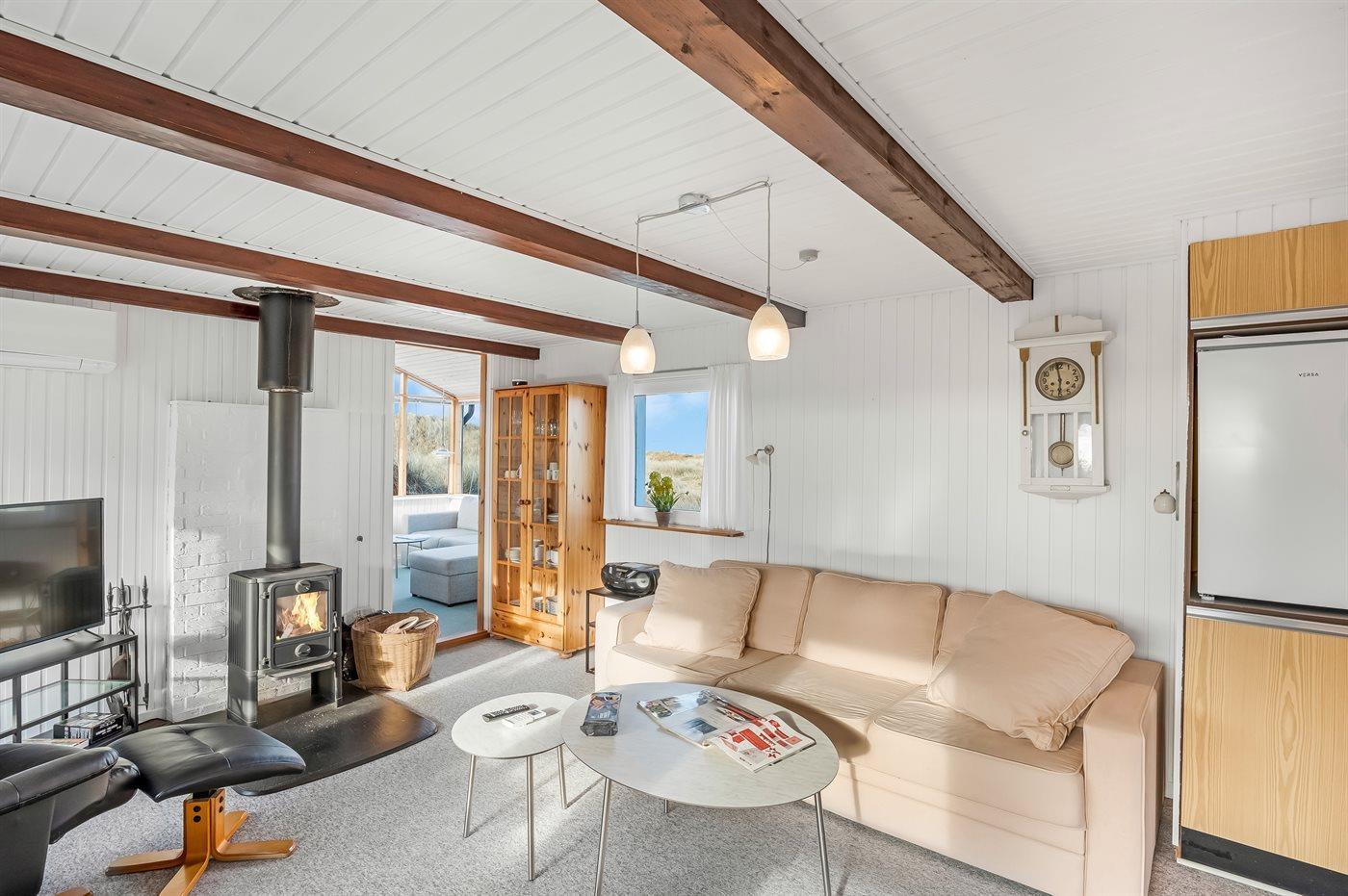 Indenfor er atmosfæren lys og afslappet med store vinduespartier, der lukker naturen helt ind med marehalmen tæt på vinduet. Stuerne og køkken ligger i åben forbindelse og skaber en naturlig ramme om samvær. Huset har to soveværelser samt sovesofa, badeværelse samt separat toilet og opvarmes via varmepumpe og brændeovn.