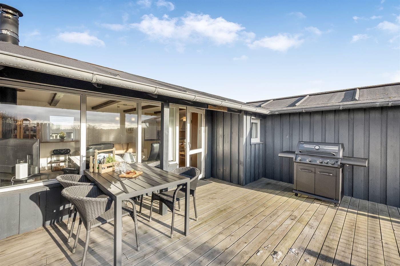 Udendørs er der opsat en ny gasgrill med 4 brændere, sideborde og Power burner – perfekt til hyggelige grillmiddage med udsigt og læ fra klitterne.