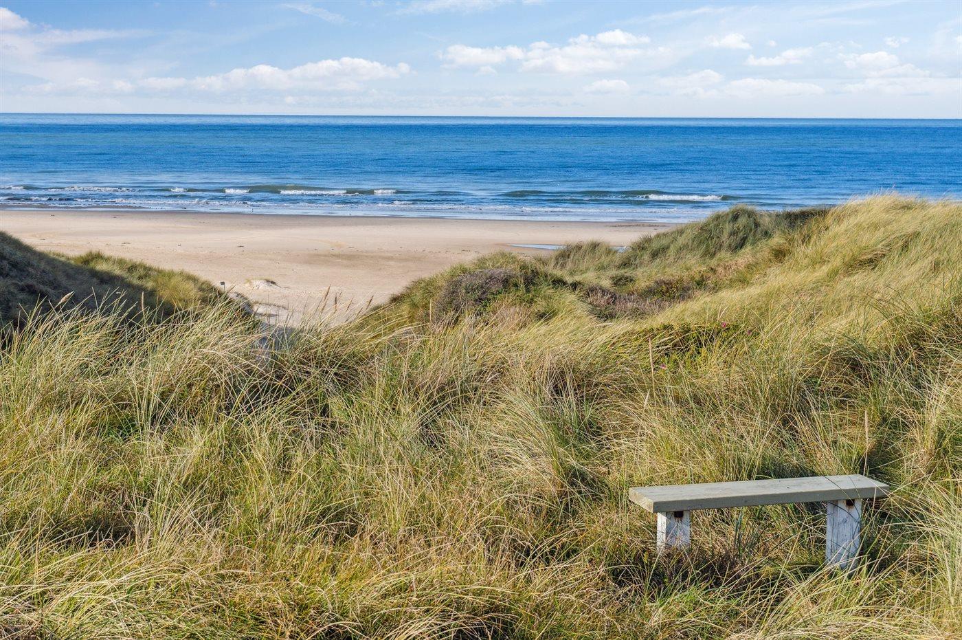 Sommerhuset er hævet smukt i landskabet på en stor klit- og naturgrund, hvilket giver en imponerende horisontudsigt i alle retninger. Fra både stue og køkken kan I nyde havets skiftende farver og det særlige lys over klitterne. Solopgangen kan opleves direkte fra soveværelset, mens solnedgangen nydes fra husets egen bænk i klitten – et helt unikt sted med panoramaudsigt over Vesterhavet.