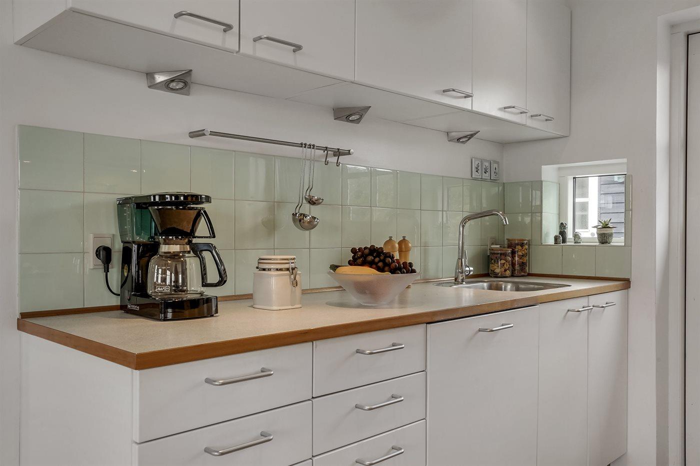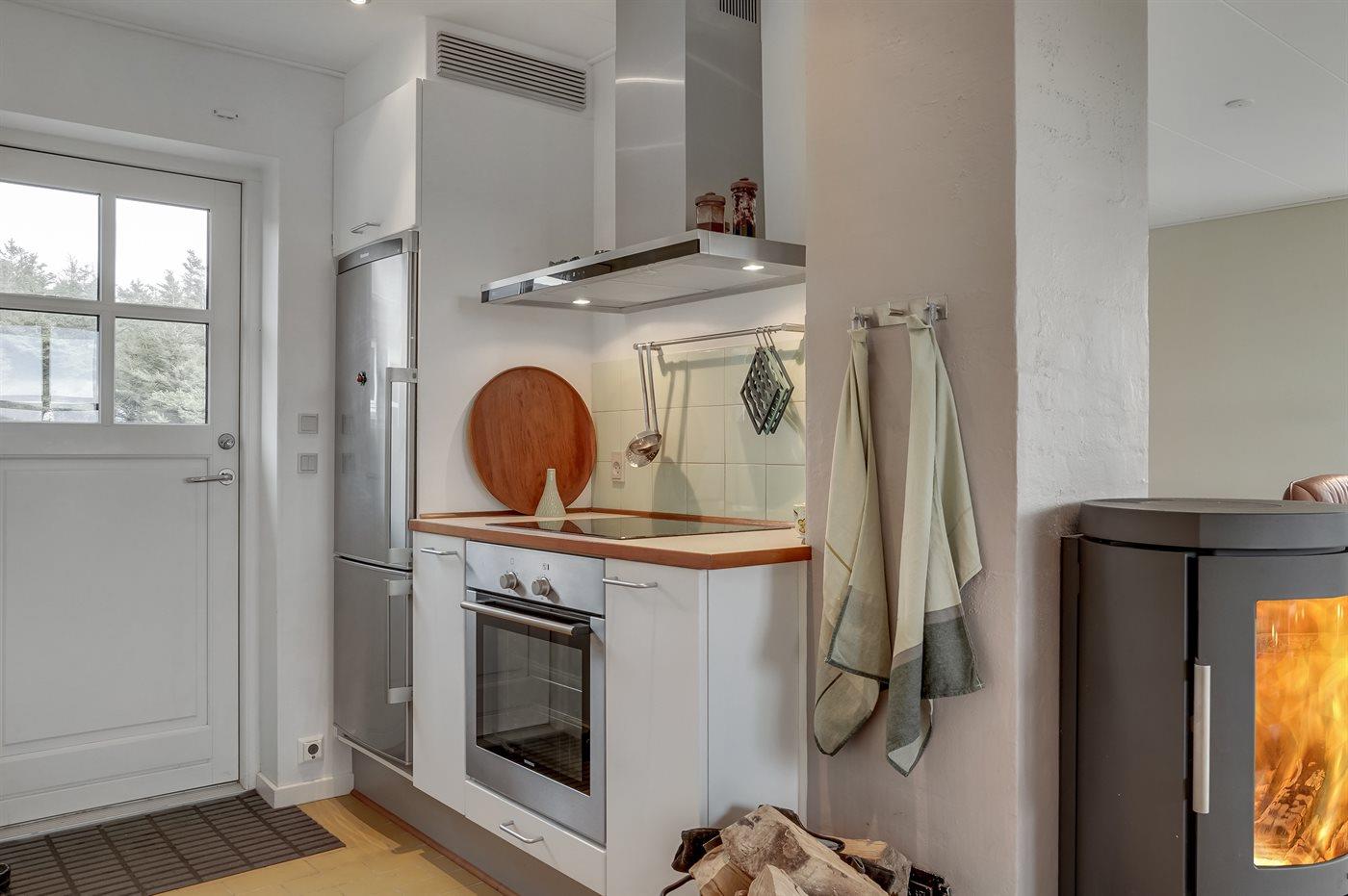 Køkkenet er udstyret med 1 køleskab. Der er 4 keramiske kogeplader, bageovn, mikrobølgeovn samt opvaskemaskine.