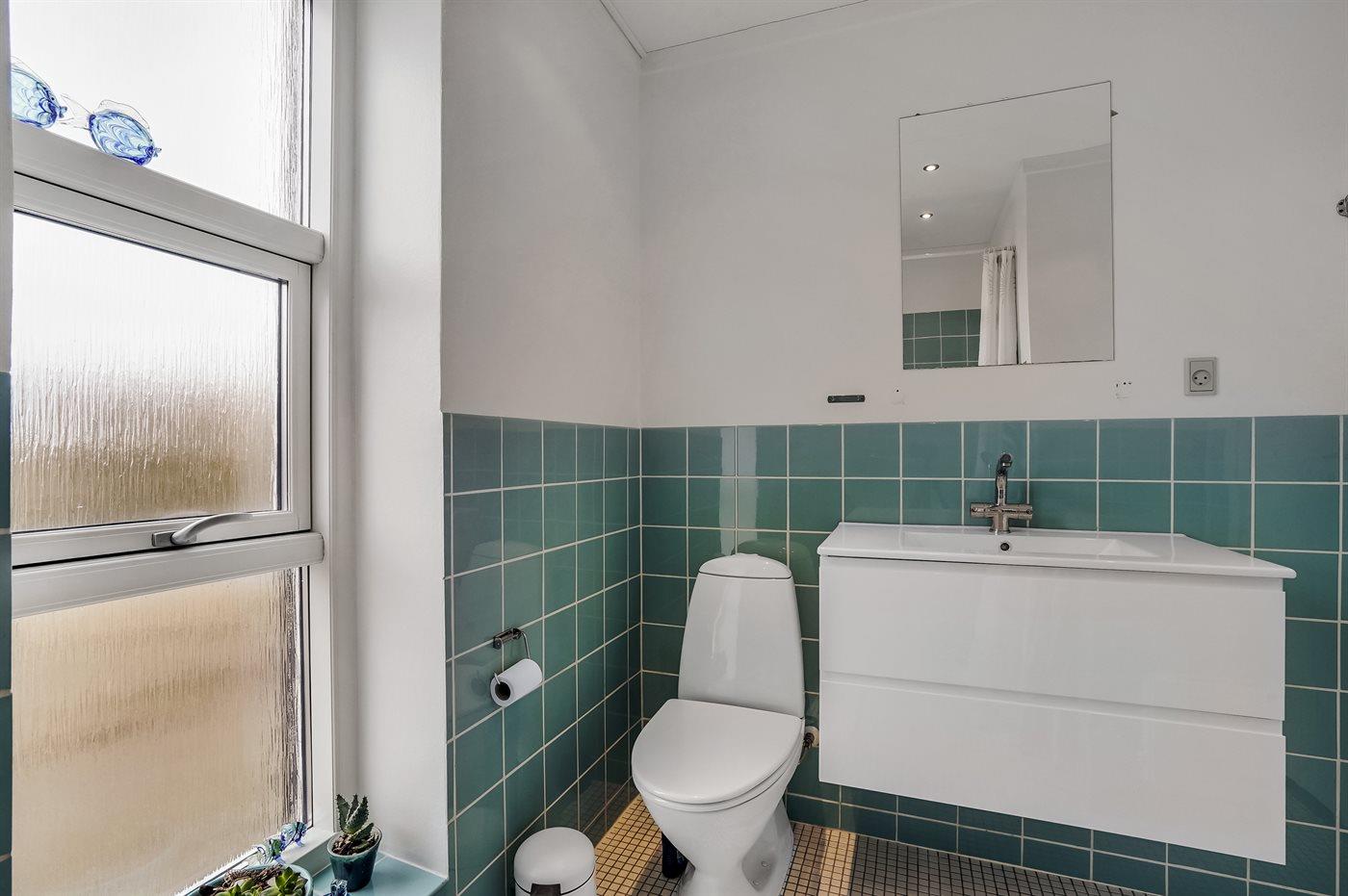 Der er 1 badeværelse med bruseniche og 2 toiletter, heraf 1 gæstetoilet. Der er gulvvarme på 1 badeværelse. Der er gulvvarme på gæstetoilettet.