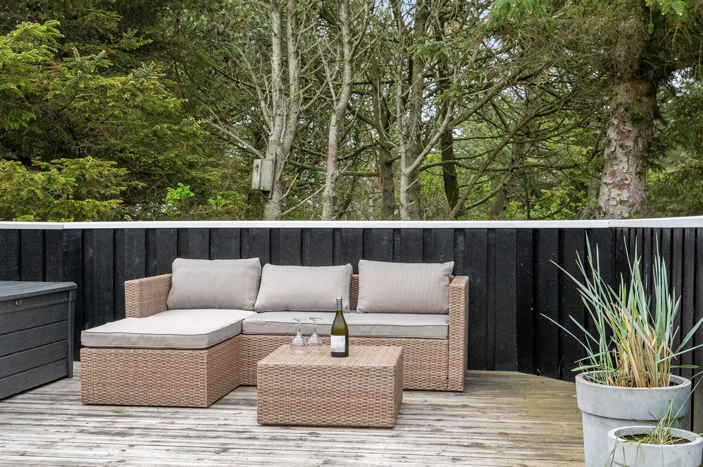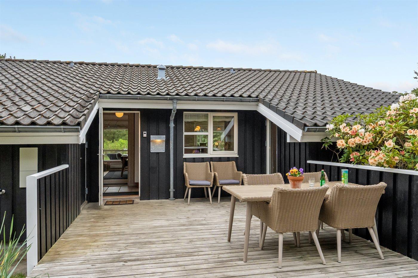 Der findes træterrasser på begge sider af huset (mod vest og mod øst), hvoraf en mindre del af den vestvendte terrasse er overdækket. Desuden findes der fliseterrasser ved begge gavle.