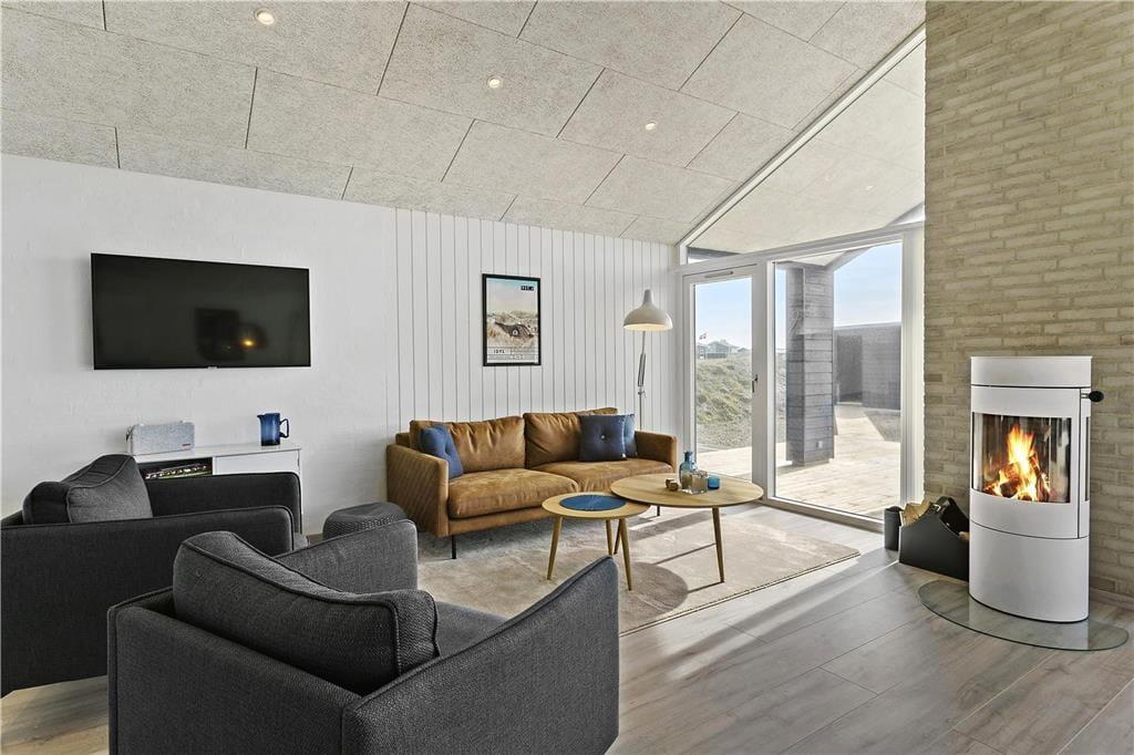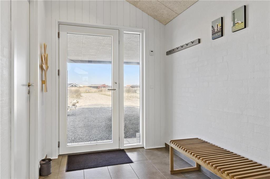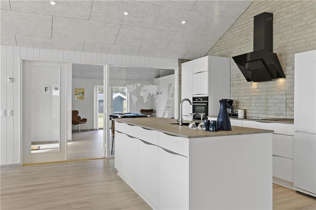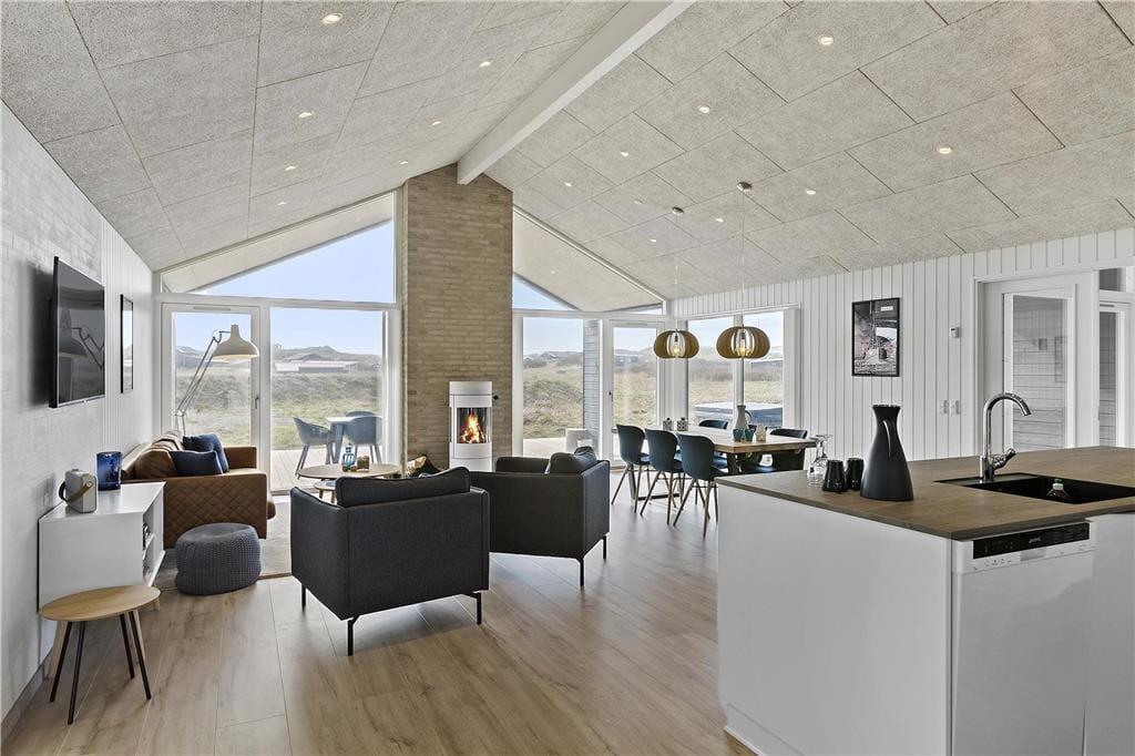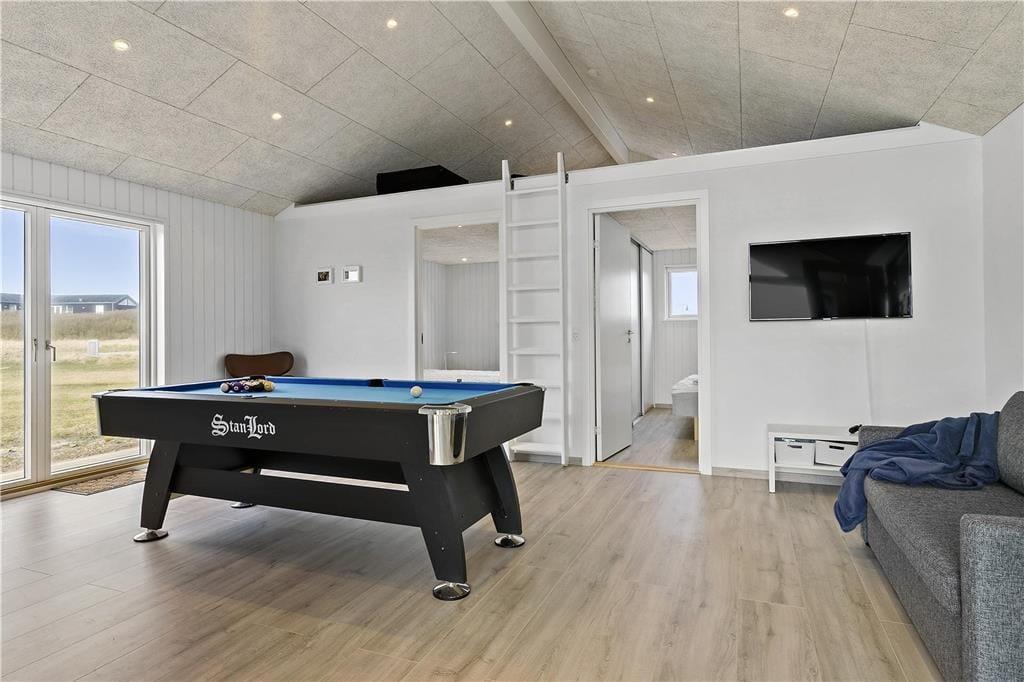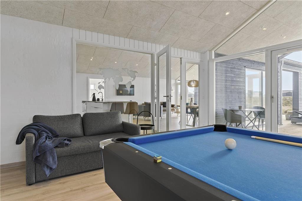 Huset byder på en carport helt oppe ved huset, hvor bilerne kan stå i læ og bagagen let kan løftes ind i huset. Entreen er rummelig med plads til overtøj og fodtøj. Bryggers indeholder vaskemaskine og tørretumbler og herfra er der adgang til et af husets badeværelser. Fra entreen går man direkte ind i et meget stort køkkenalrum med store vinduespartier i gavlen, som sikrer optimalt sollys gennen hele dagen. Huset er smagfuldt indrettet med en hyggelig sofagruppe i forbindelse med den topmoderne brændeovn. Lækkert åbent køkken med stor køkkenø. Spisepladsen er i den anden side af rummet og giver dermed en følelse af rigtig god plads og luft mellem møblerne. Herfra går man ind i de to af soveværelserne, hvor der i begge er direkte udgang til terrassen. I modsatte side ligger aktivitetsrummet, hvor der er TV, spillekonsol samt pool og bordtennis. Dermed er der rig mulighed for at hygge sig trods vejret. Der er en stige som fører op til hemsen, hvor der er tre madrasser. Fra aktivitetsrummet kan man gå ind i de to sidste soveværelser. I aktivitetsrummet står en sofa med plads til 2 personer. herfra også adgang til det store badeværelse som indeholder både bruser samt spa.