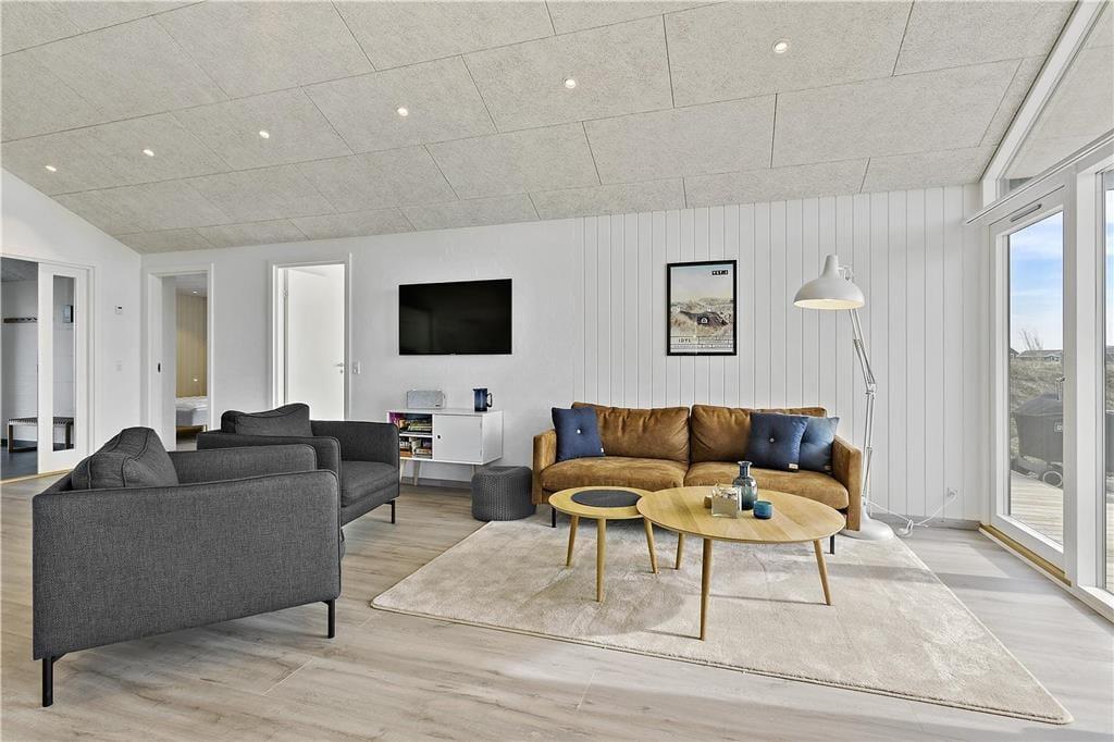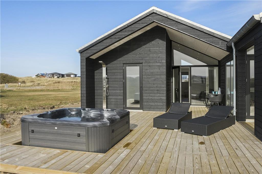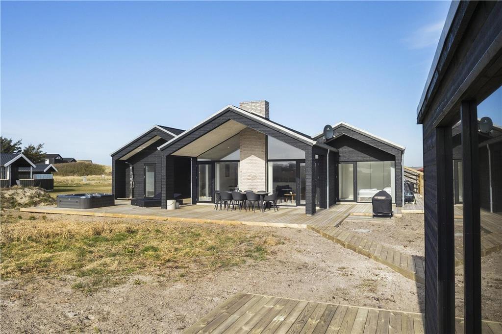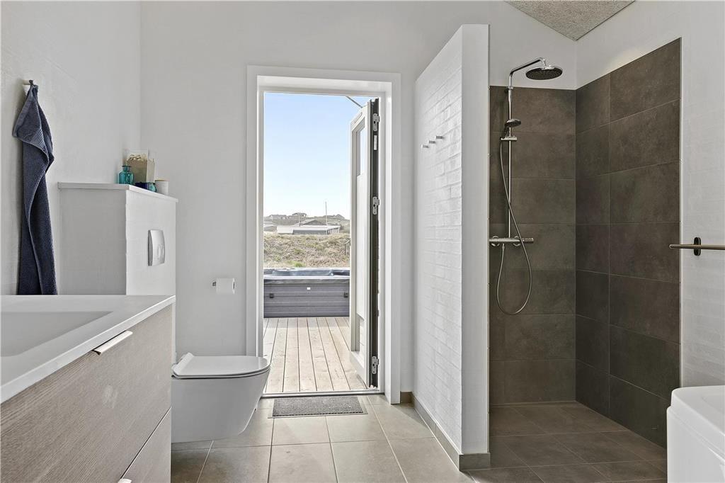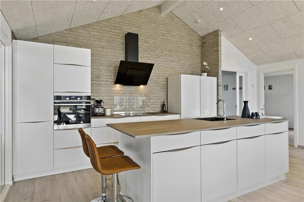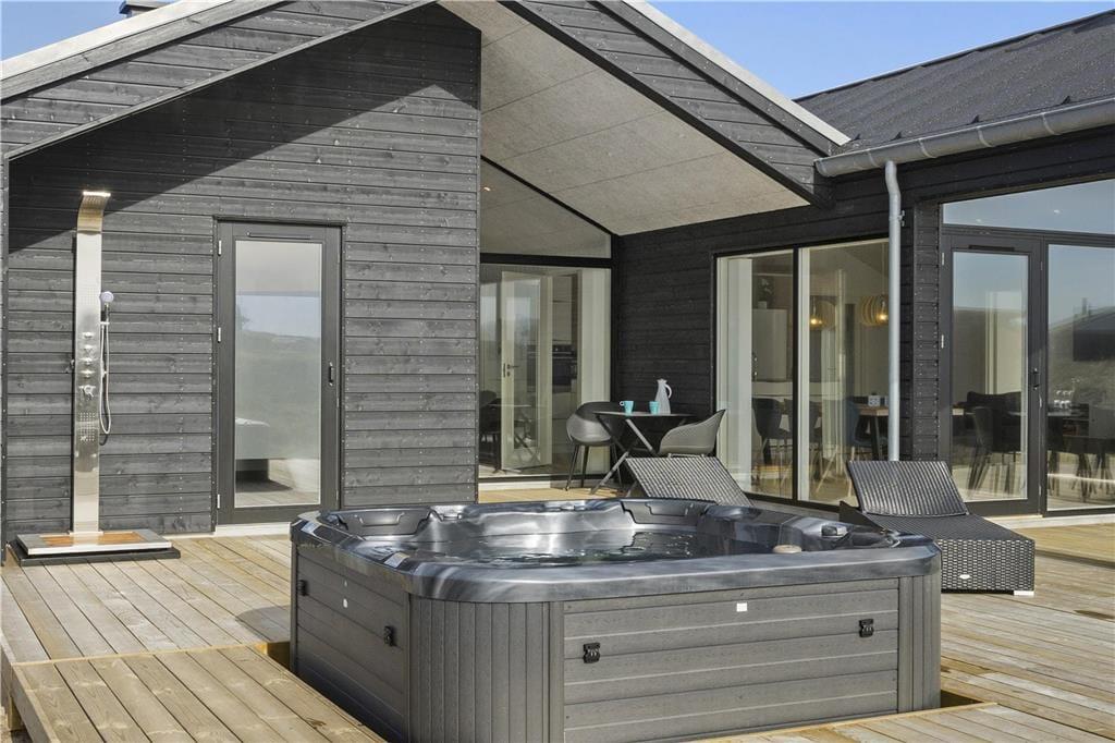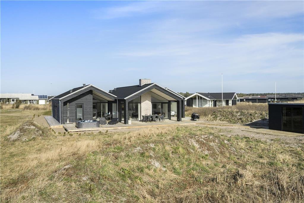 Huset byder på en carport helt oppe ved huset, hvor bilerne kan stå i læ og bagagen let kan løftes ind i huset. Entreen er rummelig med plads til overtøj og fodtøj. Bryggers indeholder vaskemaskine og tørretumbler og herfra er der adgang til et af husets badeværelser. Fra entreen går man direkte ind i et meget stort køkkenalrum med store vinduespartier i gavlen, som sikrer optimalt sollys gennen hele dagen. Huset er smagfuldt indrettet med en hyggelig sofagruppe i forbindelse med den topmoderne brændeovn. Lækkert åbent køkken med stor køkkenø. Spisepladsen er i den anden side af rummet og giver dermed en følelse af rigtig god plads og luft mellem møblerne. Herfra går man ind i de to af soveværelserne, hvor der i begge er direkte udgang til terrassen. I modsatte side ligger aktivitetsrummet, hvor der er TV, spillekonsol samt pool og bordtennis. Dermed er der rig mulighed for at hygge sig trods vejret. Der er en stige som fører op til hemsen, hvor der er tre madrasser. Fra aktivitetsrummet kan man gå ind i de to sidste soveværelser. I aktivitetsrummet står en sofa med plads til 2 personer. herfra også adgang til det store badeværelse som indeholder både bruser samt spa.