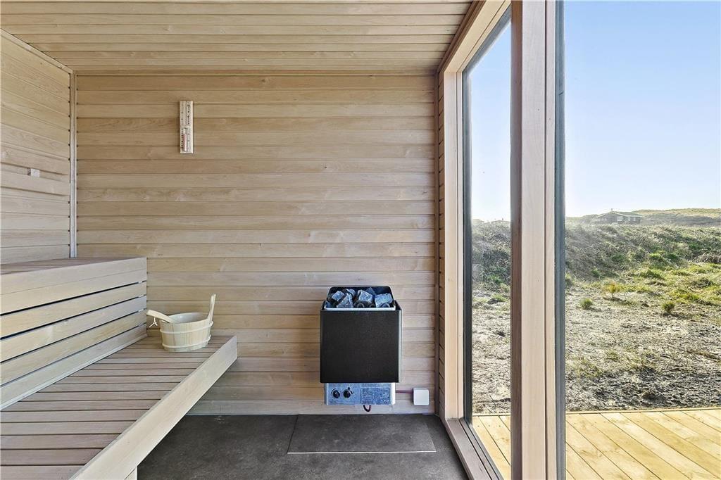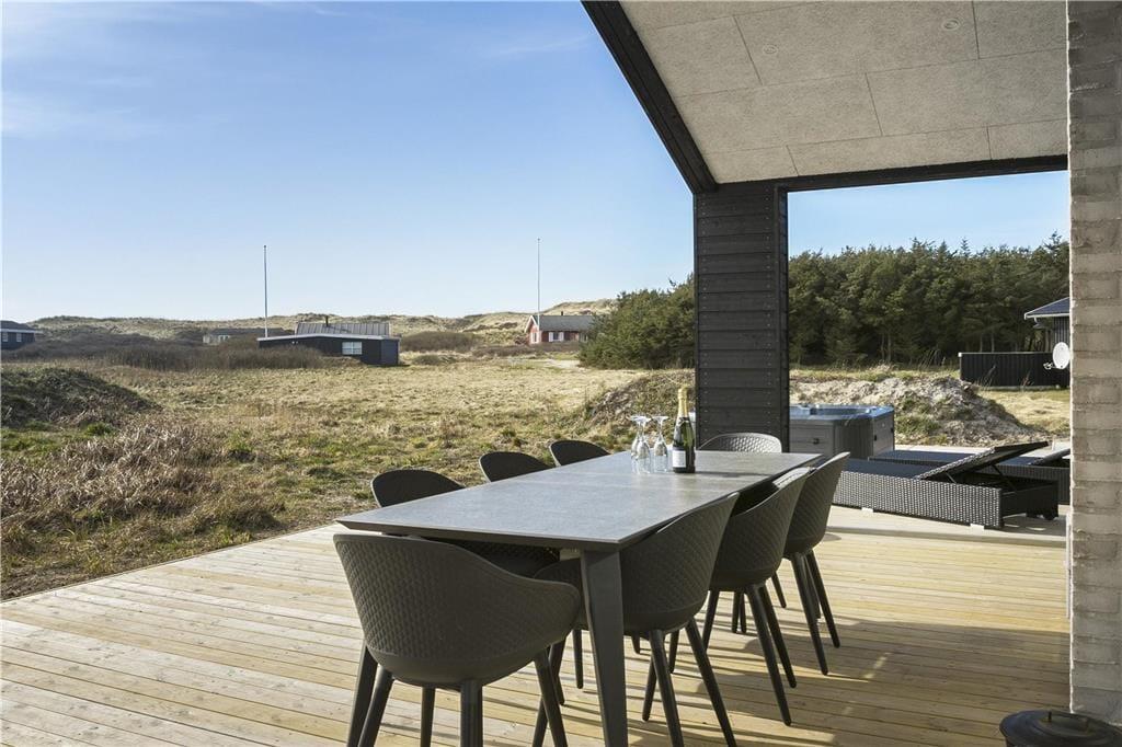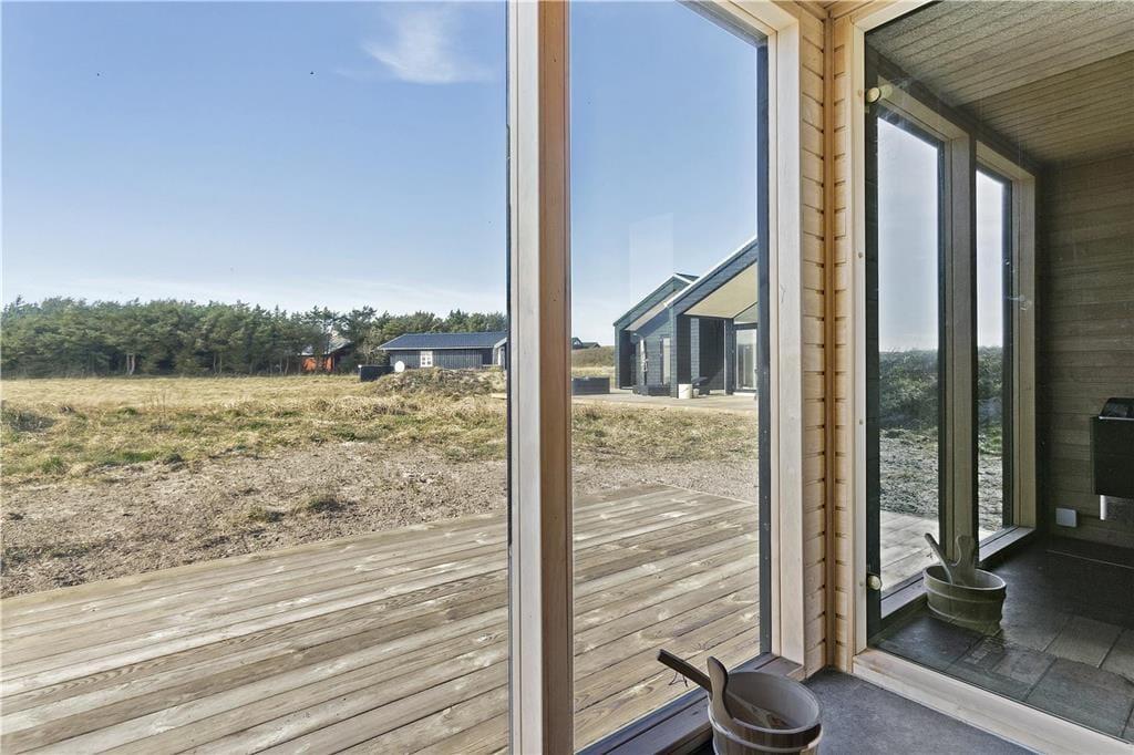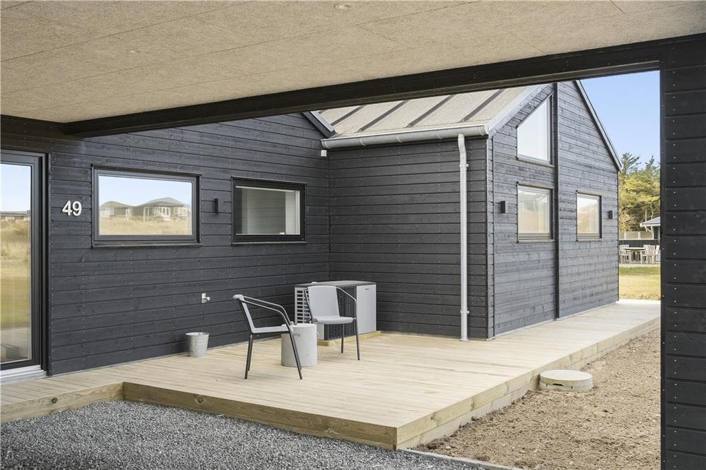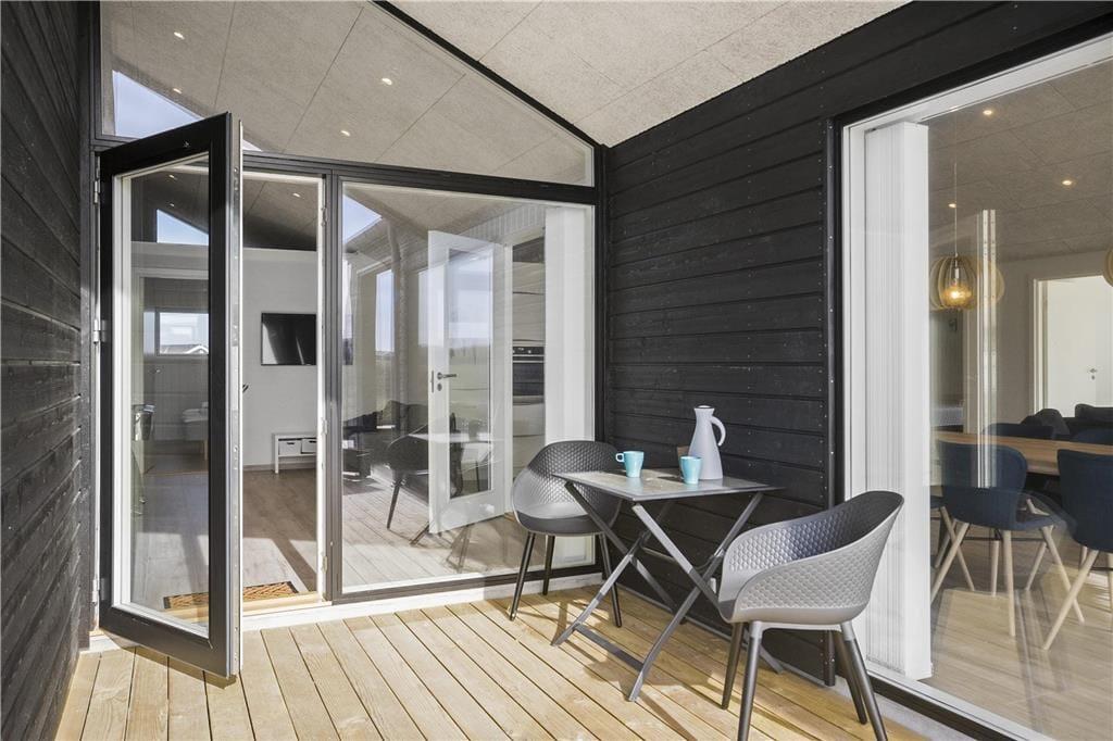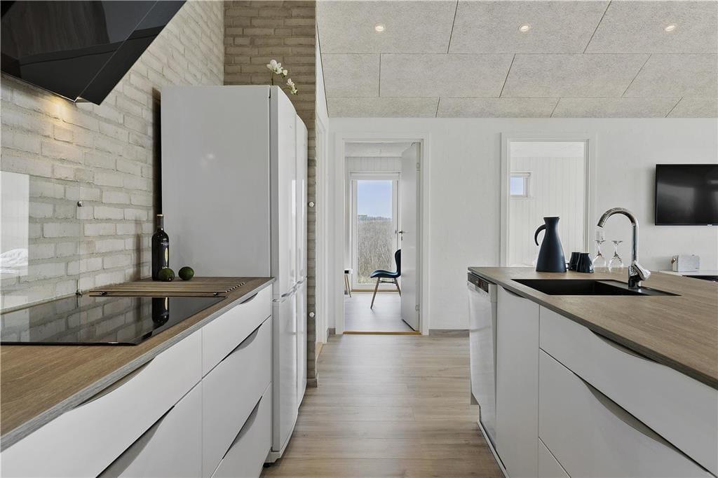 Huset byder på en carport helt oppe ved huset, hvor bilerne kan stå i læ og bagagen let kan løftes ind i huset. Entreen er rummelig med plads til overtøj og fodtøj. Bryggers indeholder vaskemaskine og tørretumbler og herfra er der adgang til et af husets badeværelser. Fra entreen går man direkte ind i et meget stort køkkenalrum med store vinduespartier i gavlen, som sikrer optimalt sollys gennen hele dagen. Huset er smagfuldt indrettet med en hyggelig sofagruppe i forbindelse med den topmoderne brændeovn. Lækkert åbent køkken med stor køkkenø. Spisepladsen er i den anden side af rummet og giver dermed en følelse af rigtig god plads og luft mellem møblerne. Herfra går man ind i de to af soveværelserne, hvor der i begge er direkte udgang til terrassen. I modsatte side ligger aktivitetsrummet, hvor der er TV, spillekonsol samt pool og bordtennis. Dermed er der rig mulighed for at hygge sig trods vejret. Der er en stige som fører op til hemsen, hvor der er tre madrasser. Fra aktivitetsrummet kan man gå ind i de to sidste soveværelser. I aktivitetsrummet står en sofa med plads til 2 personer. herfra også adgang til det store badeværelse som indeholder både bruser samt spa.