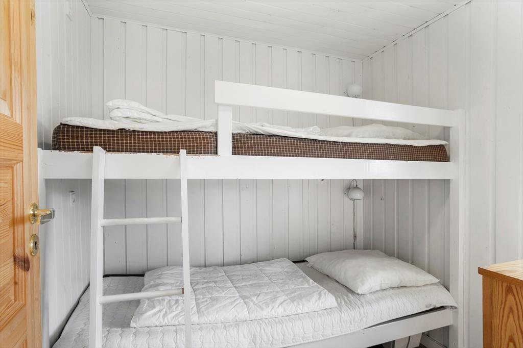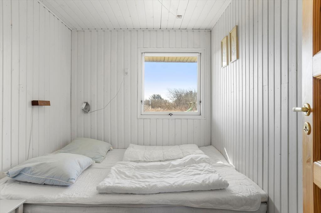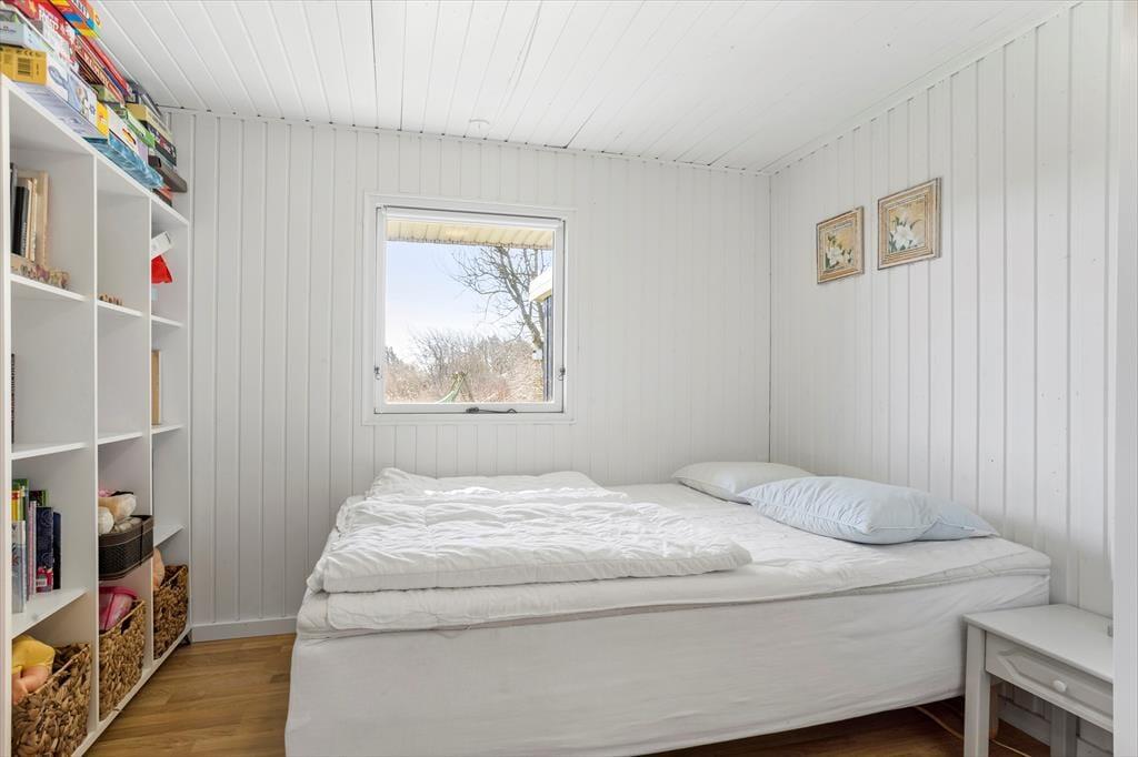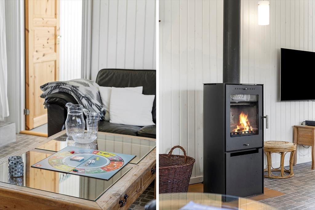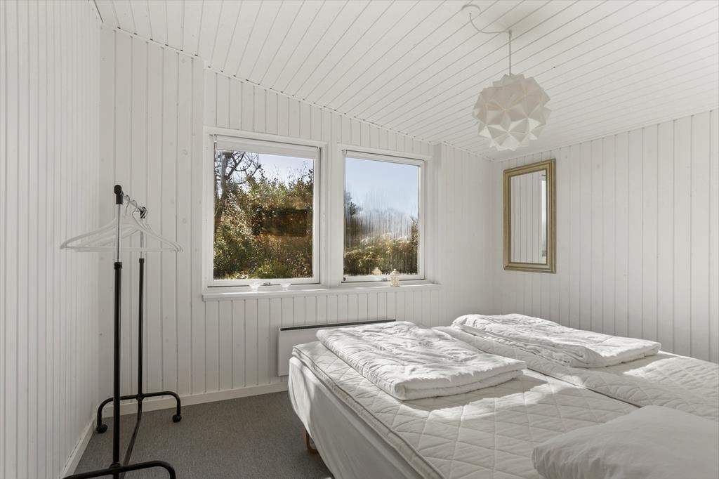 Her er tale om et ”rigtigt” sommerhus med sortmalet træfacade og hvide vinduesrammer, der står i flot kontrast til alt det grønne i haven. Her er idyllen nærmest perfekt. Huset er særdeles velindrettet, og ferieturens hyggelige samvær får de bedste betingelser. Det halvåbne køkken ligger i forbindelse med en spisestue, og herudover får I en god opholdsstue med brændeovn. Soverum er der fire af – tre med dobbeltseng og et med køjesenge. Endelig er der to badeværelser, hvoraf det ene er udstyret med badekar og det andet med brus.
