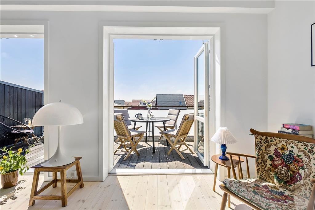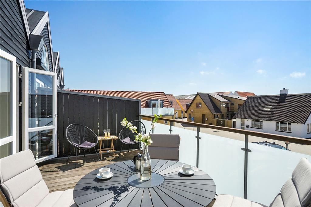 Den store terrasse er uden tvivl en af lejlighedens helt store kvaliteter. Her får I et skønt uderum, hvor I kan sætte jer godt til rette i havemøblerne med morgenens første kop kaffe eller en kølig drink, når dagen går på hæld. Her mærker man både det summende ferieliv i Løkken og den friske havluft fra stranden, der blot ligger få hundrede meter væk.